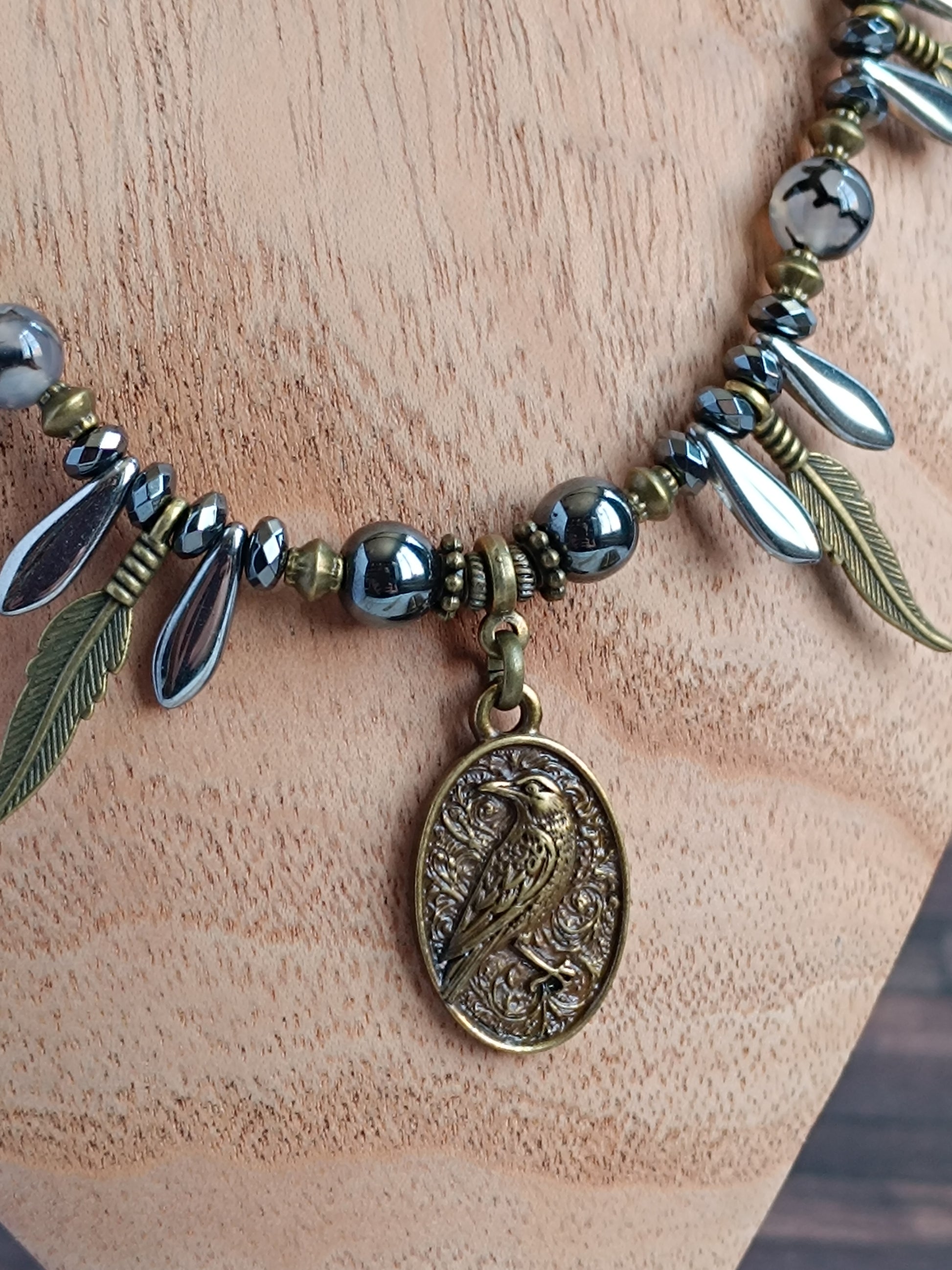 Pensé pour les passionnées de récits anciens, ce collier se porte comme un véritable talisman. Le corbeau, figure de transformation et de clairvoyance, veille au centre, entouré de pierres aux reflets lunaires et de plumes dansantes.