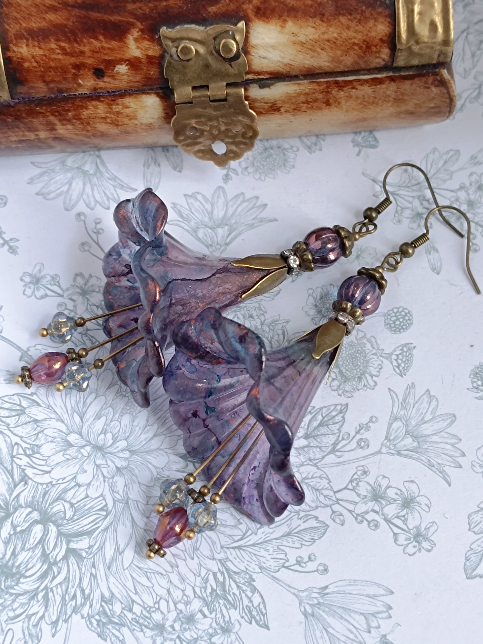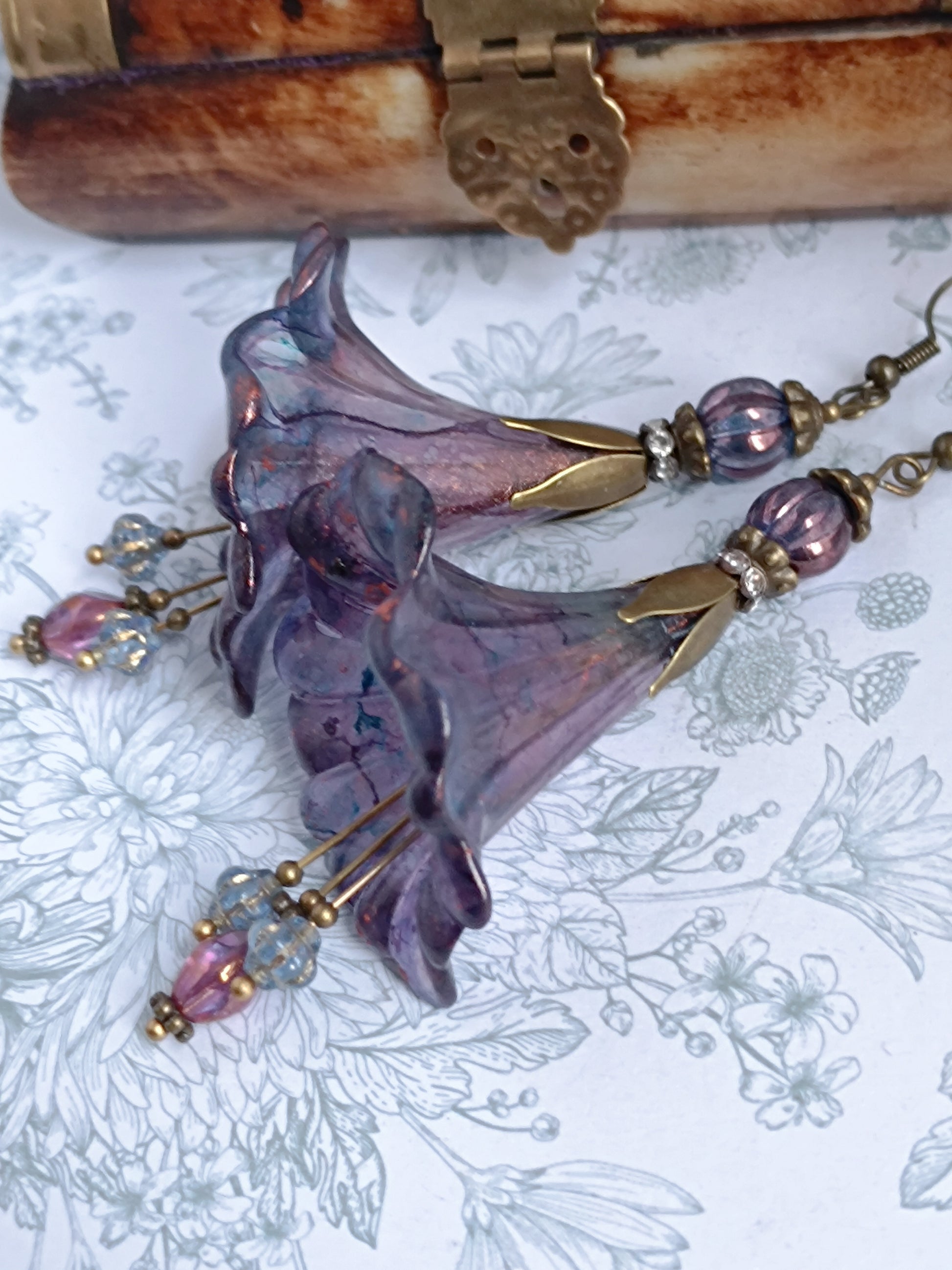 Chaque paire est unique : les fleurs en lucite, peintes à la main, peuvent présenter de subtiles variations. Ces modèles étant également proposés dans d'autres boutiques, la fleur reçue peut différer légèrement de celle présentée en photo. Toutefois, les perles de verre, le montage, la palette de couleurs et l'harmonie générale restent strictement identiques, garantissant la même esthétique et le même esprit poétique.