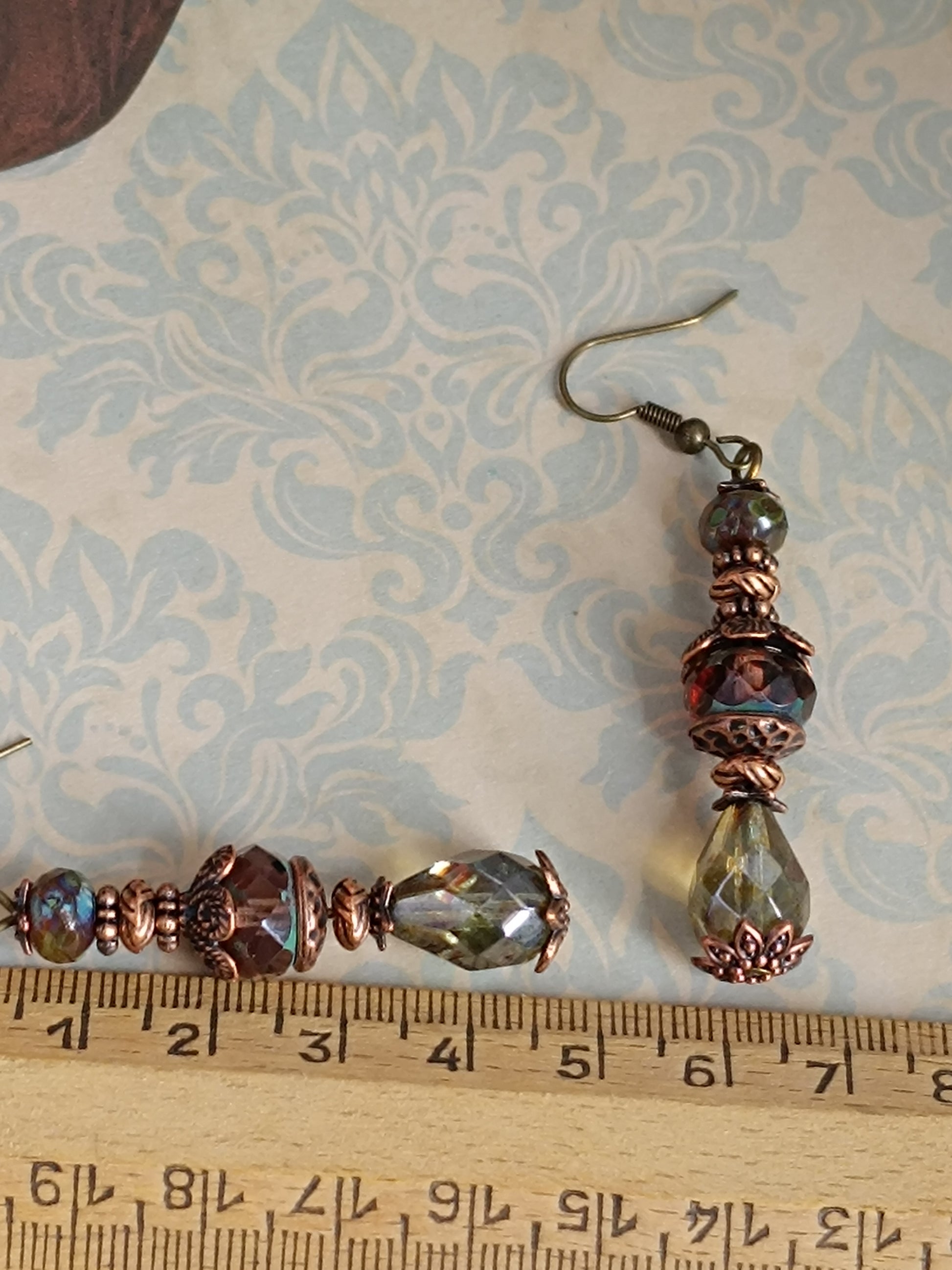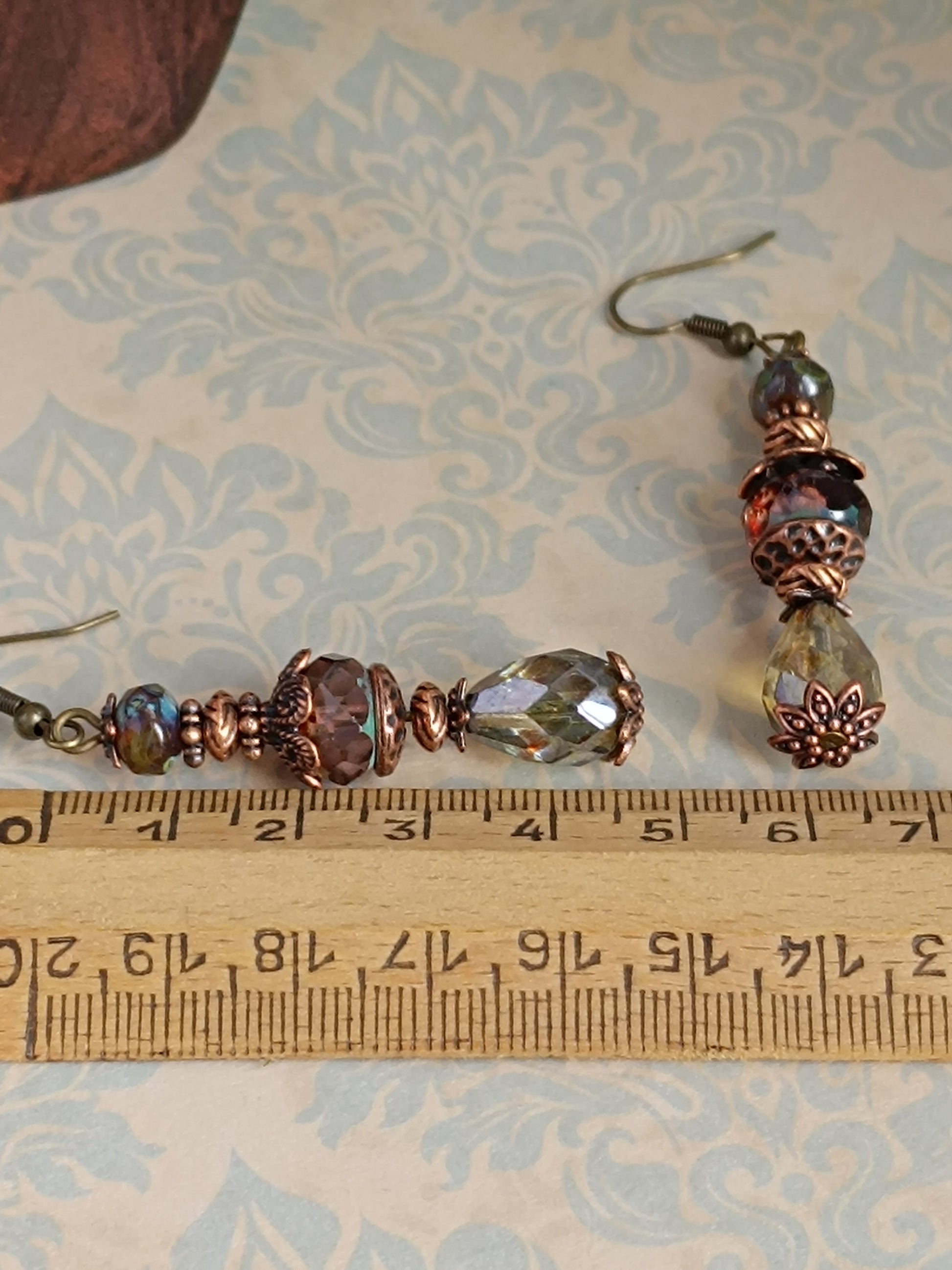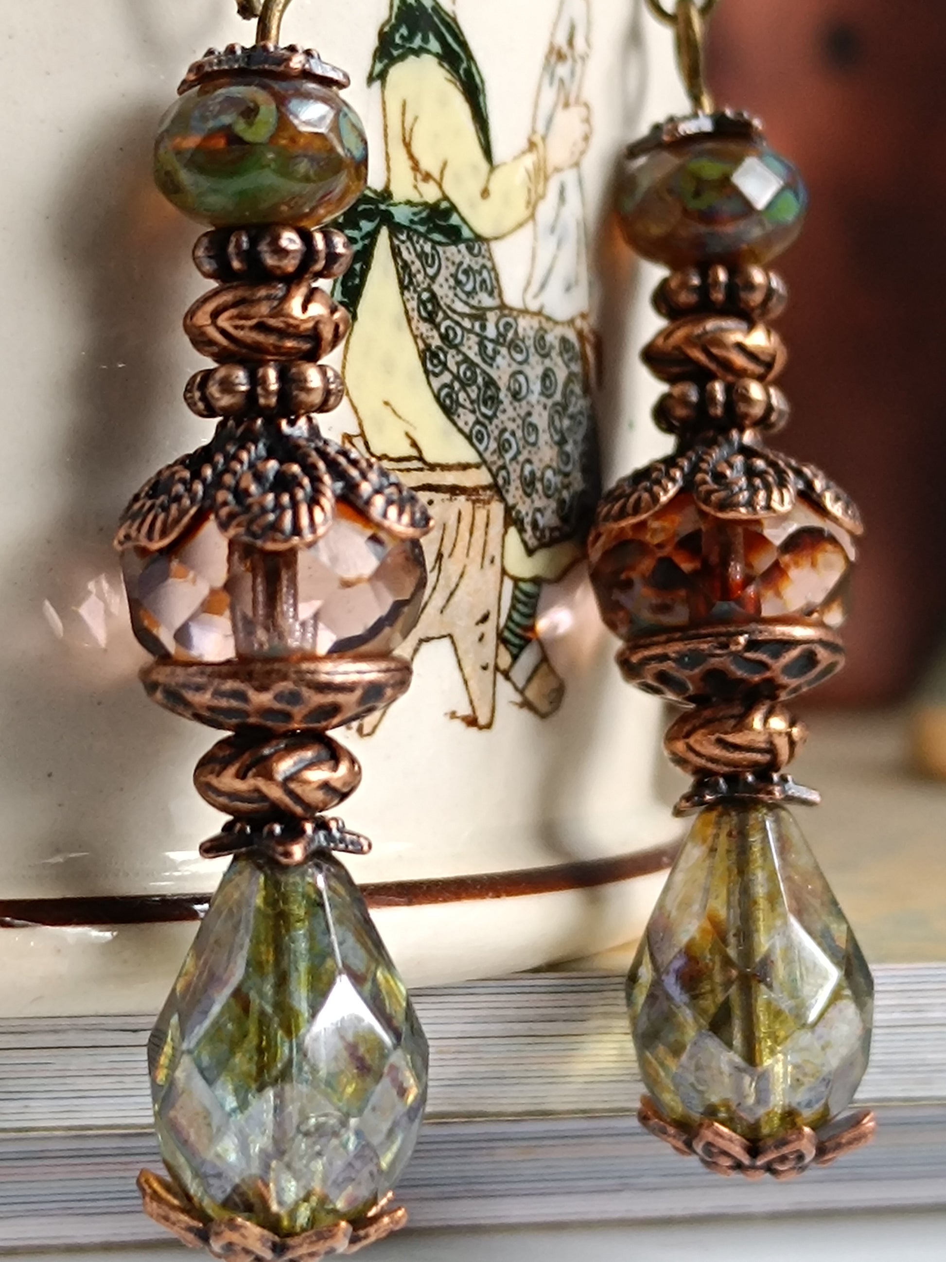 Boucles d'oreilles pendantes artisanales , Verre tchèque Picasso, perles facettées roses & métal bronze/cuivre filigrané 💫