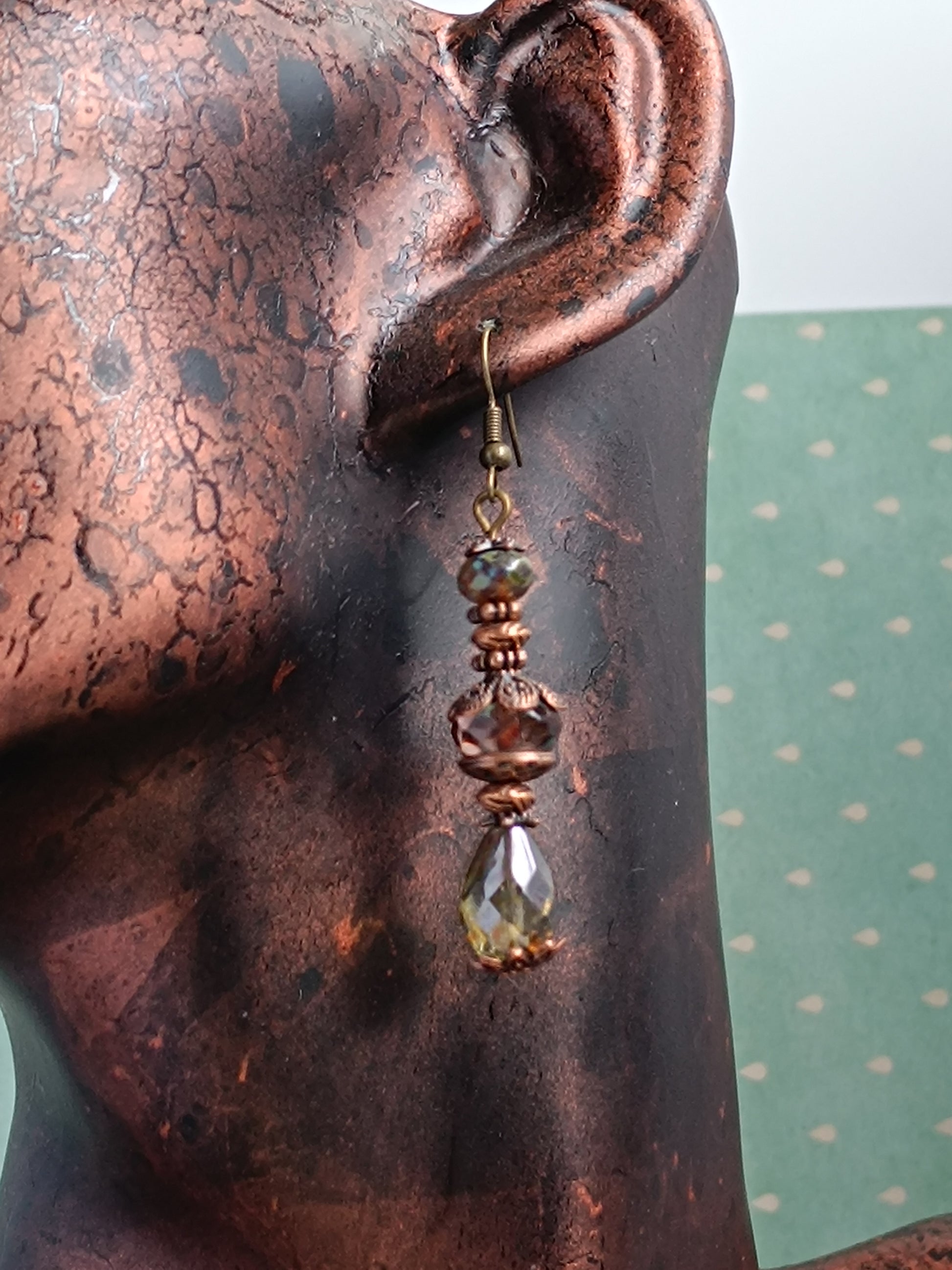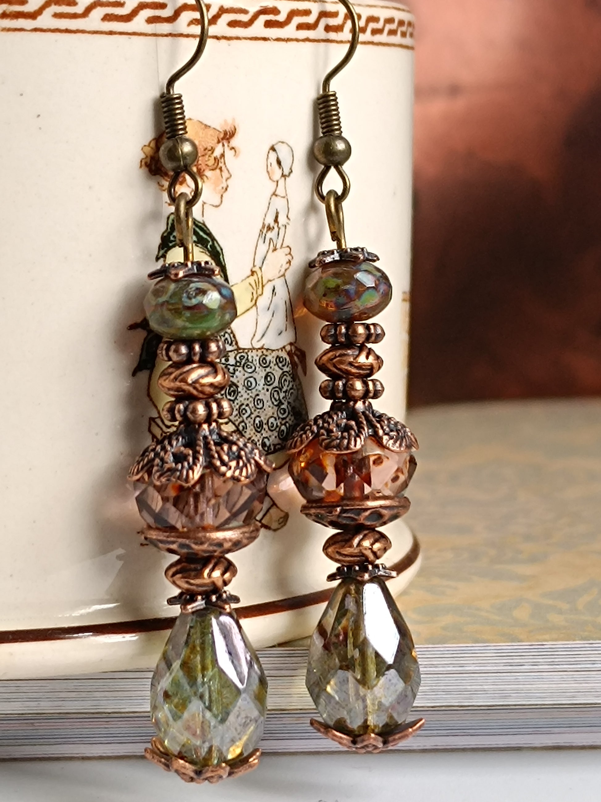 Les facettes captent la lumière à chaque mouvement, révélant des nuances de rose poudré, ambre doré et vert mousse. Le style vintage est sublimé par des perles en métal ajouré, comme des dentelles anciennes suspendues dans le temps.