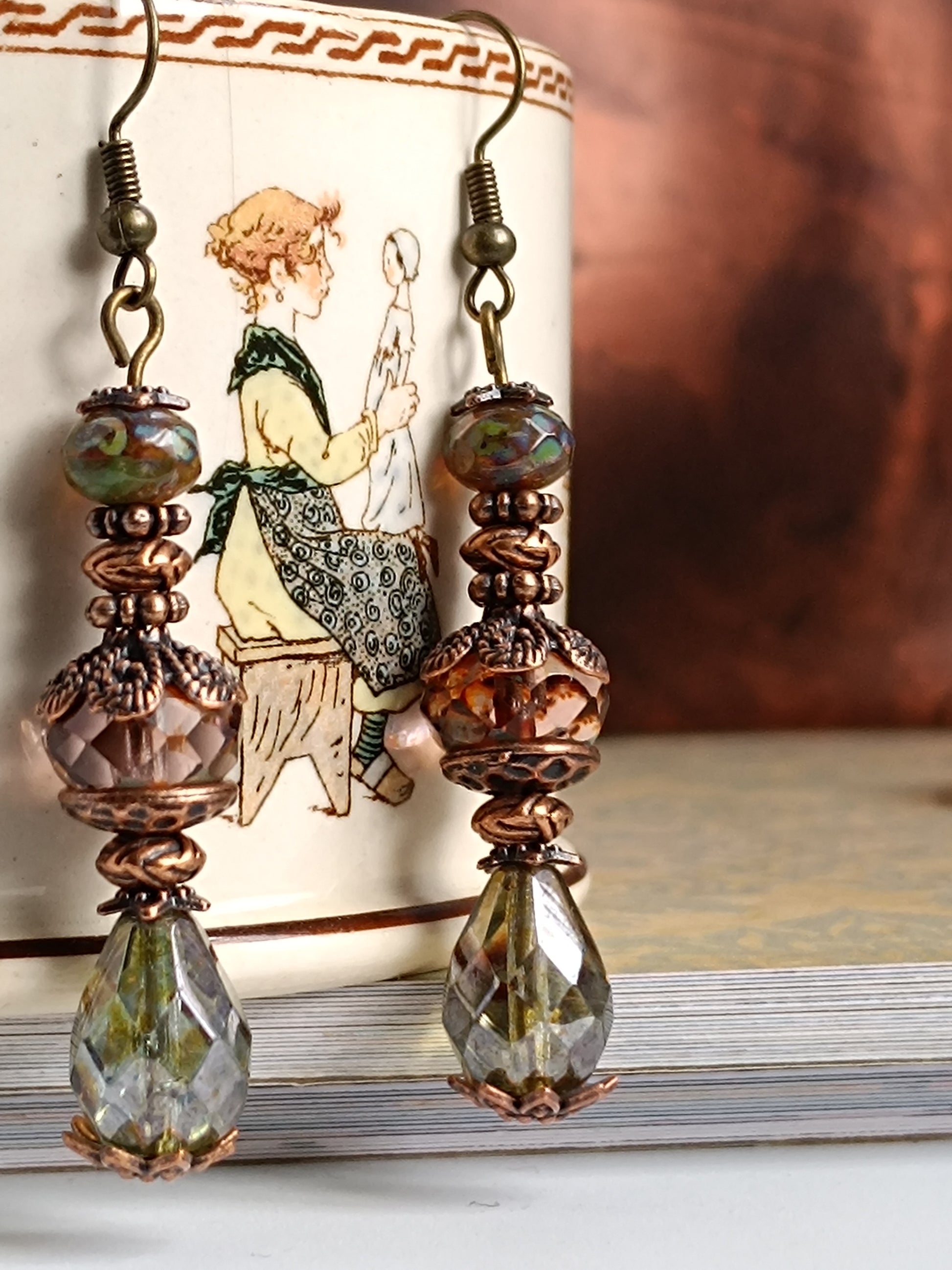 Laissez-vous envoûter par cette création romantique et lumineuse, où chaque détail raconte une histoire. Ces boucles d'oreilles pendantes faites main marient avec grâce des perles de verre tchèque Picasso aux reflets mystiques, des perles facettées roses tendres et éclatantes, et des éléments en métal bronze et cuivre finement travaillés en filigrane.