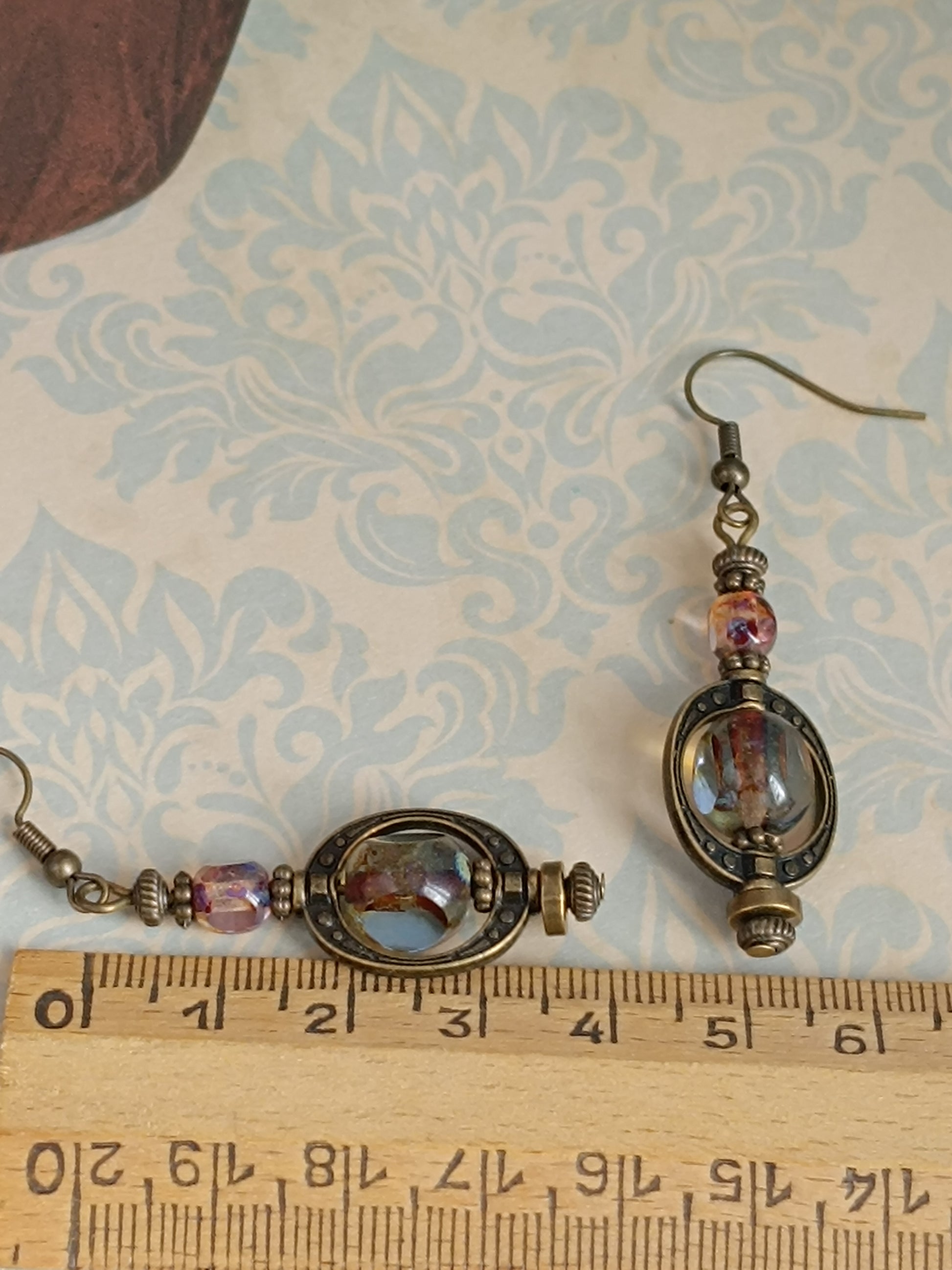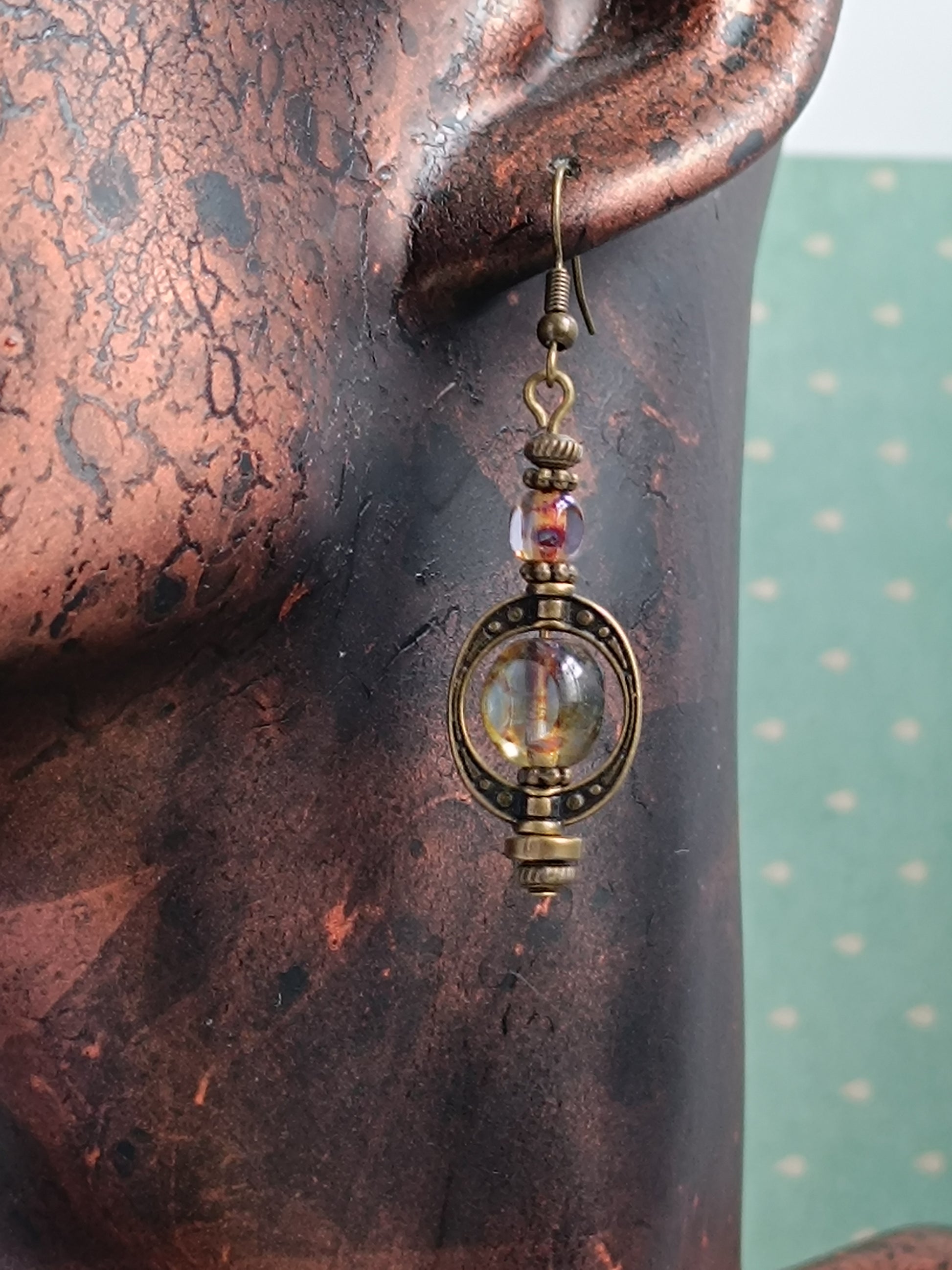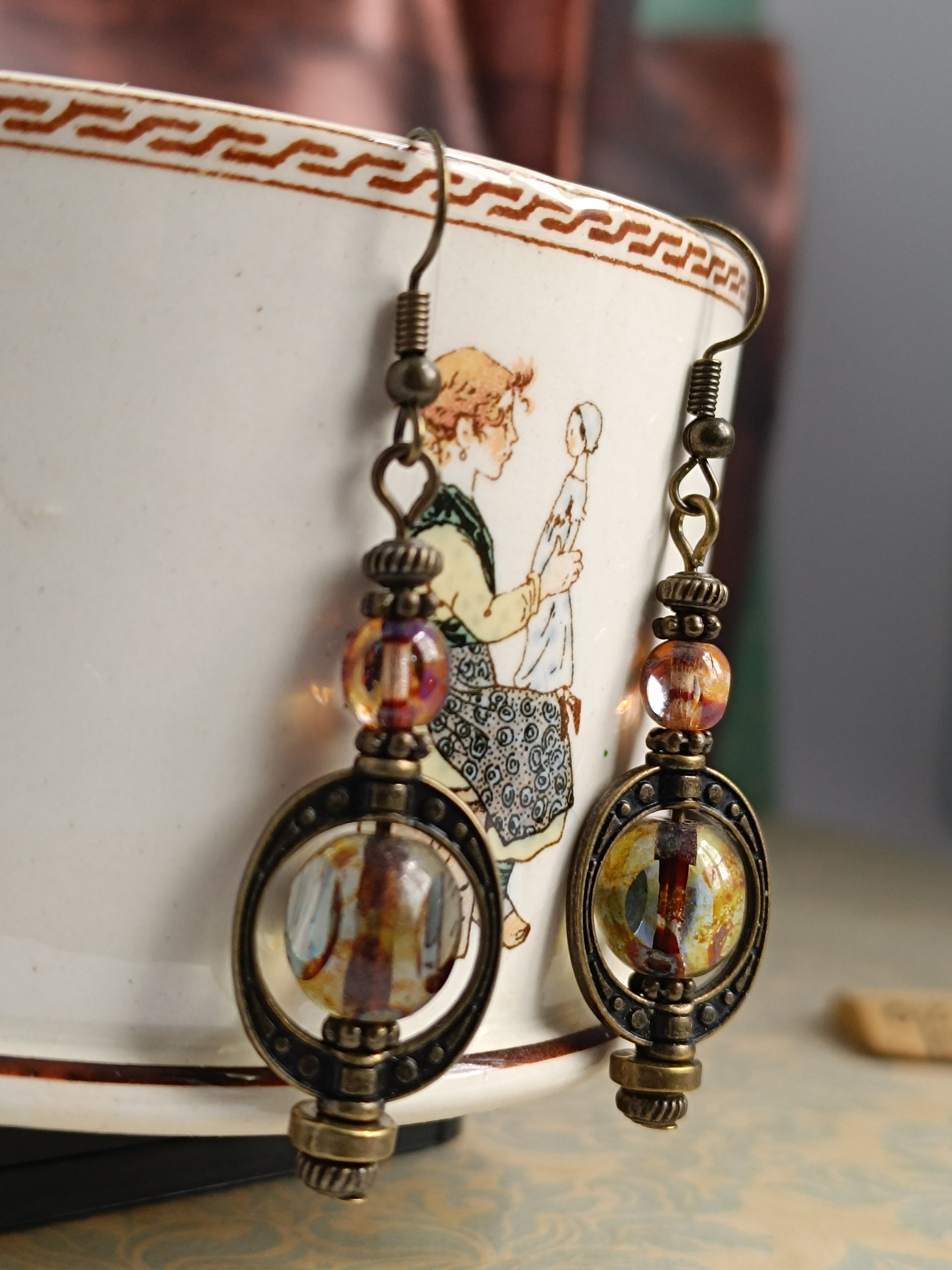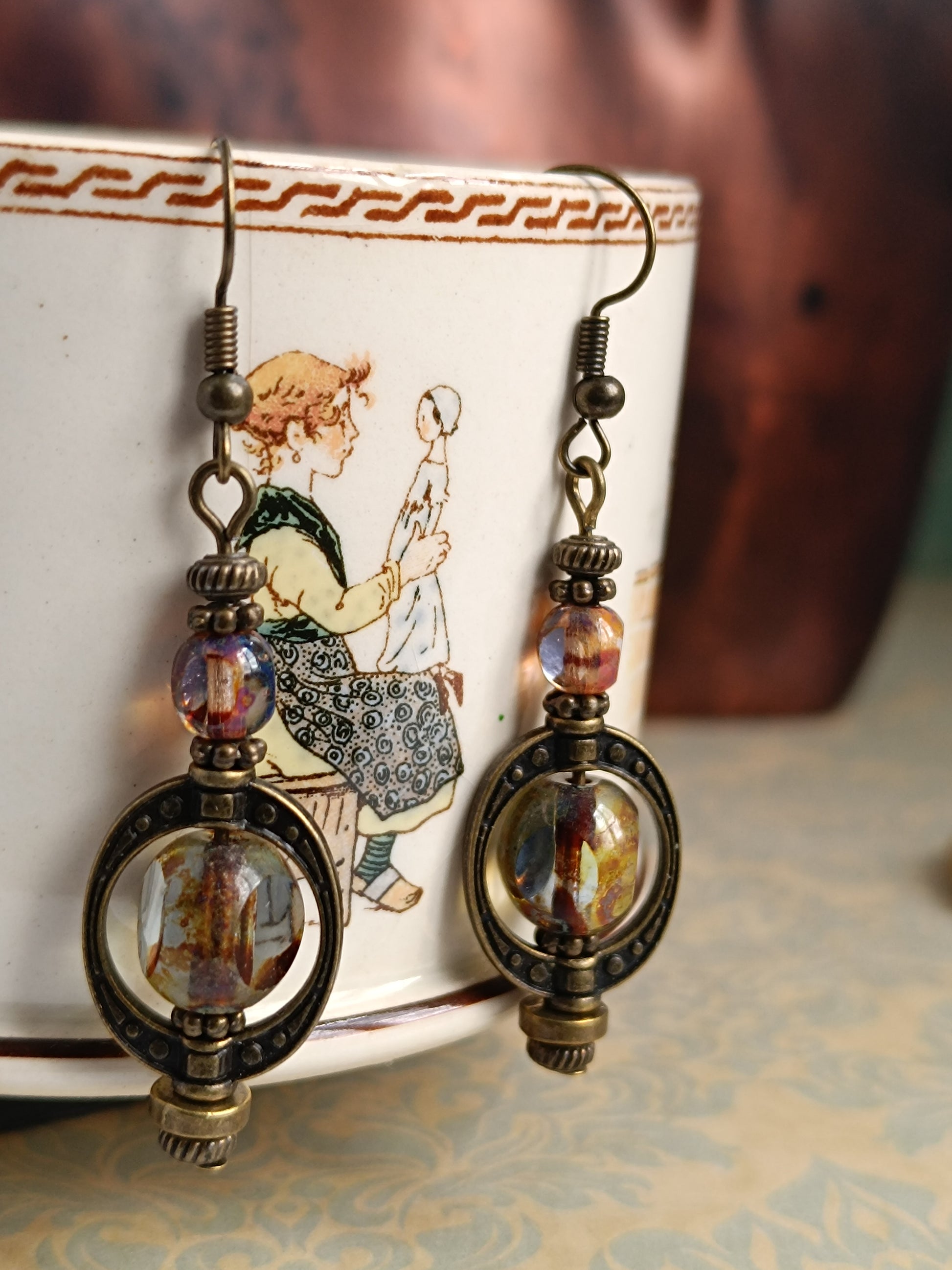 Découvrez ces magnifiques boucles d'oreilles pendantes bohème ornées de perles de verre tchèque aux reflets chatoyants. Elles portent le nom "Saturne" car elles disposent d'un cadre en métal dans lequel la perle centrale tourne librement, rappelant les anneaux de la planète Saturne. Ces perles modernes tout en restant dans un style vintage chic offrent de belles couleurs raffinées qui captent la lumière de façon unique. Montées sur métal couleur bronze, elles s'harmonisent parfaitement avec le style intemporel de la collection. Chaque pièce est réalisée à la main, ce qui rend chaque création absolument unique.