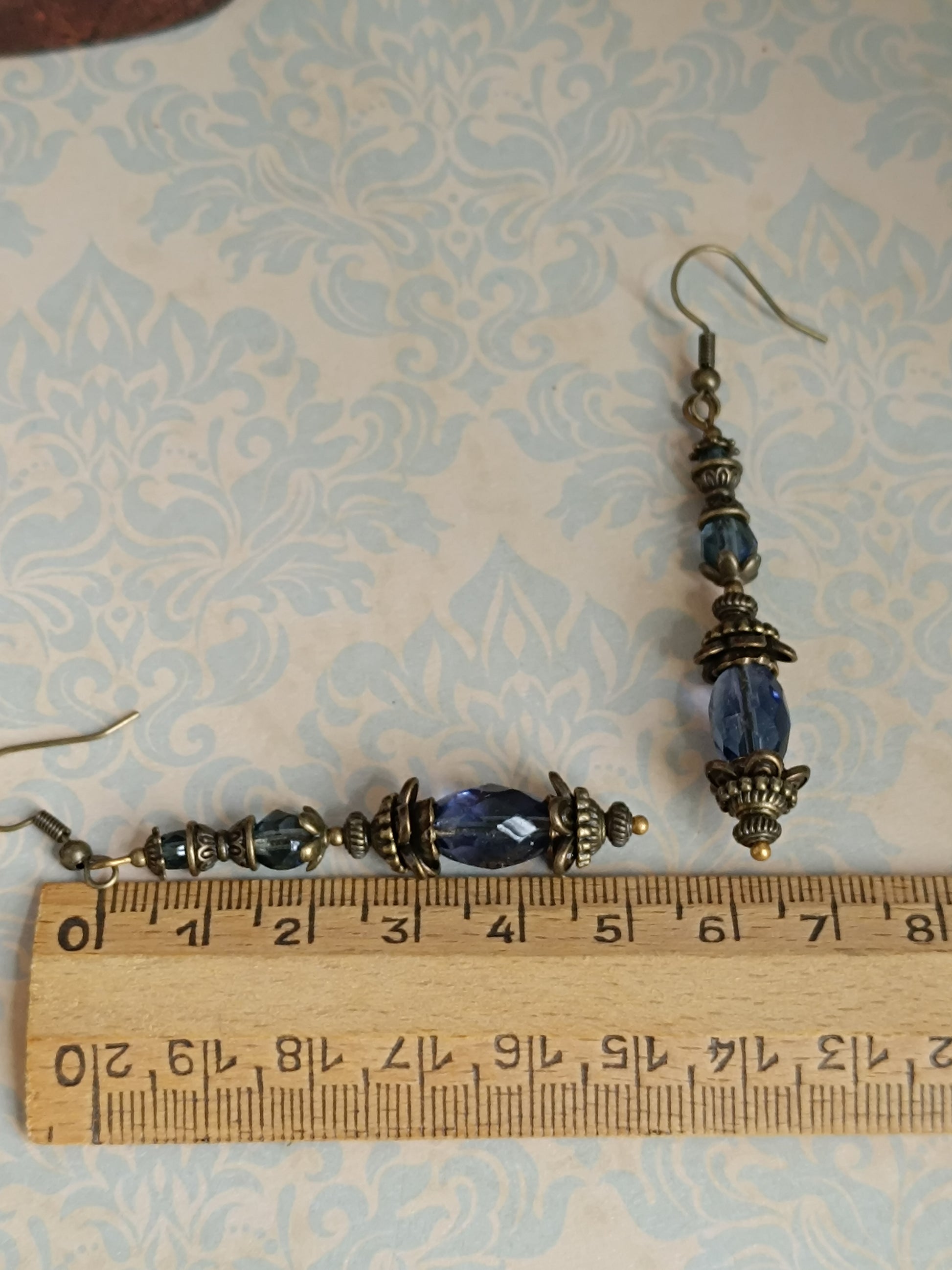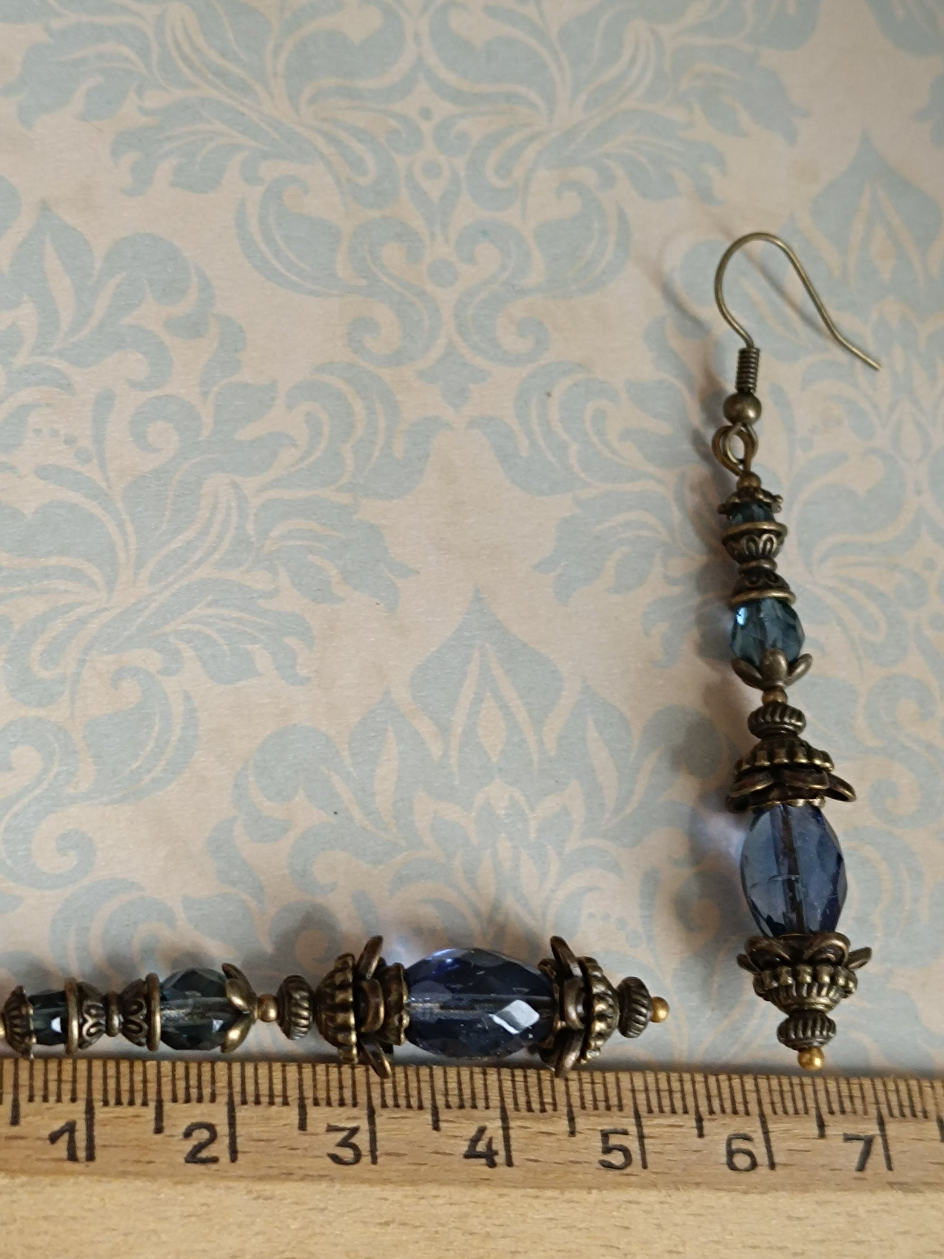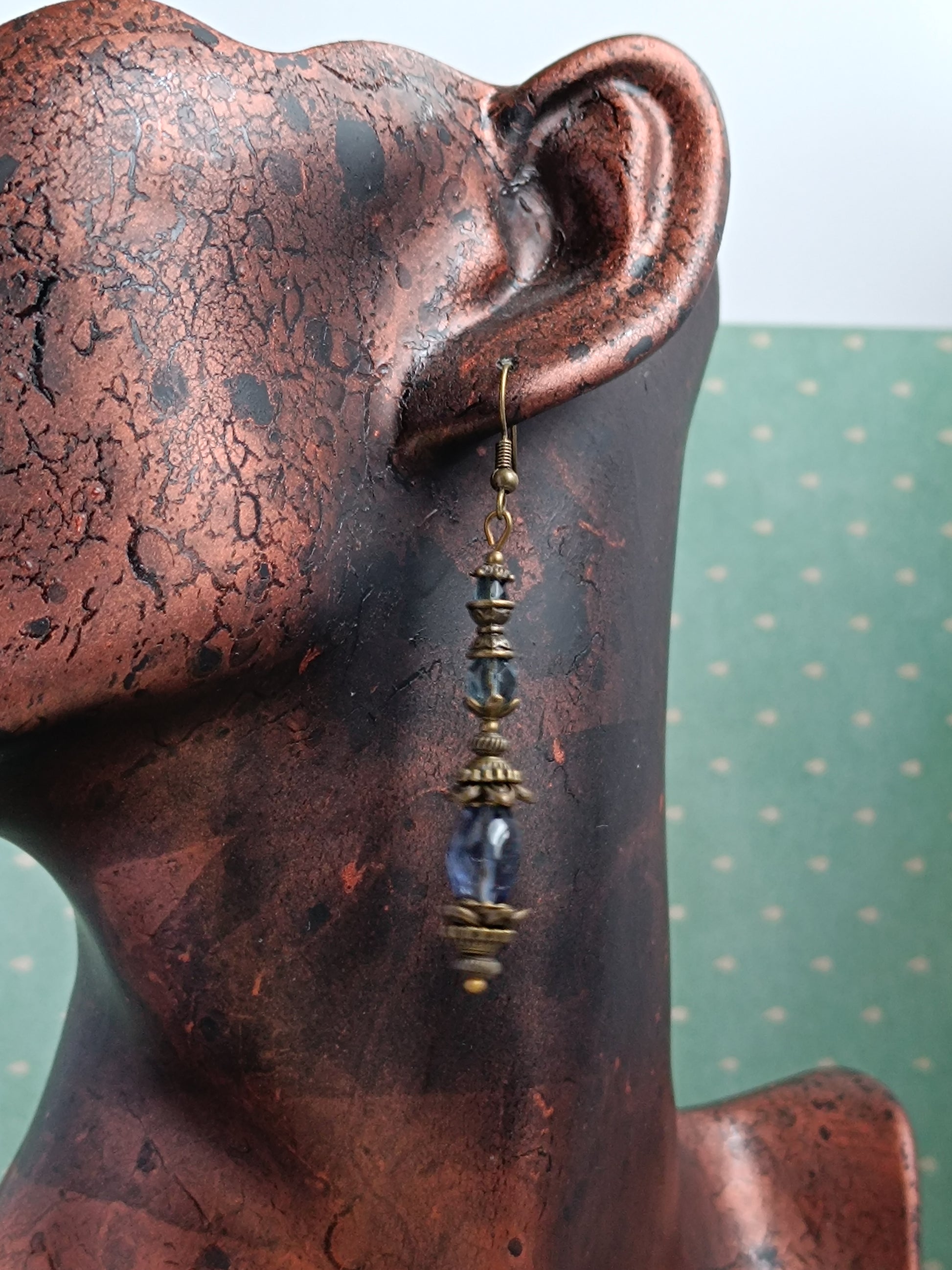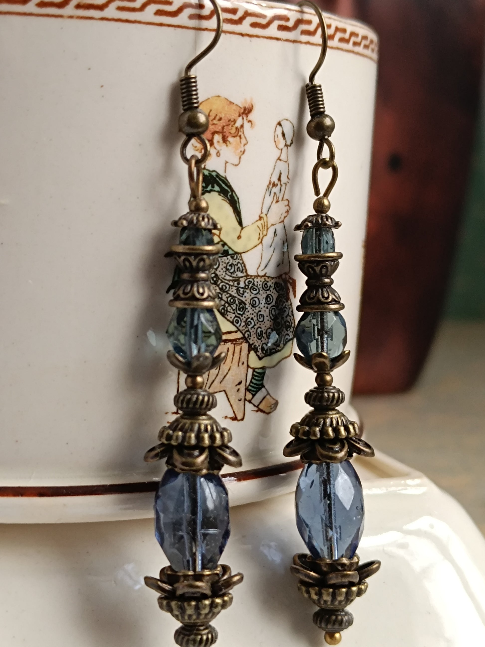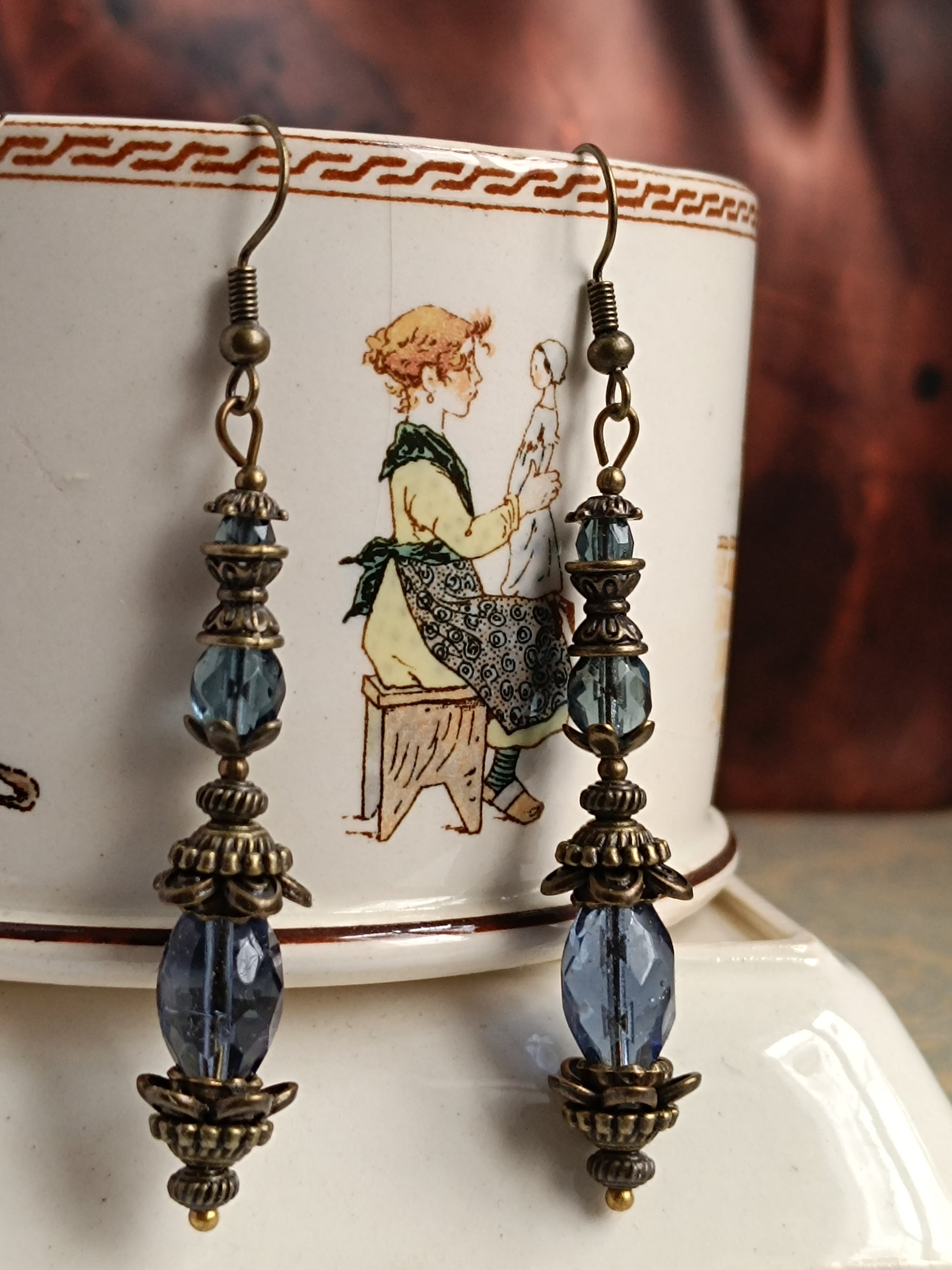 Ces boucles d'oreilles pendantes rendent hommage à la femme qui aime le style vintage avec une sophistication intemporelle. Les perles de verre tchèque à facettes Montana, dans leurs sublimes tons bleu-gris, capturent et reflètent la lumière dans un jeu d'éclats subtils qui illuminent délicatement votre visage. Leur couleur unique évoque la profondeur du ciel d'orage et la sérénité des pierres précieuses.