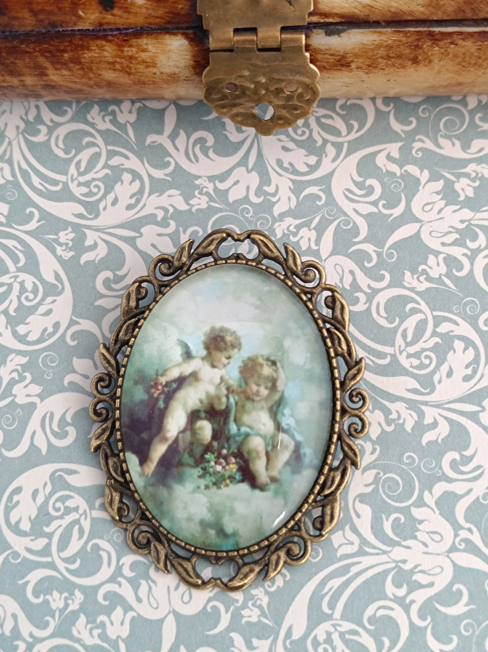 Cette broche représente deux angelots dans un décor de nuages. Son design raffiné et son illustration inspirée de l’art classique en font un accessoire plein de douceur et de charme.