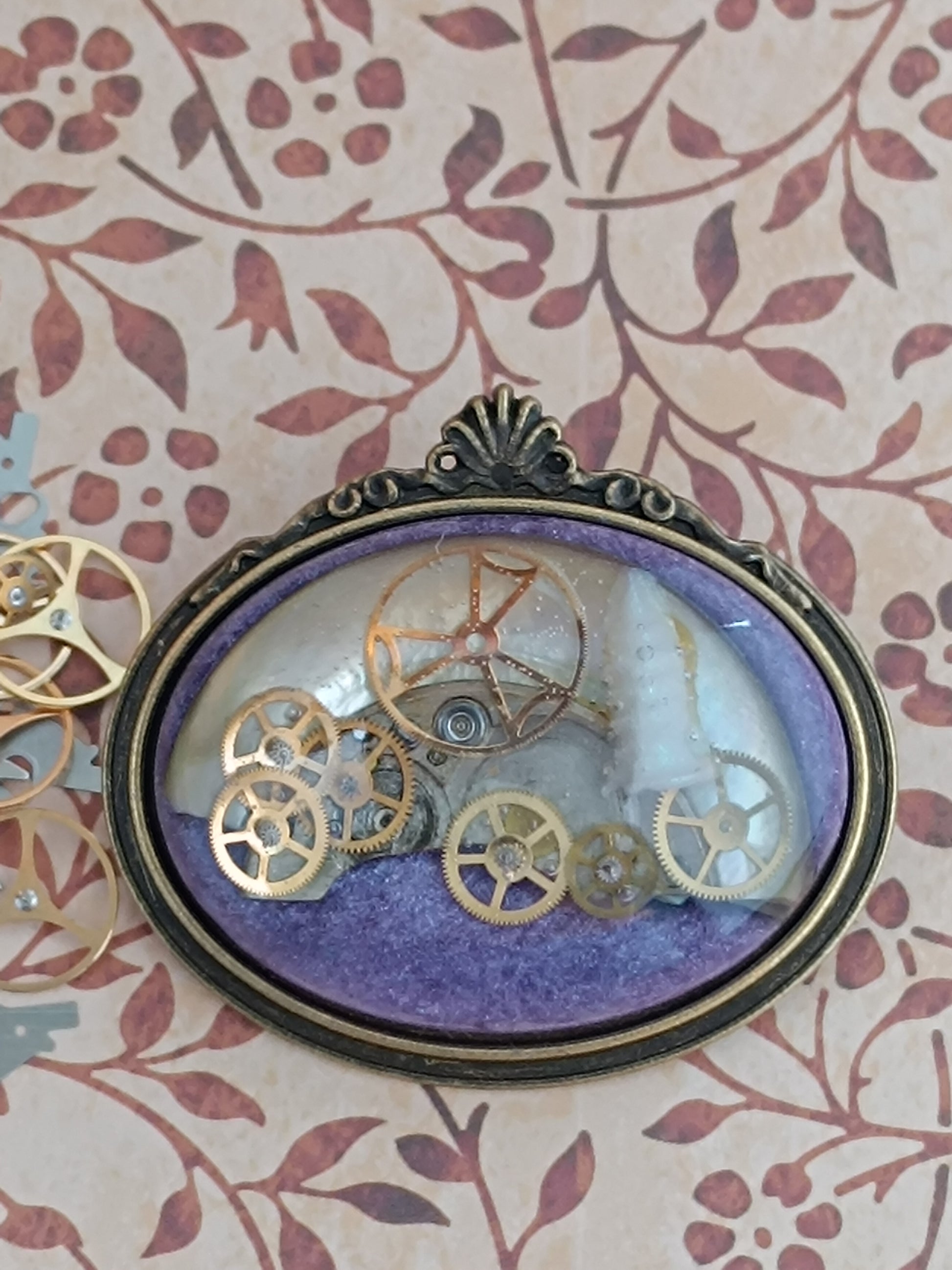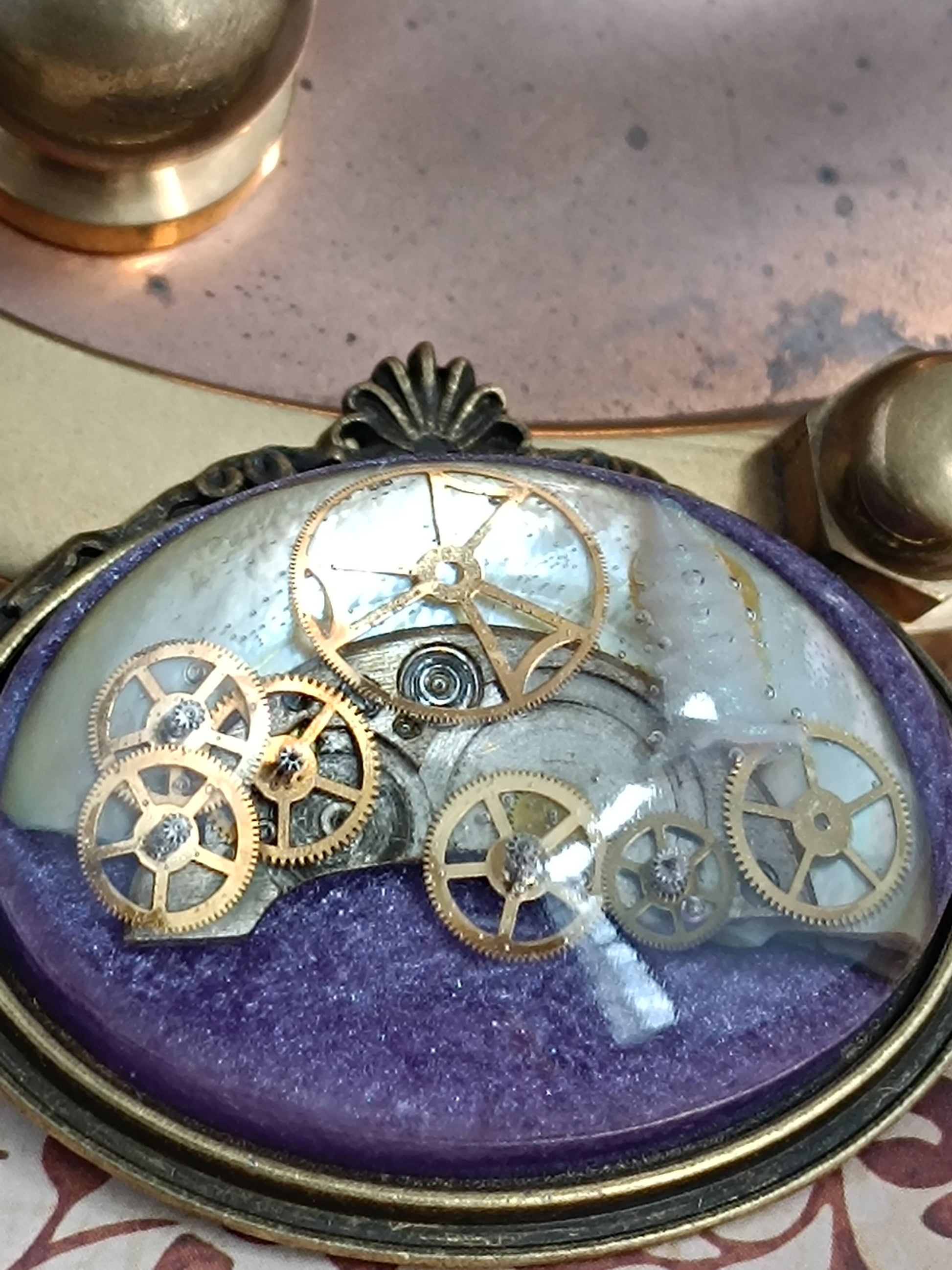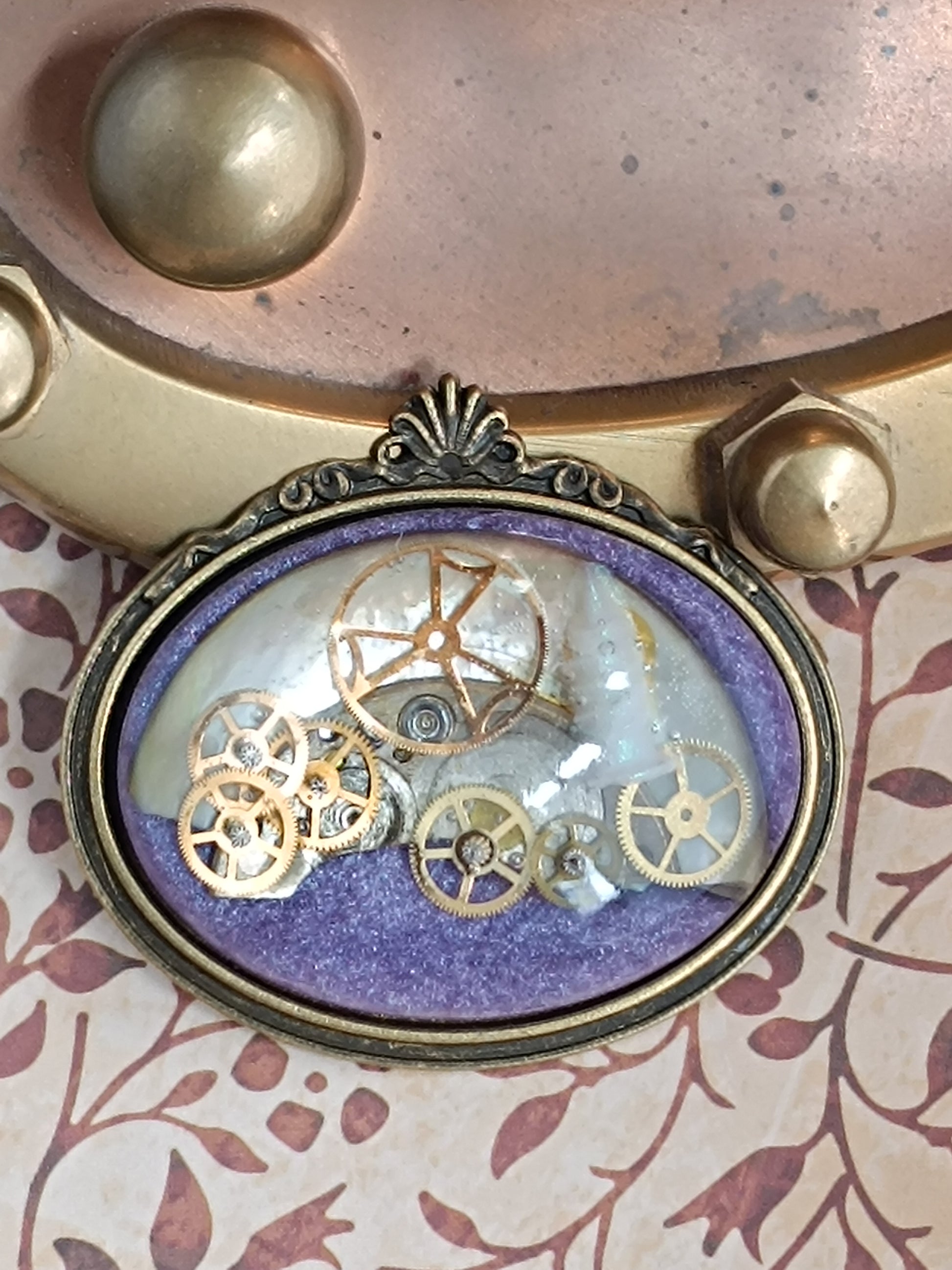 Broche Steampunk Cabochon Horizontal – Résine Époxy, Fond Violet, Engrenages Authentiques & Nacre Vintage