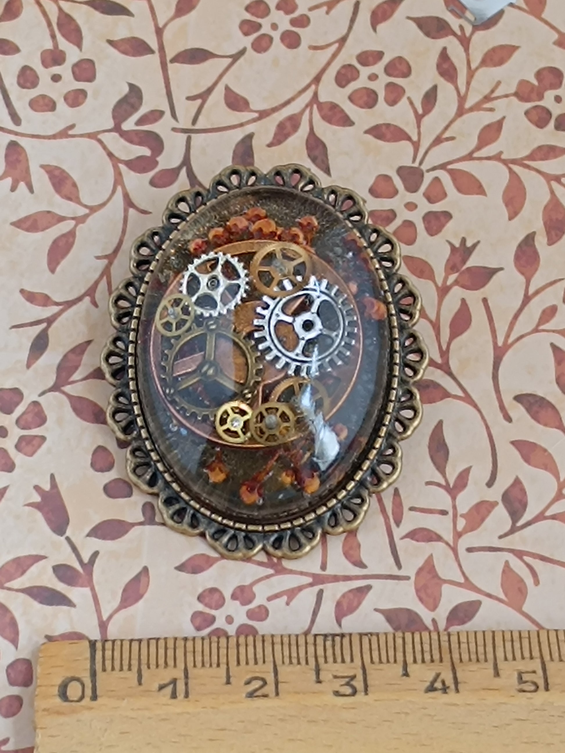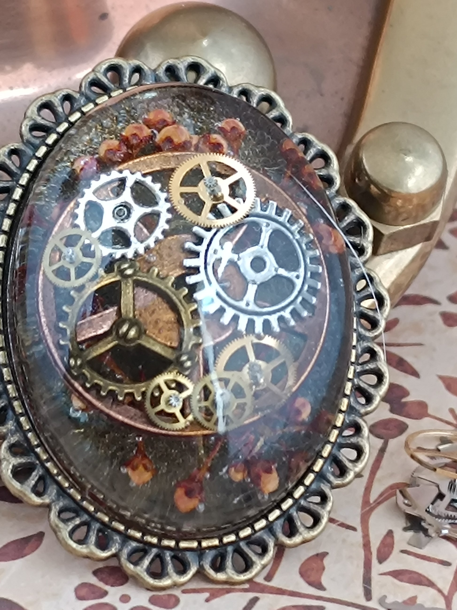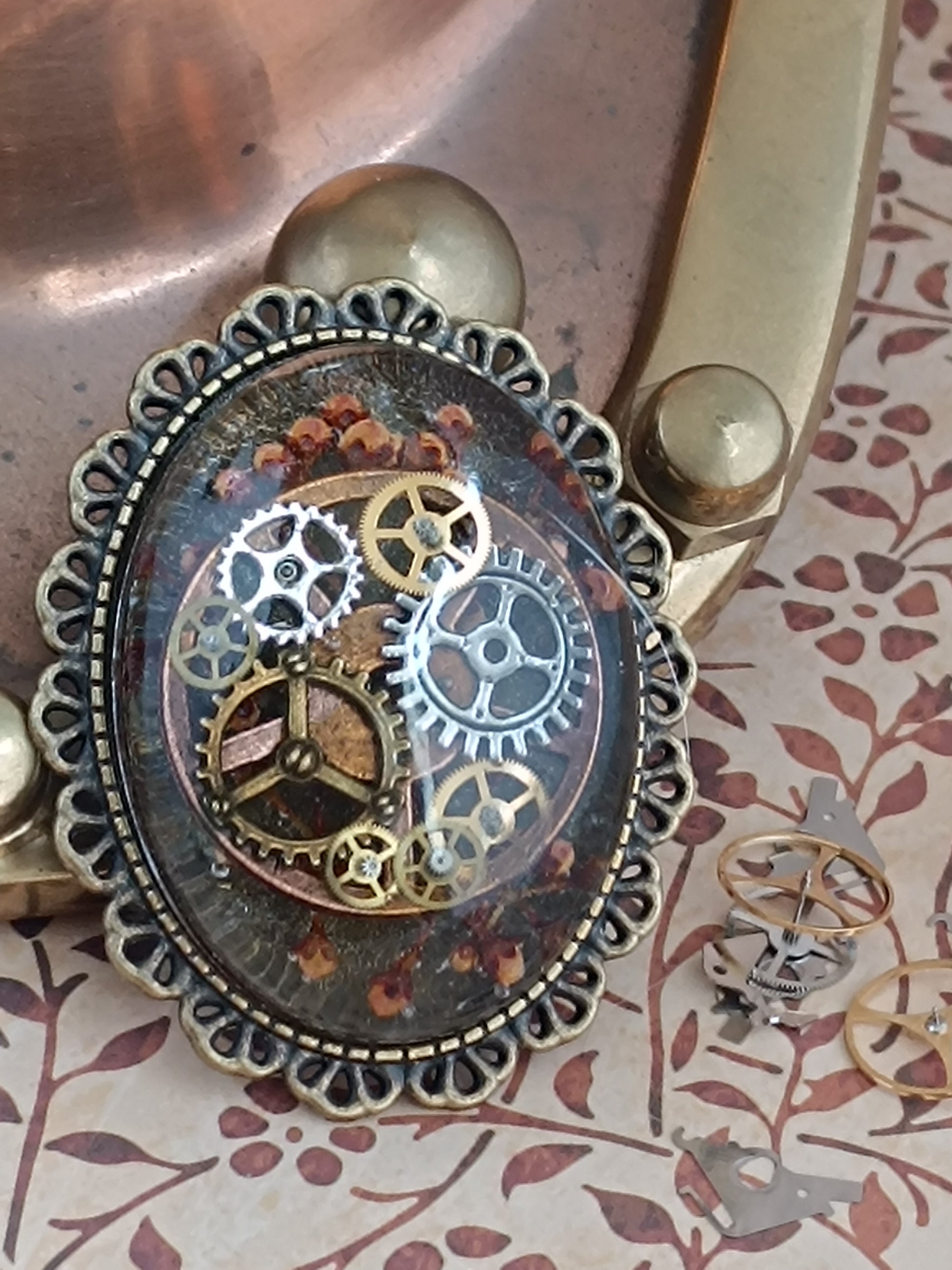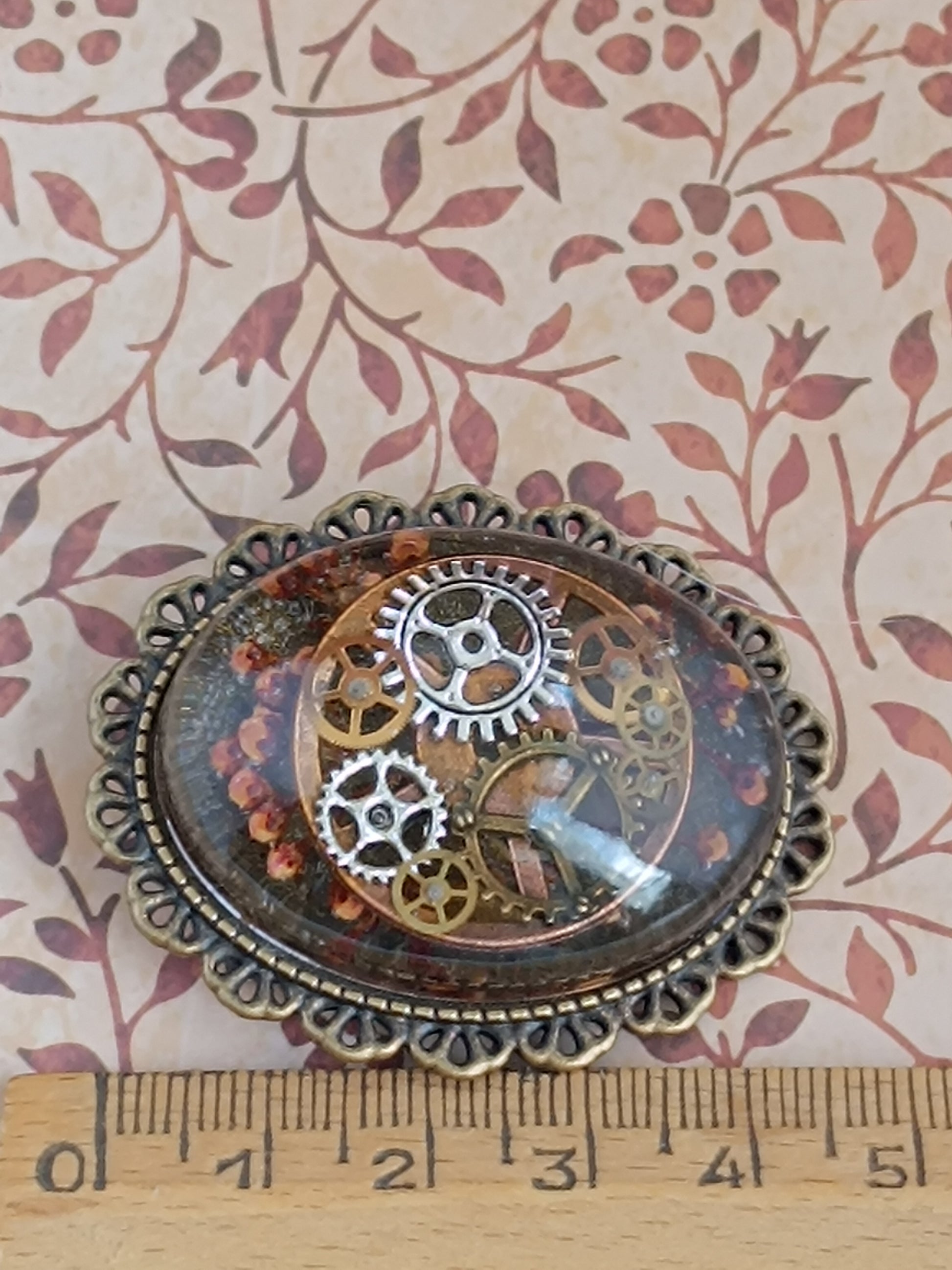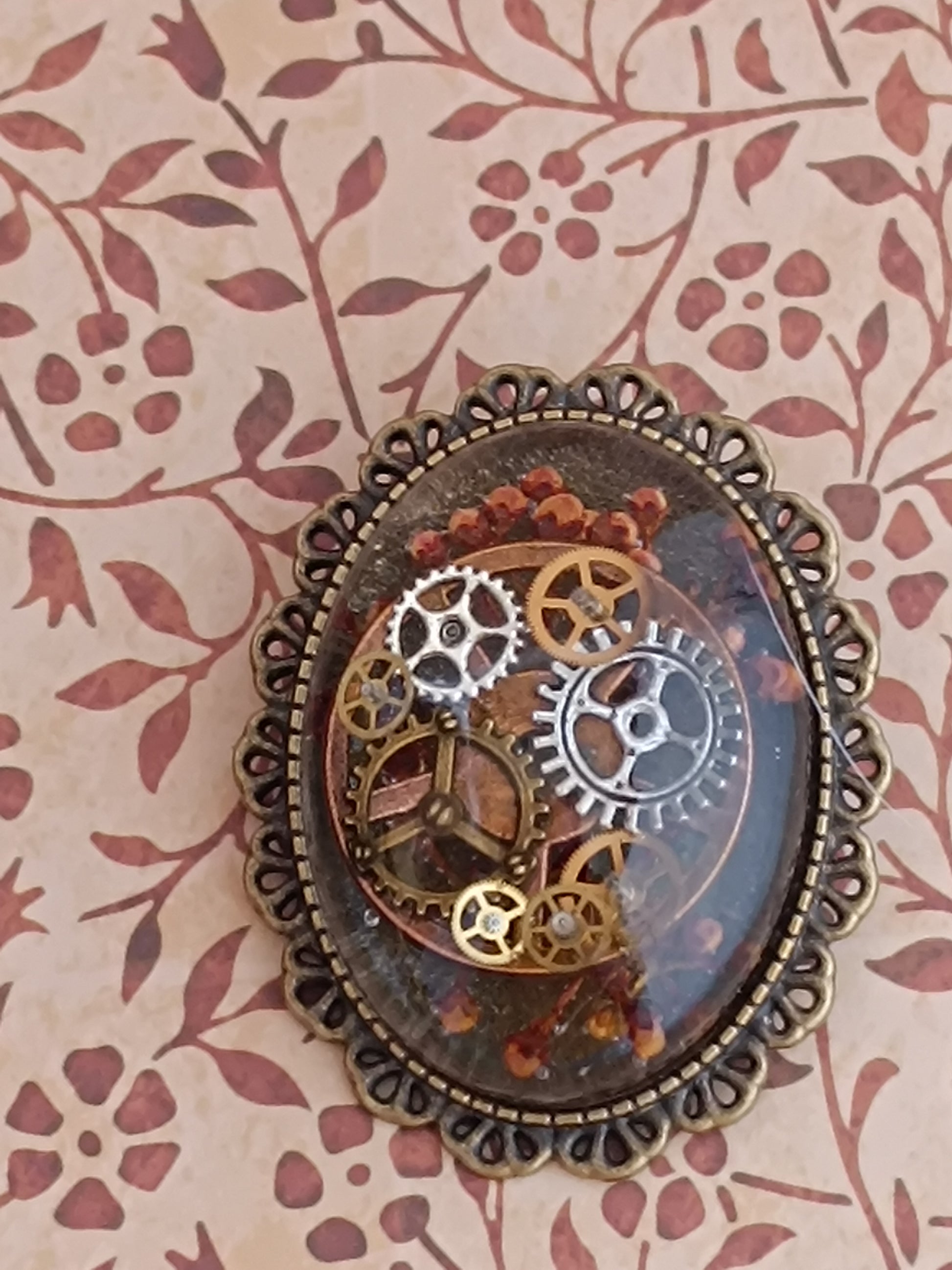 Broche Steampunk Cabochon – Résine Époxy , Engrenages Authentiques et bourgeons