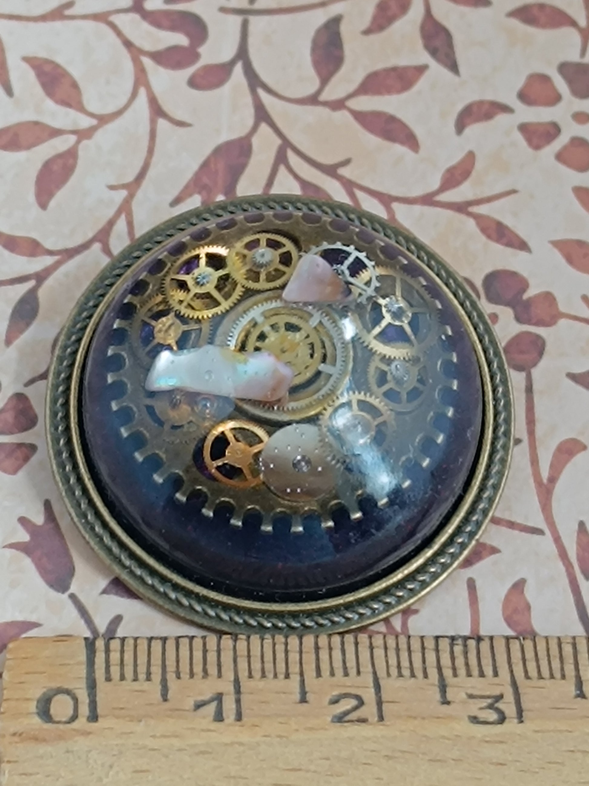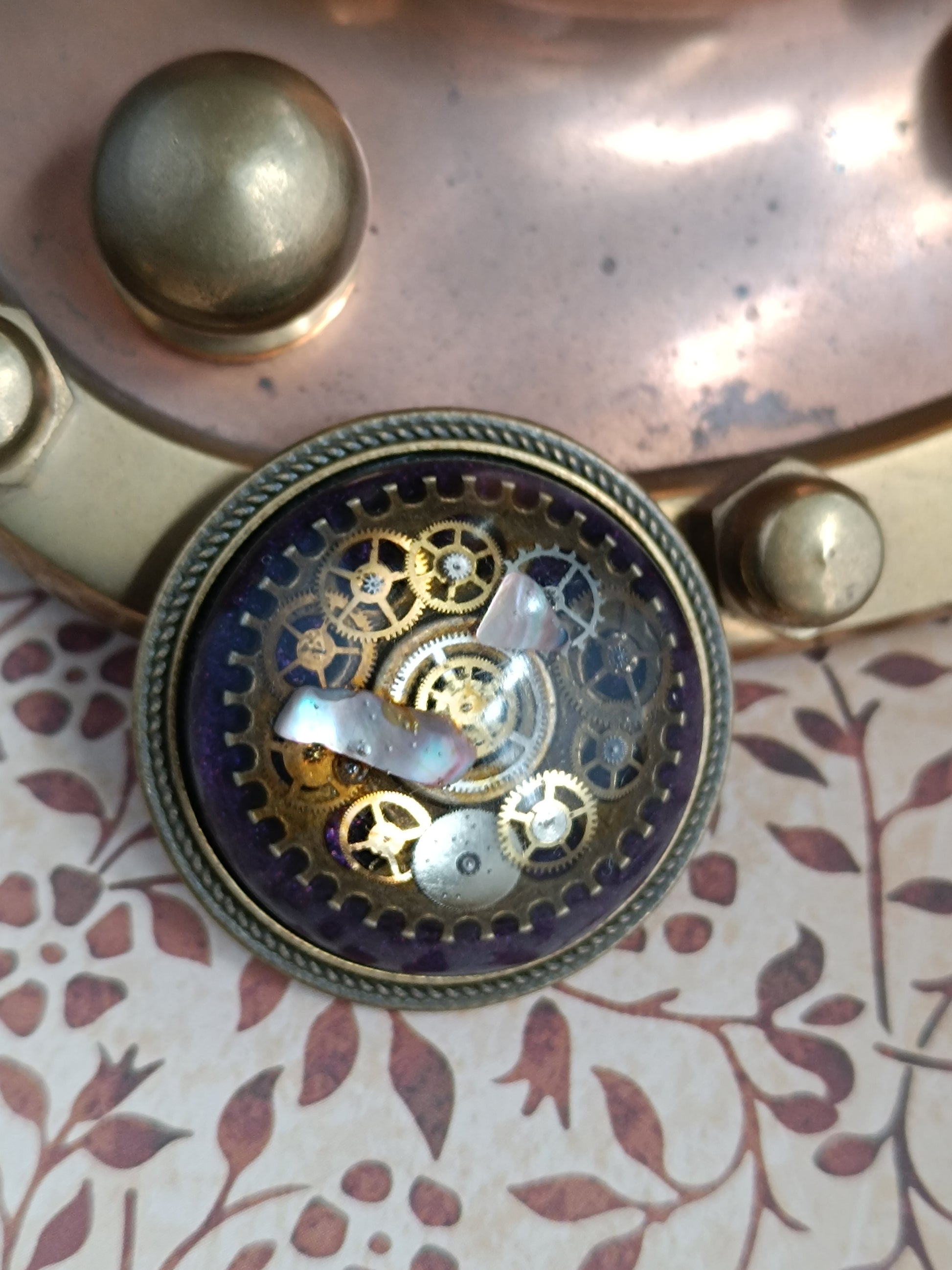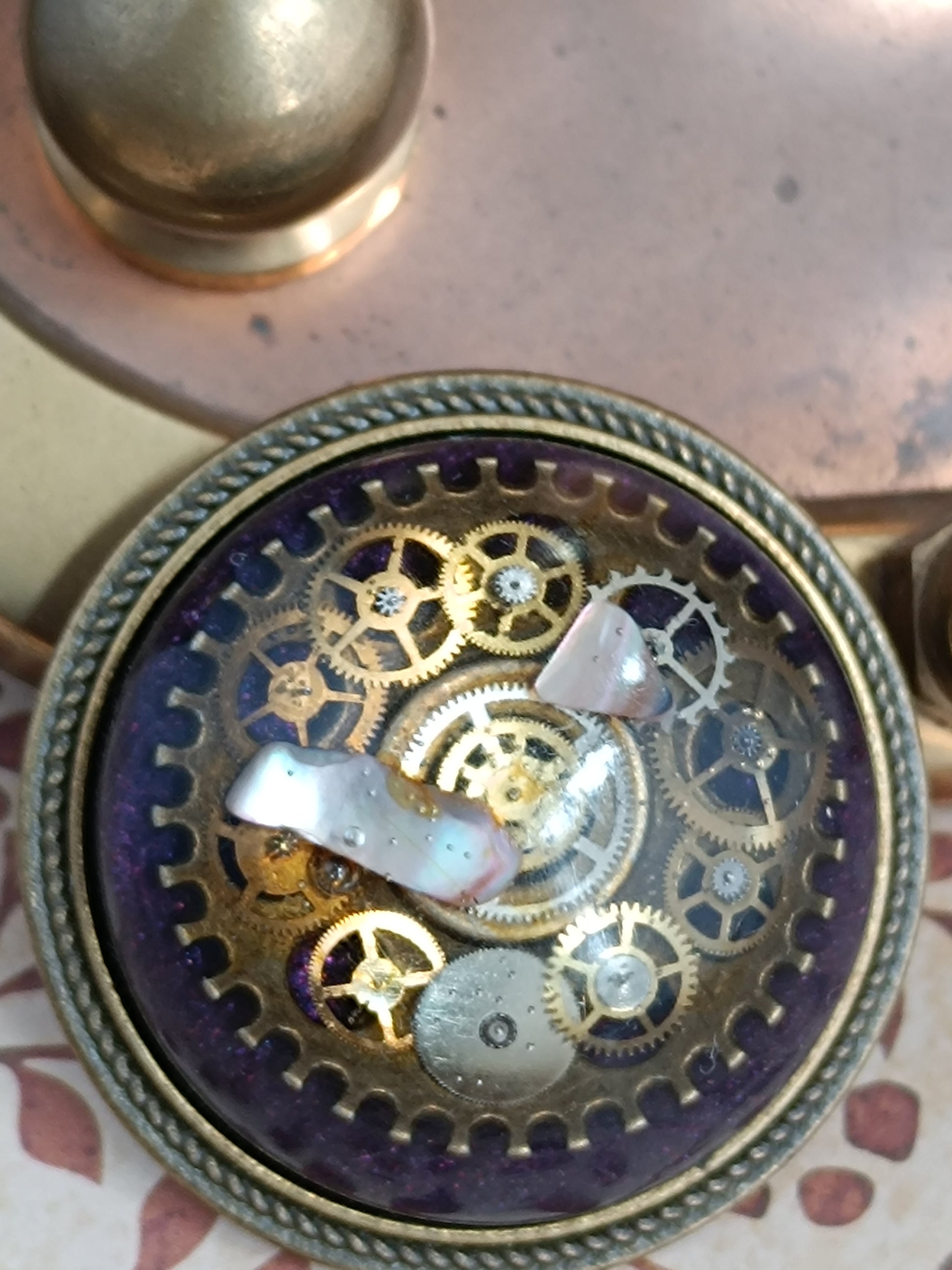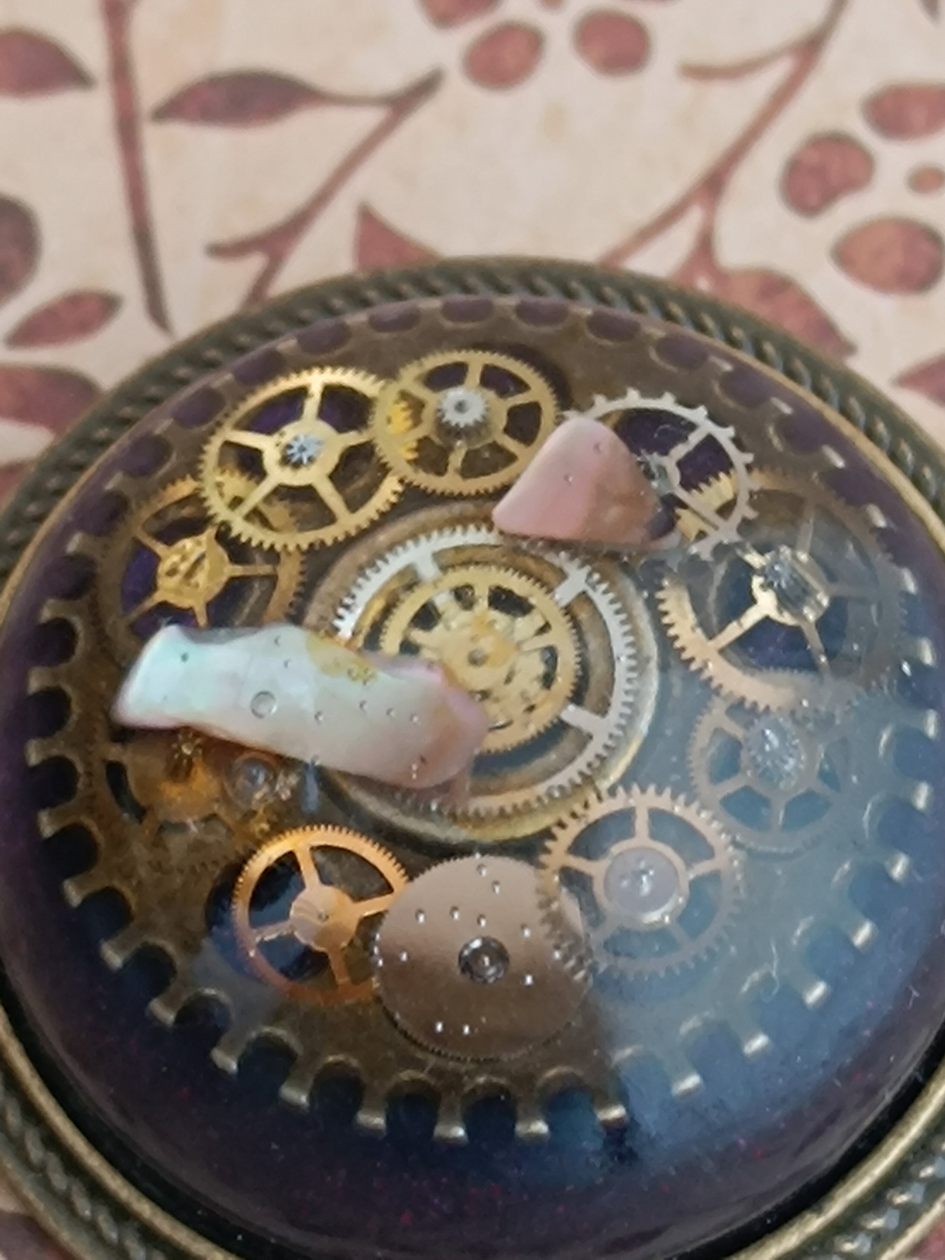 broche dôme de résine époxy et nacre Steampunk