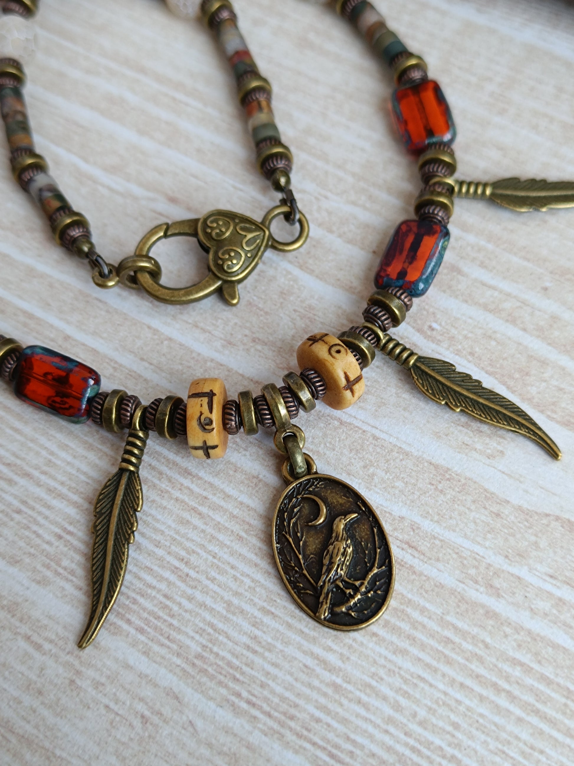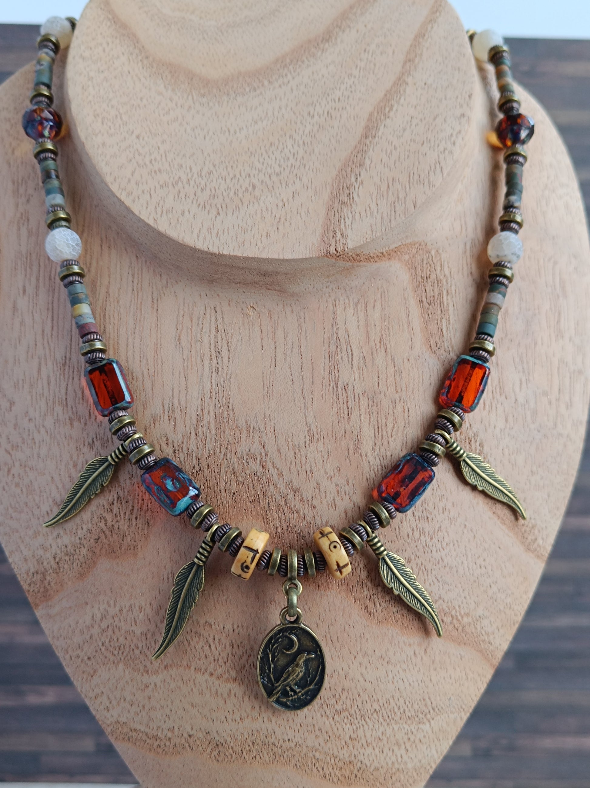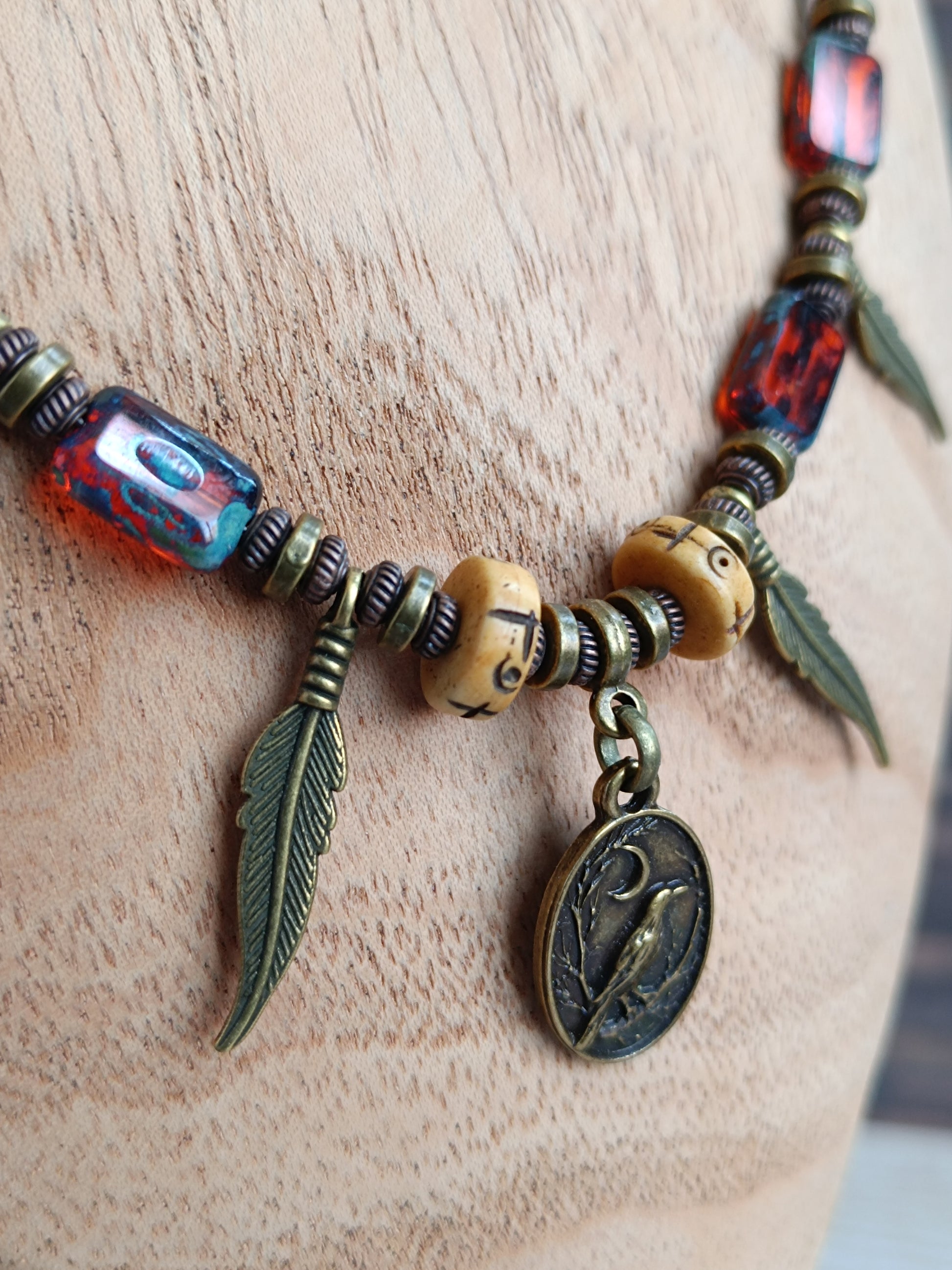 Ce collier me tient particulièrement à cœur ! J'y ai rassemblé tous les symboles qui me fascinent : le corbeau messager entre les mondes, la lune protectrice, les plumes de liberté. Chaque élément a été choisi pour créer un véritable talisman moderne.