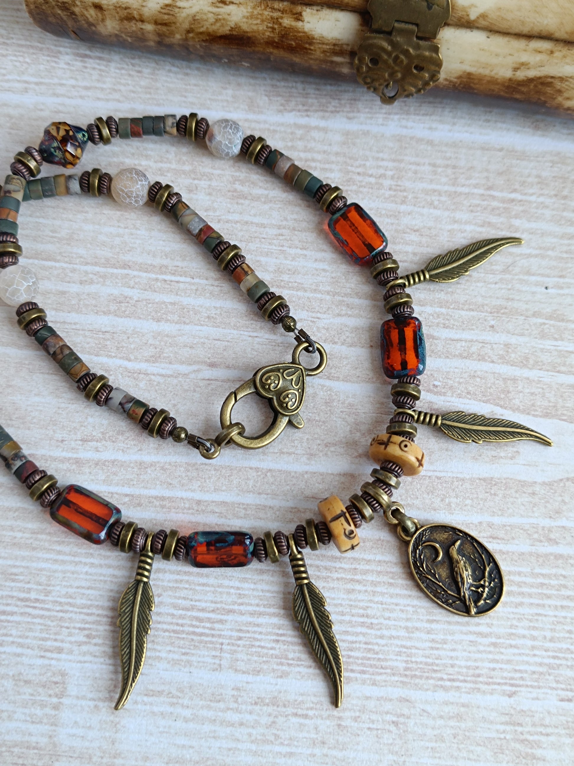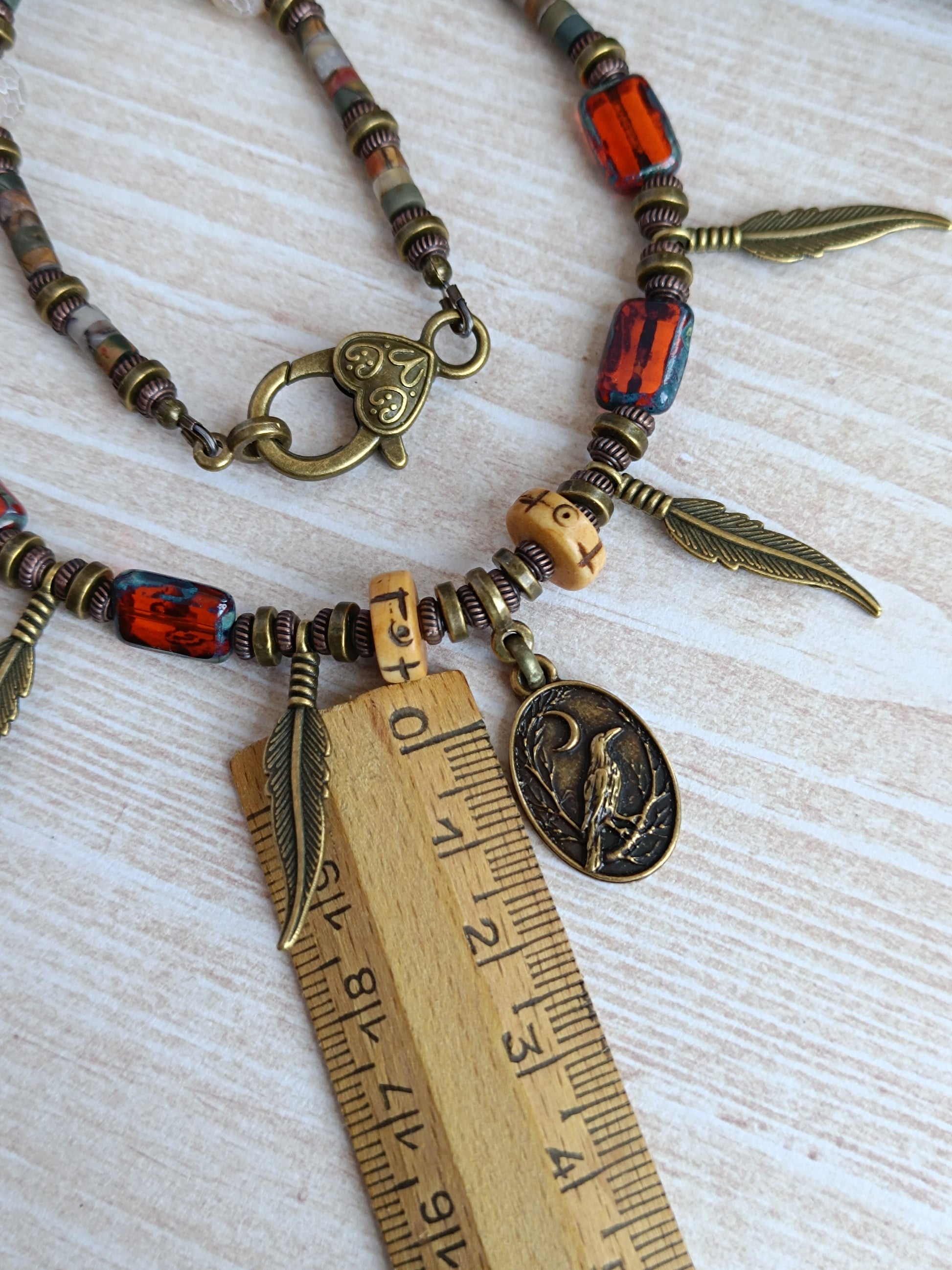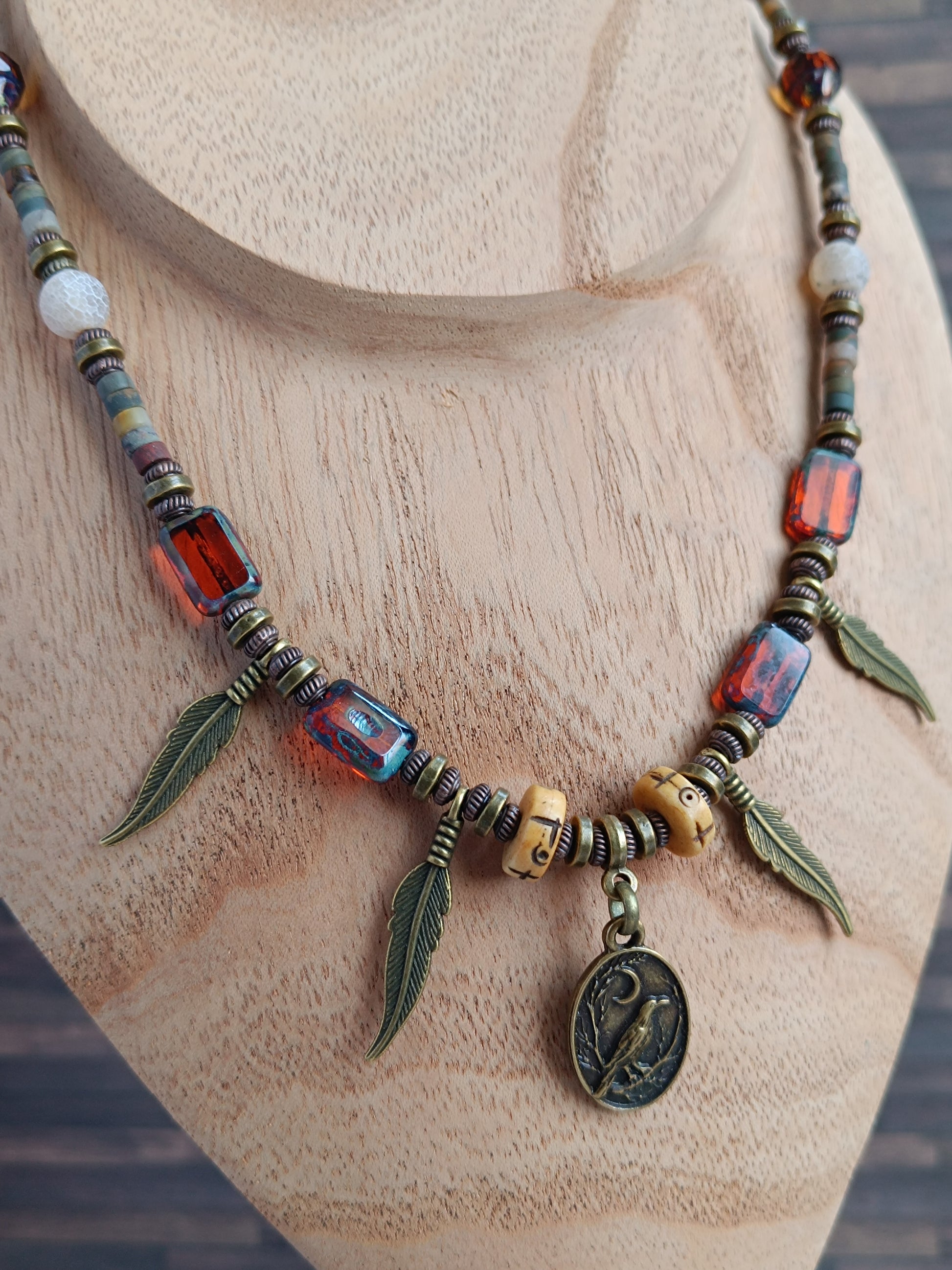 Ce collier me tient particulièrement à cœur ! J'y ai rassemblé tous les symboles qui me fascinent : le corbeau messager entre les mondes, la lune protectrice, les plumes de liberté. Chaque élément a été choisi pour créer un véritable talisman moderne.