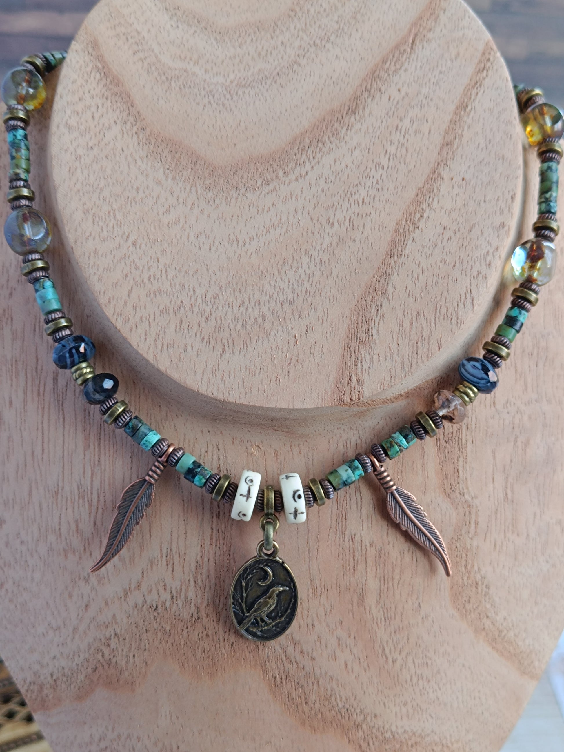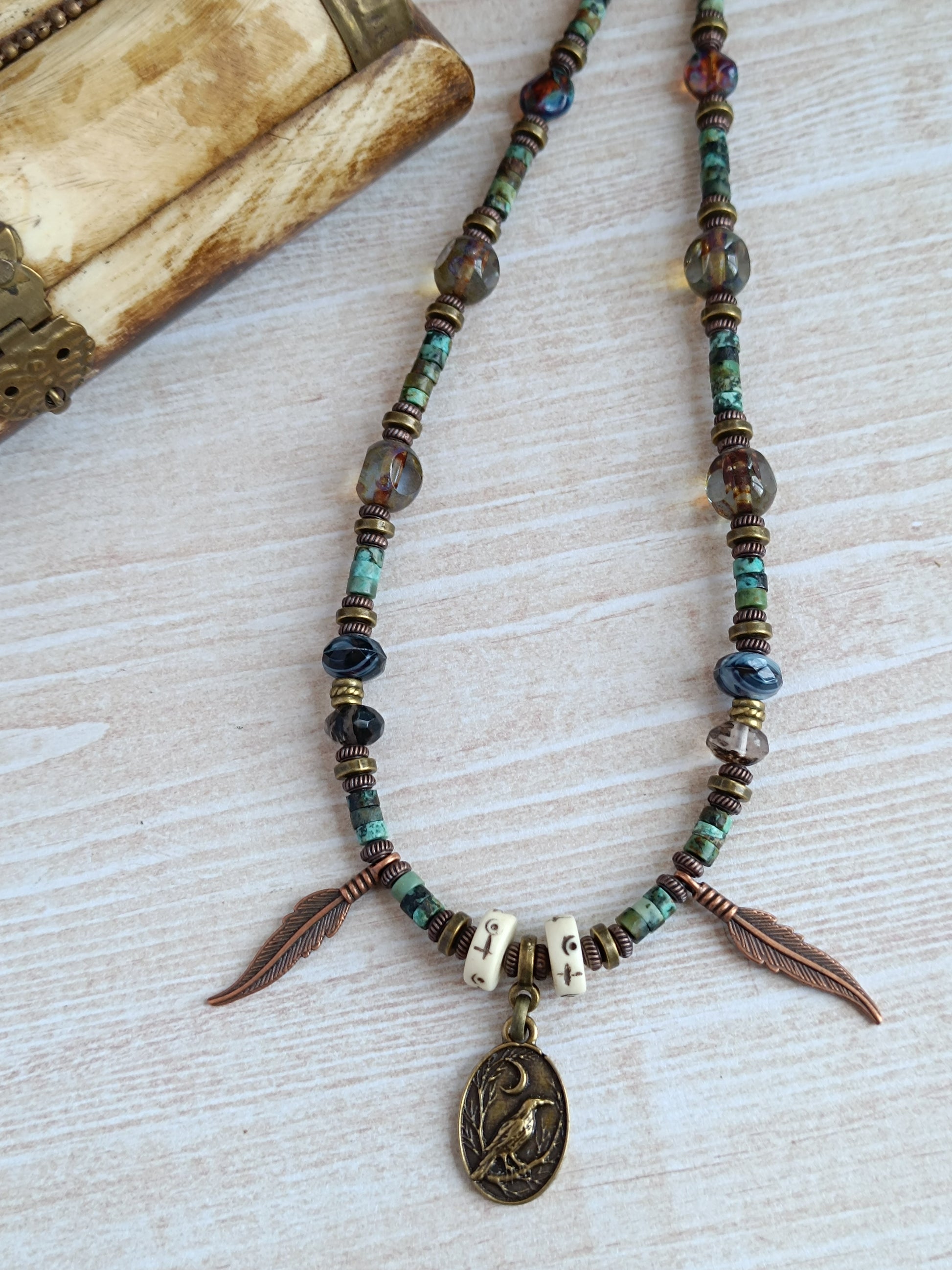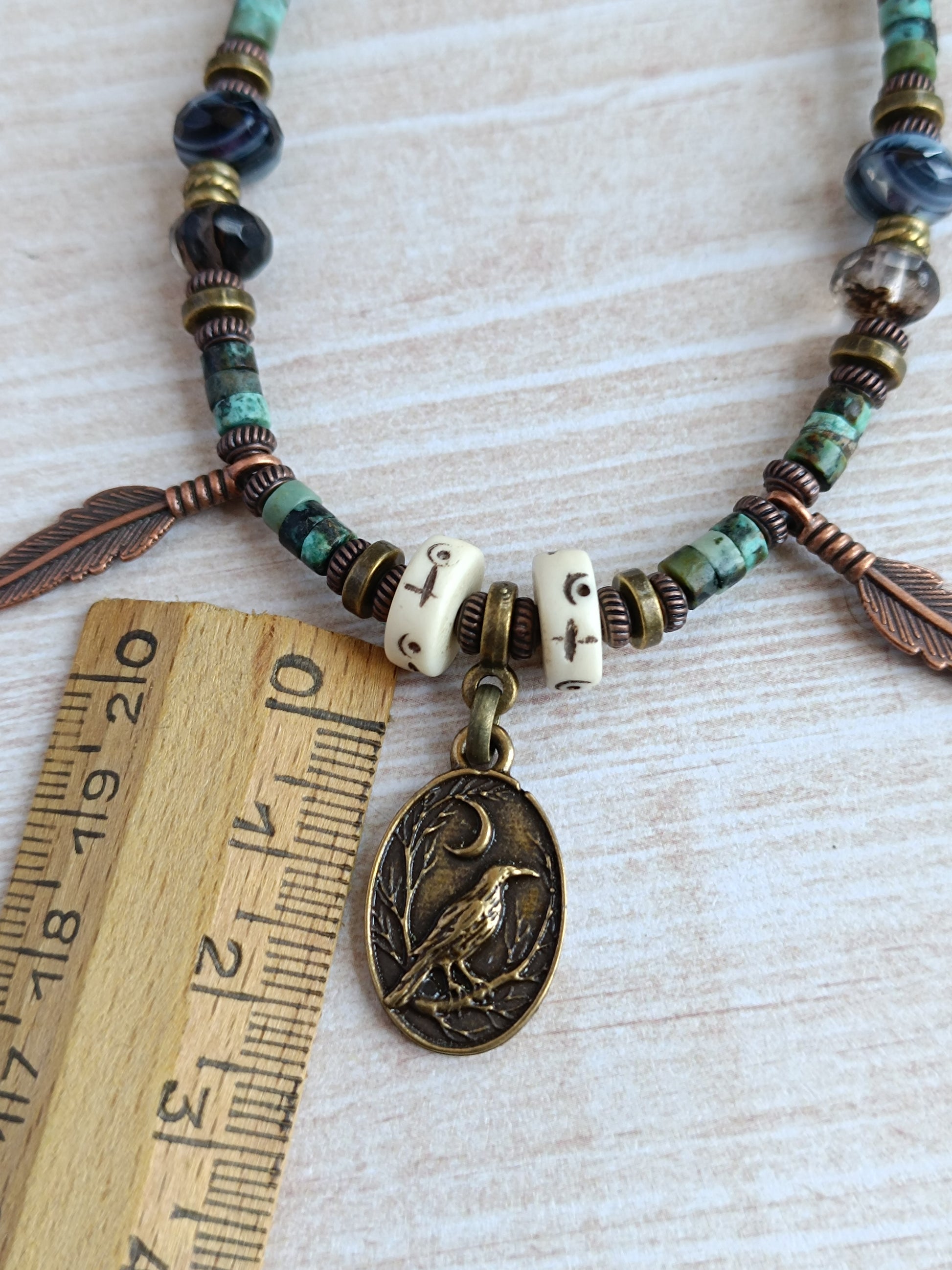 Collier Bohème Ethnique – Pendentif Corbeau Mystique & Perles en Verre Tchèque