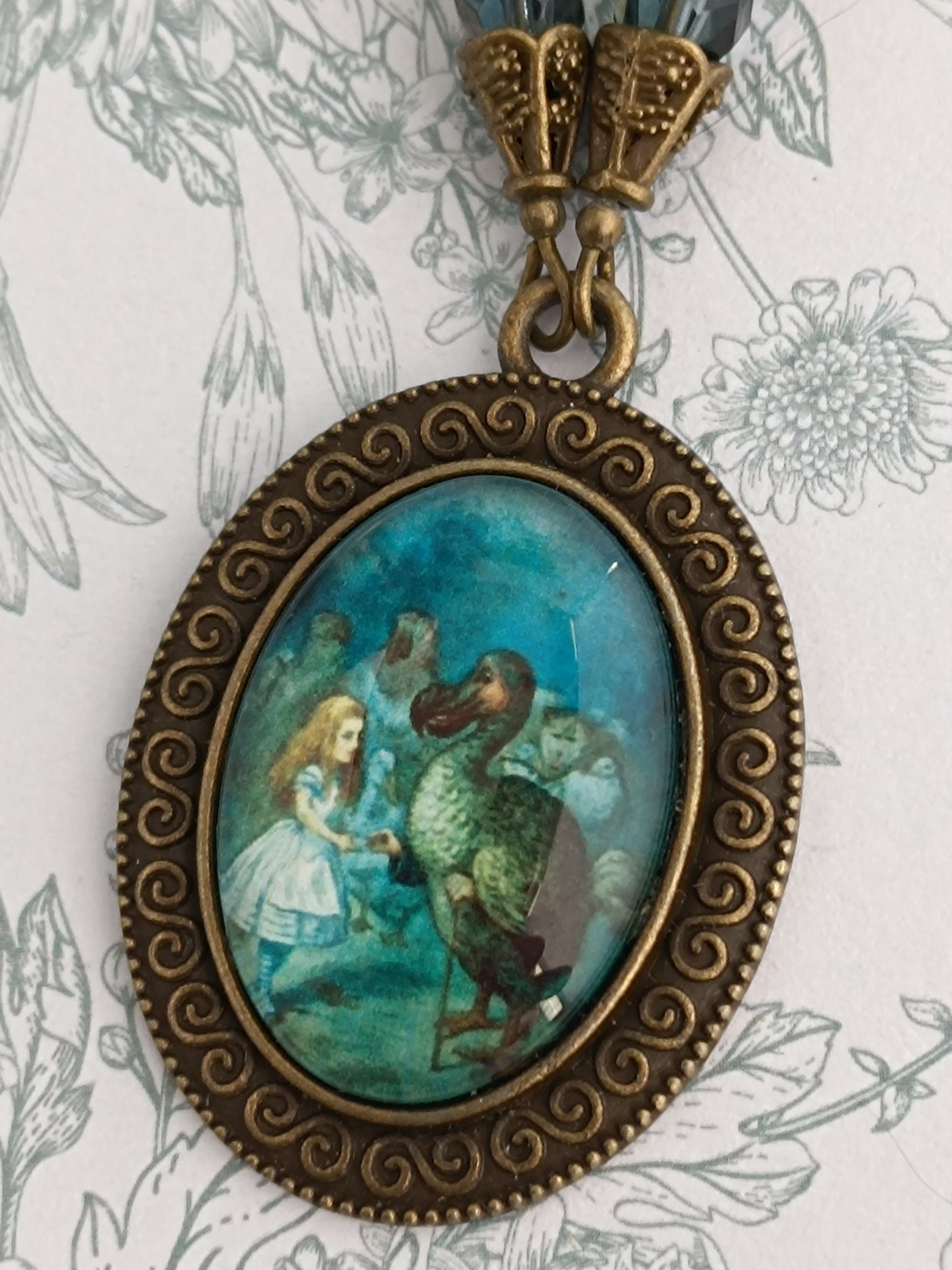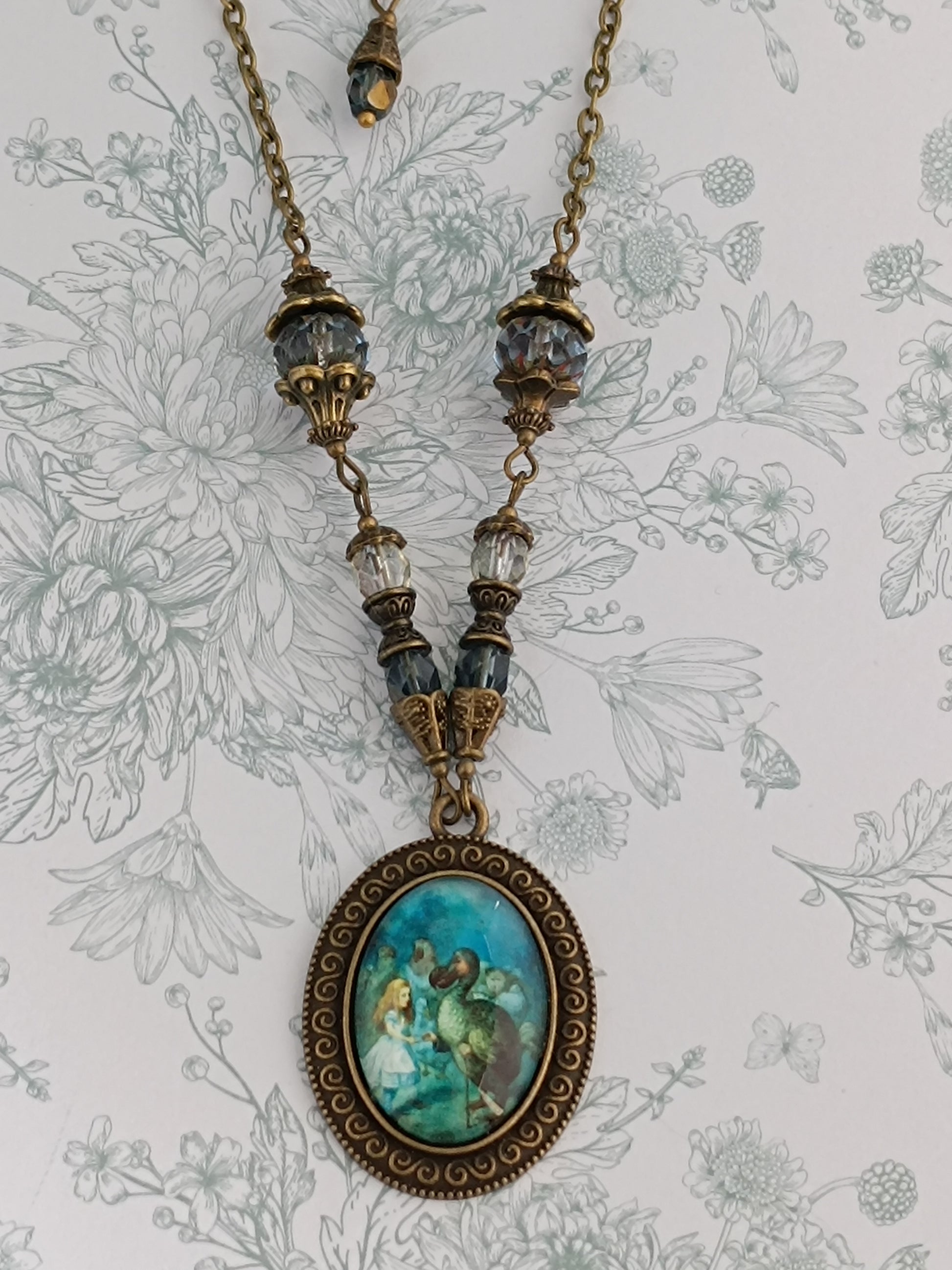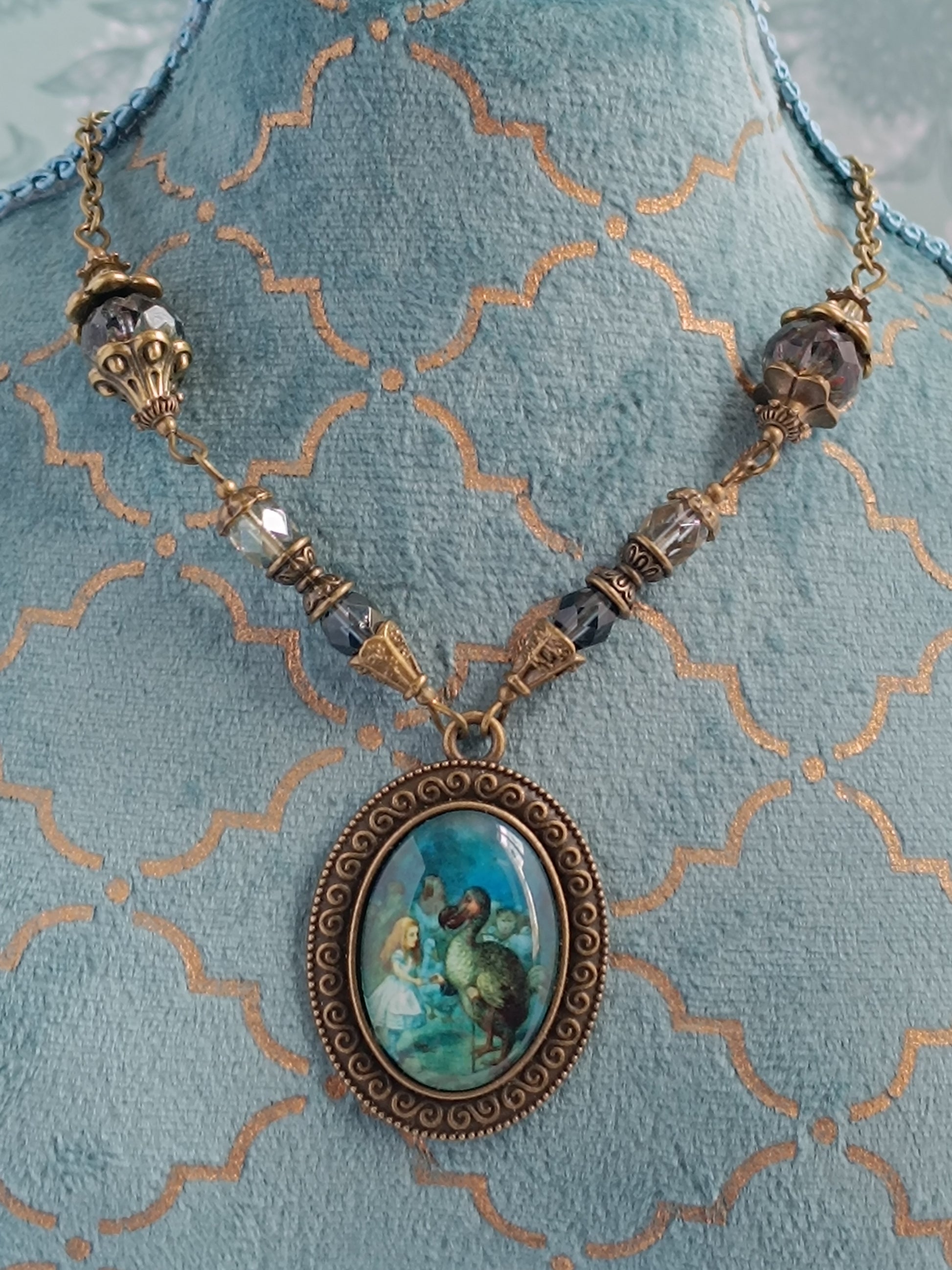 Collier Cabochon Alice et le Dodo - Bronze Antique Perles de Verre Tchèque