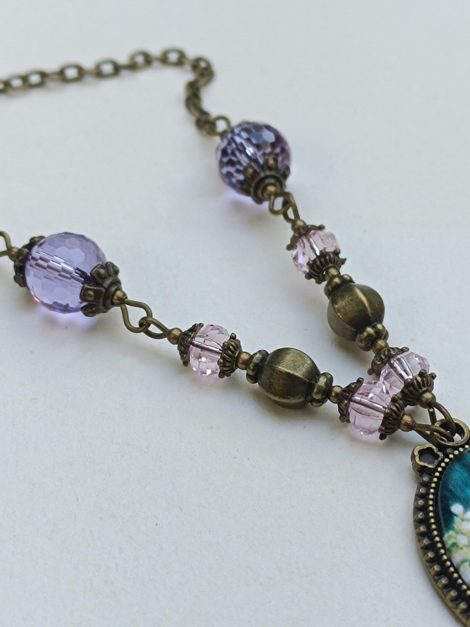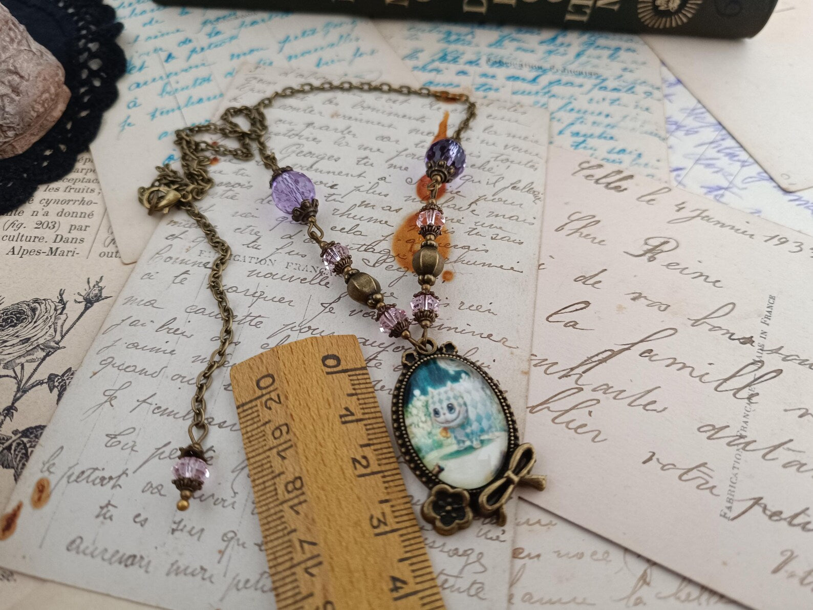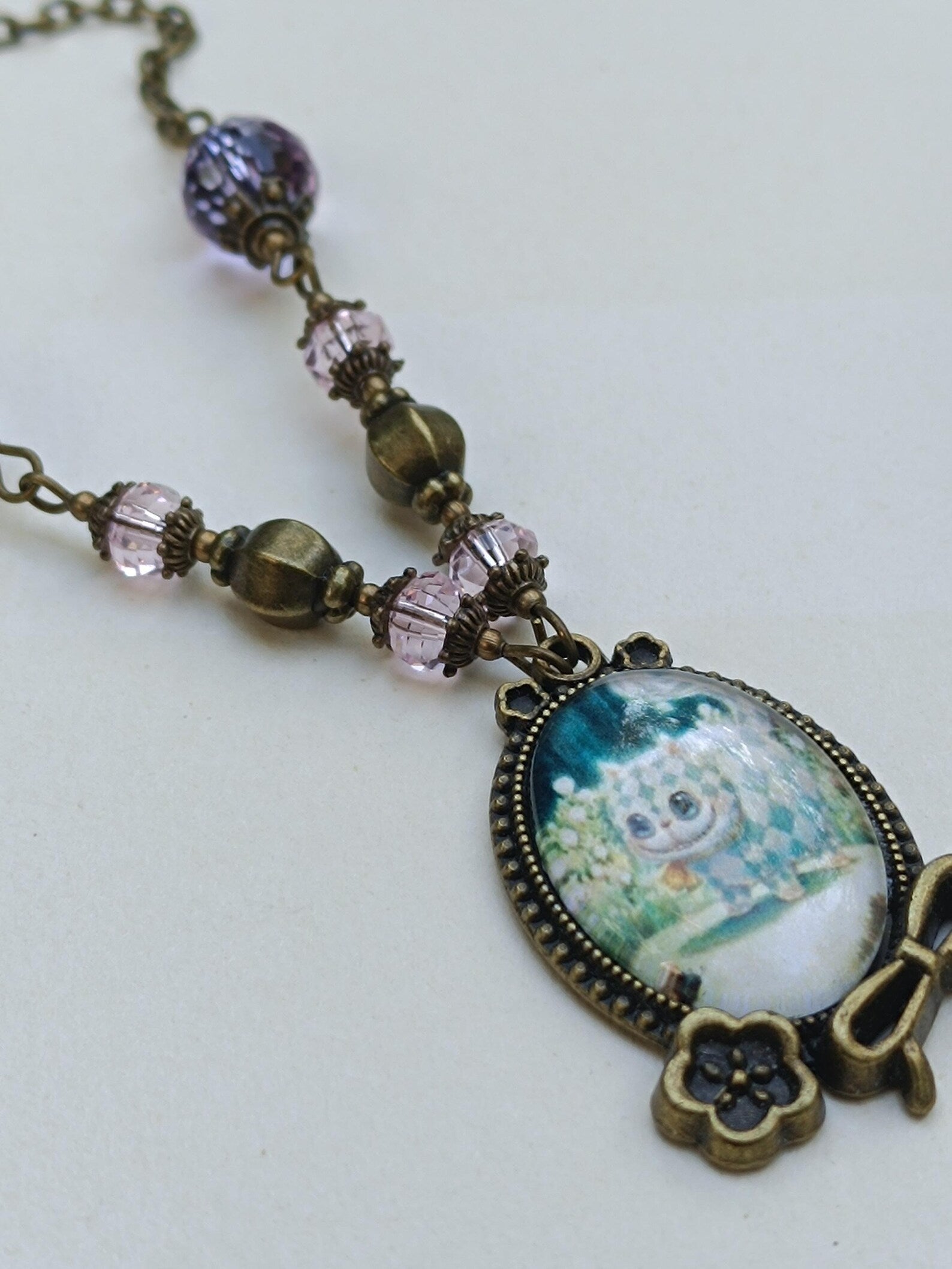 Le pendentif est orné d'une illustration minutieusement réalisée du Chat du Cheshire, face à une minuscule Alice. L'atmosphère bleue du fond évoque une ambiance mystérieuse et féerique, ajoutant une touche de magie à ce collier. Les perles de verre à facettes et les éléments en métal bronze antique complètent parfaitement le design, apportant une élégance intemporelle à ce bijou.