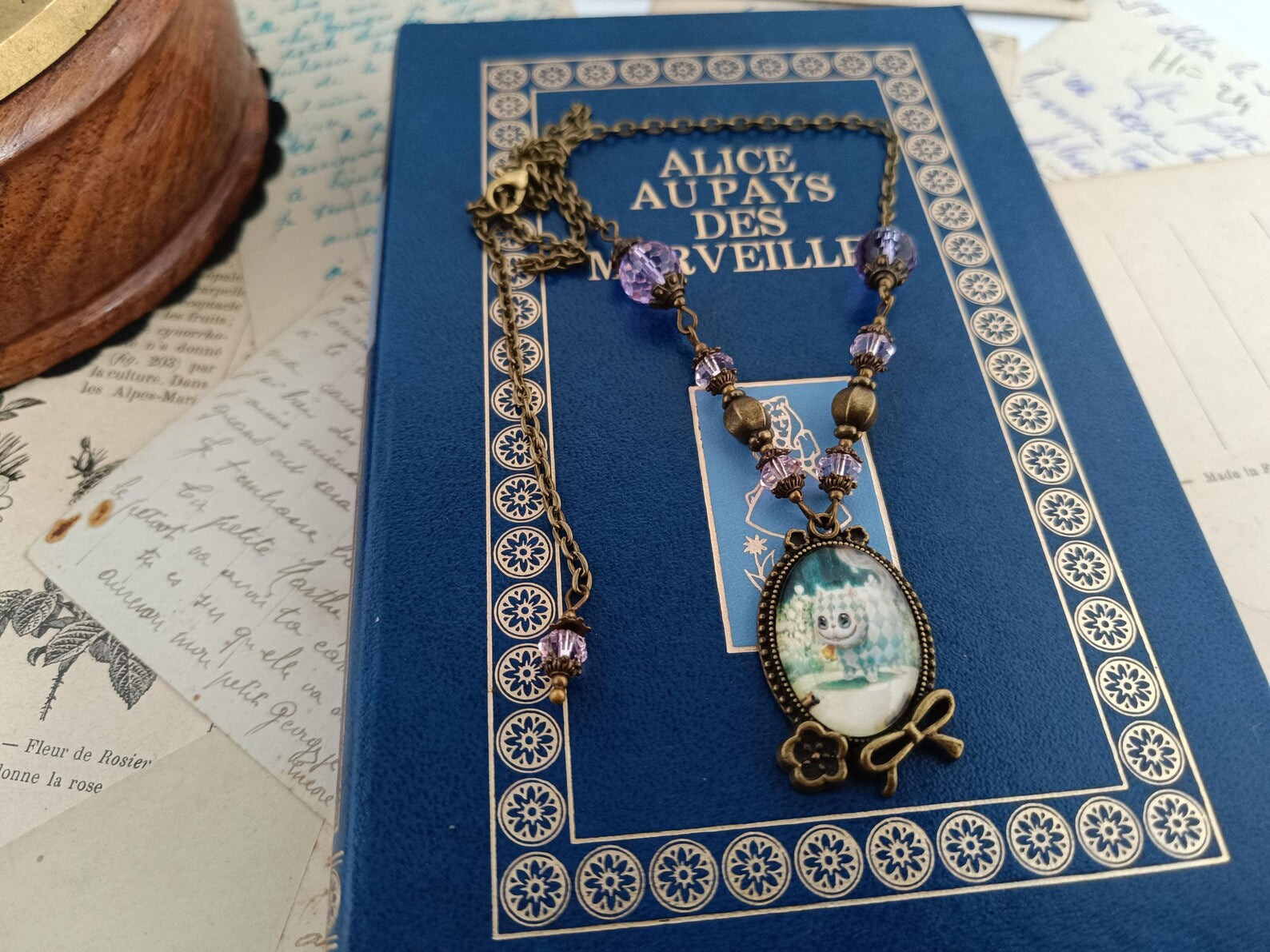 Je suis ravie de vous présenter ce magnifique collier "Alice et le Chat du Cheshire", inspiré par l'univers enchanteur de "Alice au Pays des Merveilles". Ce bijou unique associe l'élégance victorienne à la fantaisie littéraire pour créer une pièce véritablement exceptionnelle.