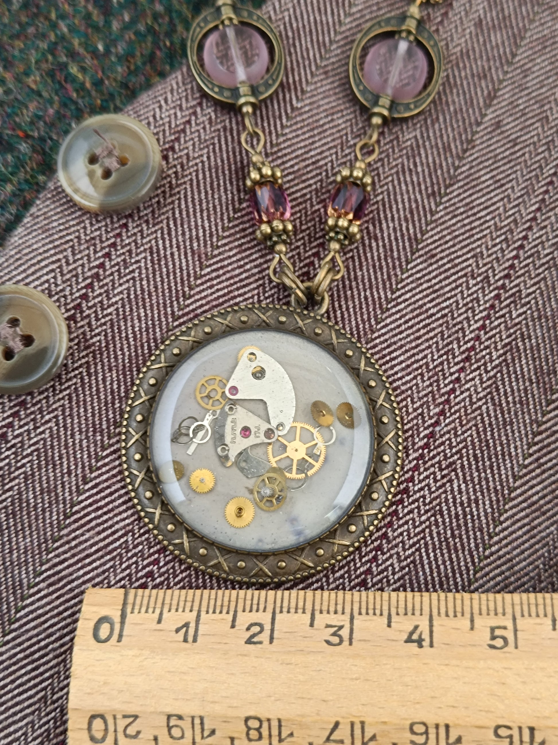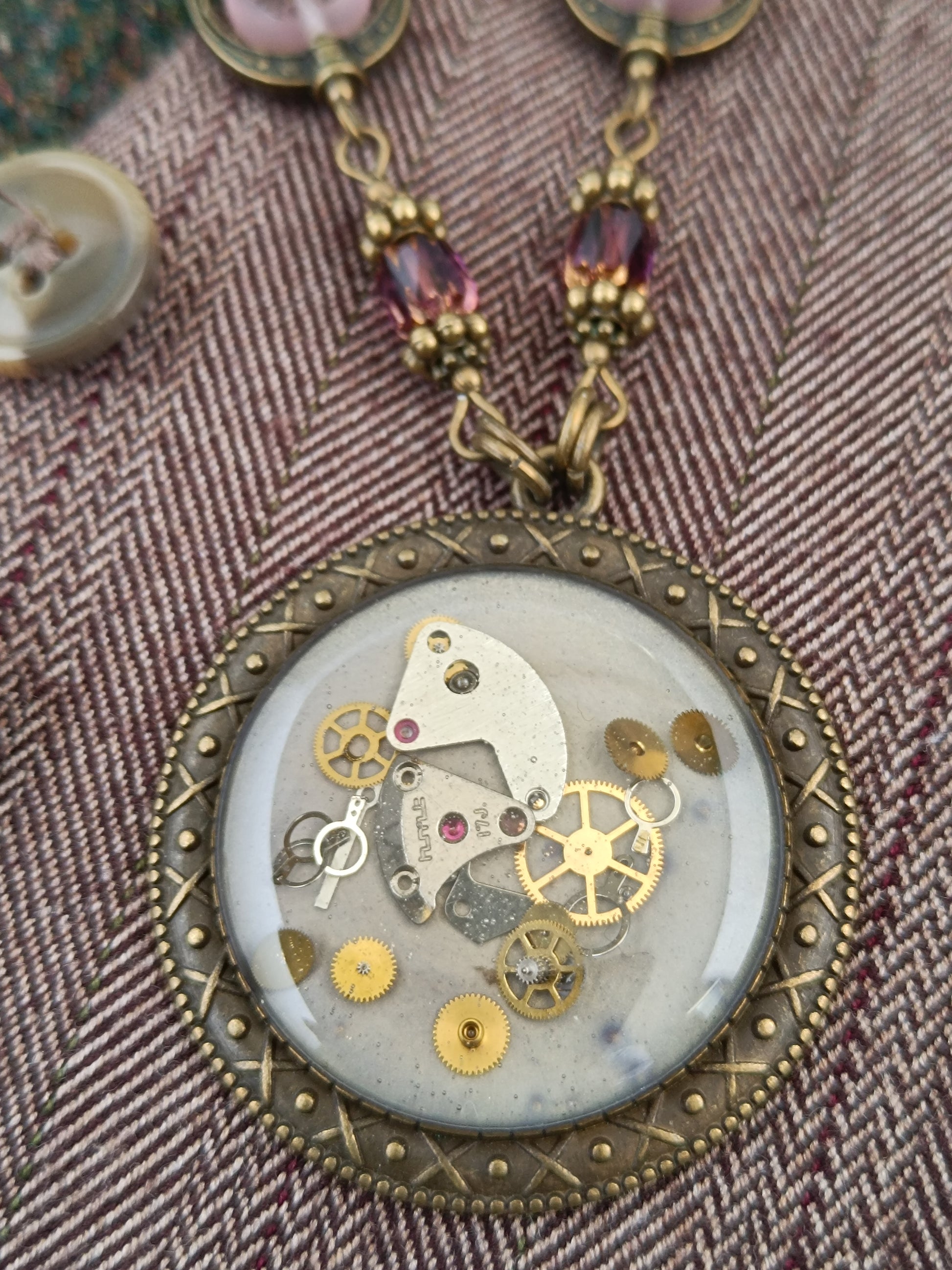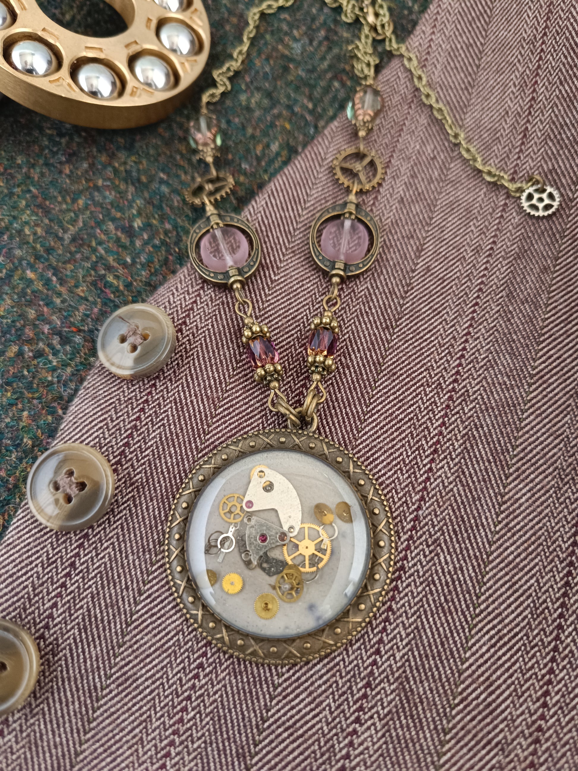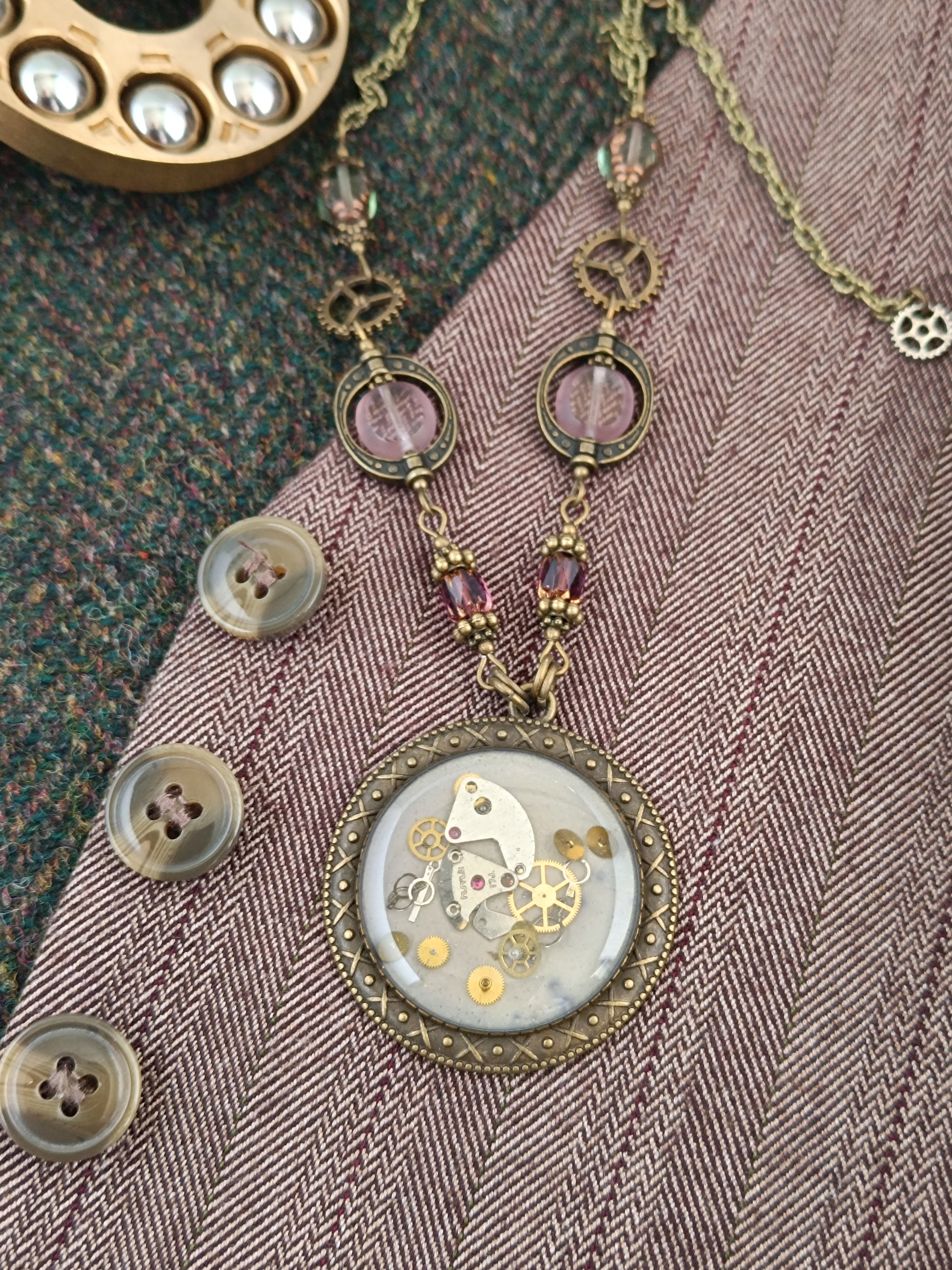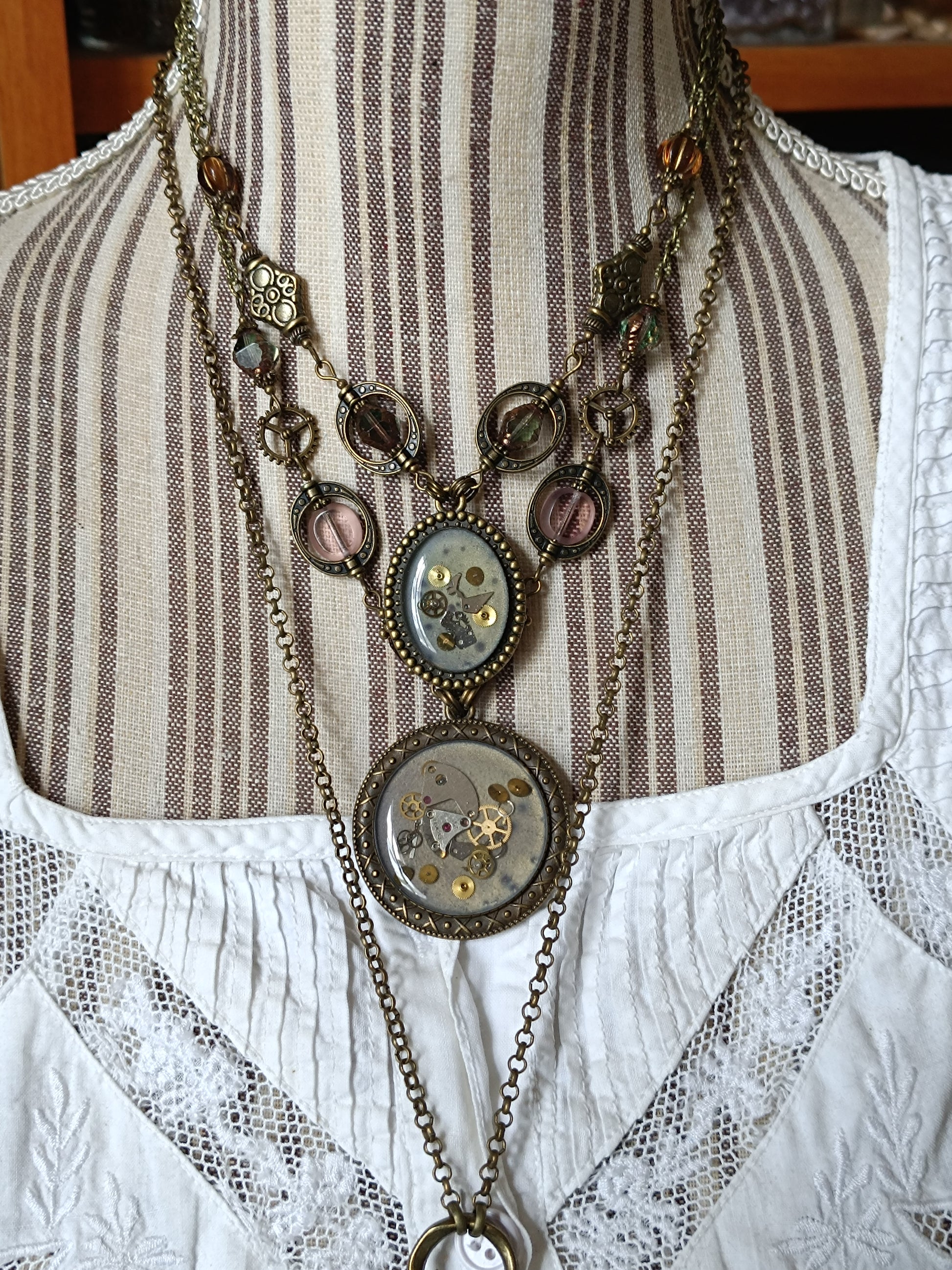 Collier chaîne et chapelet de perles pendentif cabochon steampunk