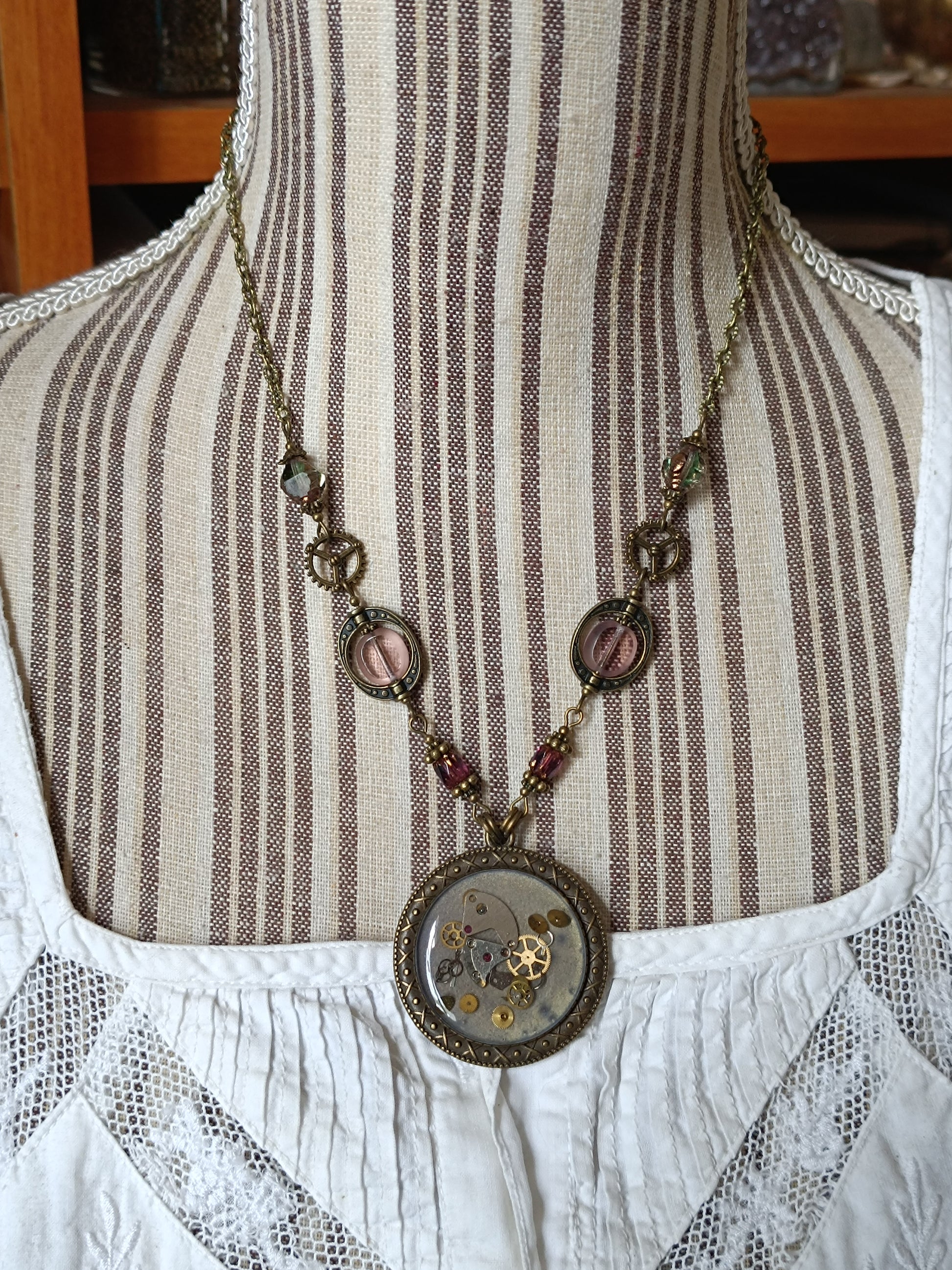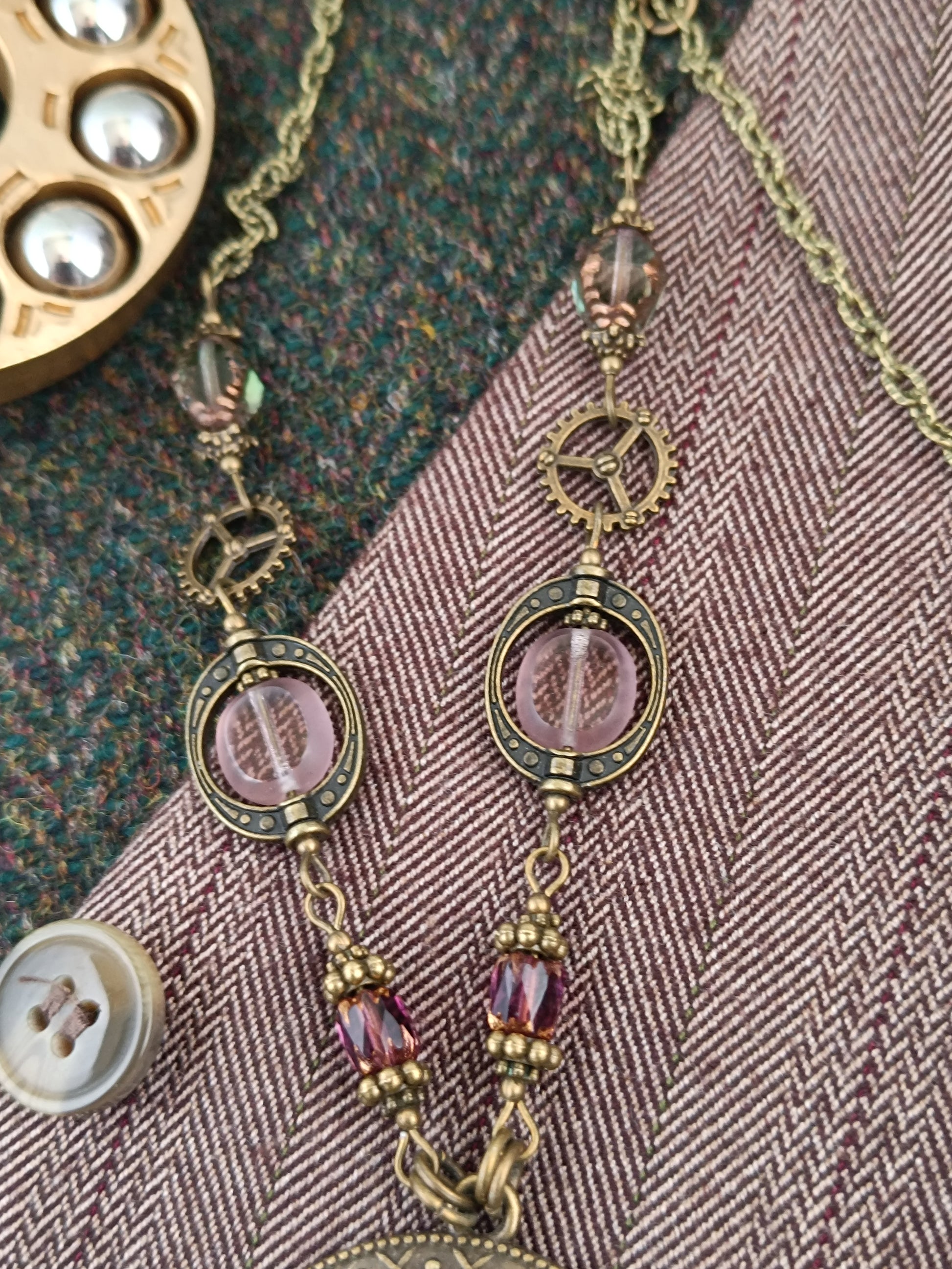 Découvrez ce magnifique collier artisanal qui marie avec élégance l'univers steampunk à la délicatesse des perles de verre tchèque. Ce bijou unique révèle toute sa beauté dans ses détails raffinés et sa finition bronze.