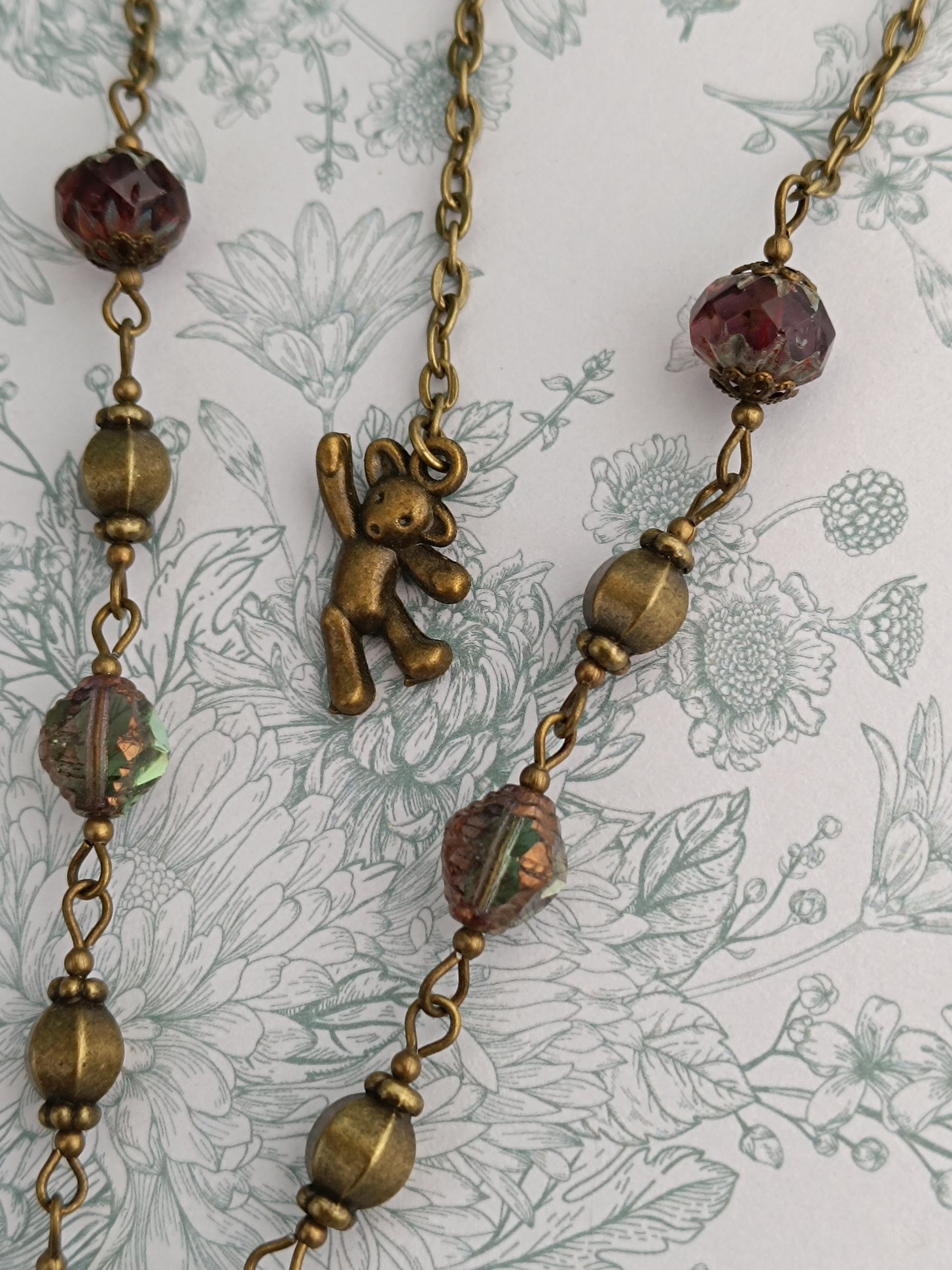 Les détails en métal bronze ajoutent une touche d’élégance sombre et féminine, tandis que les perles en verre tchèque apportent une harmonie délicate et raffinée.
