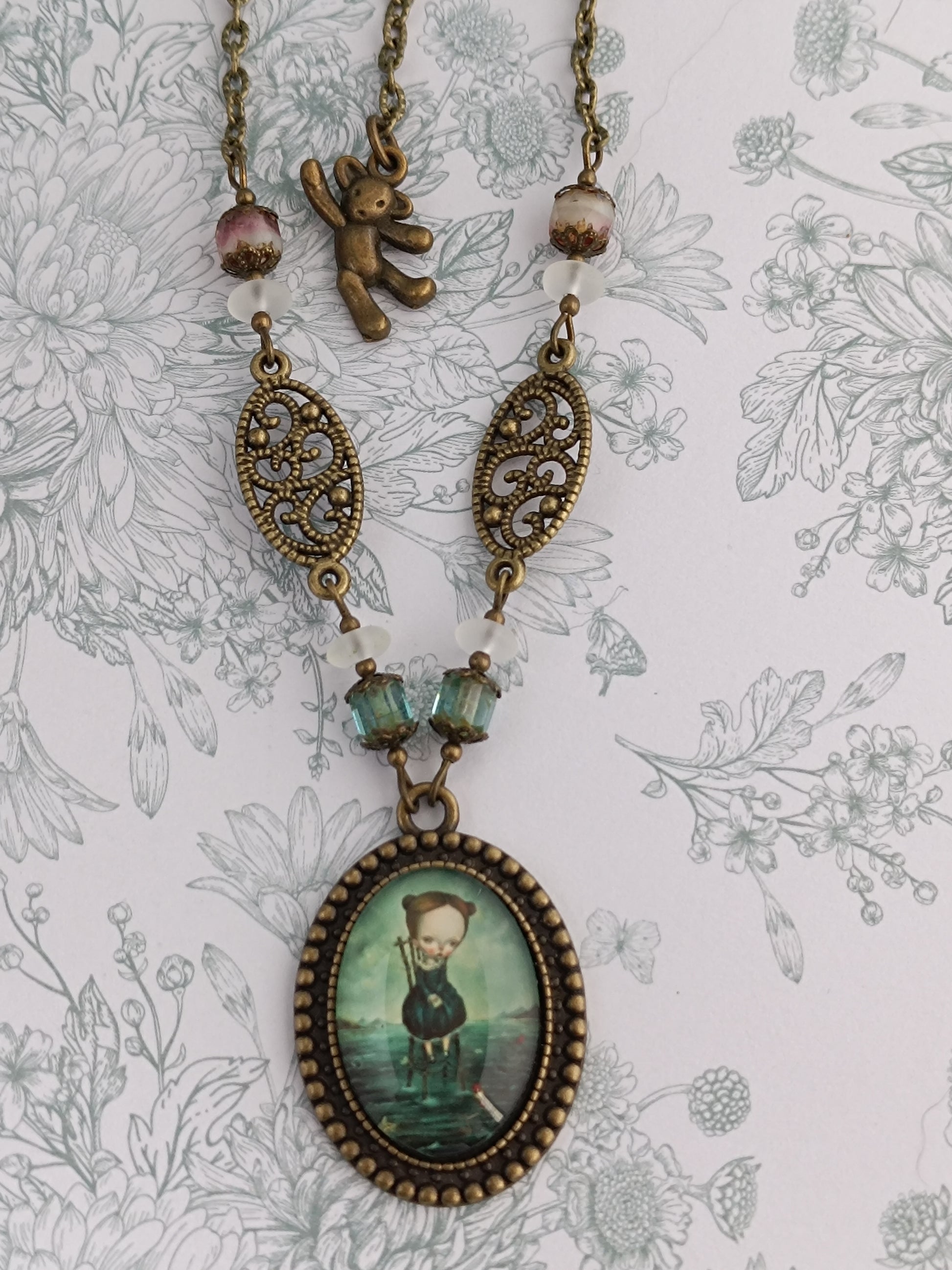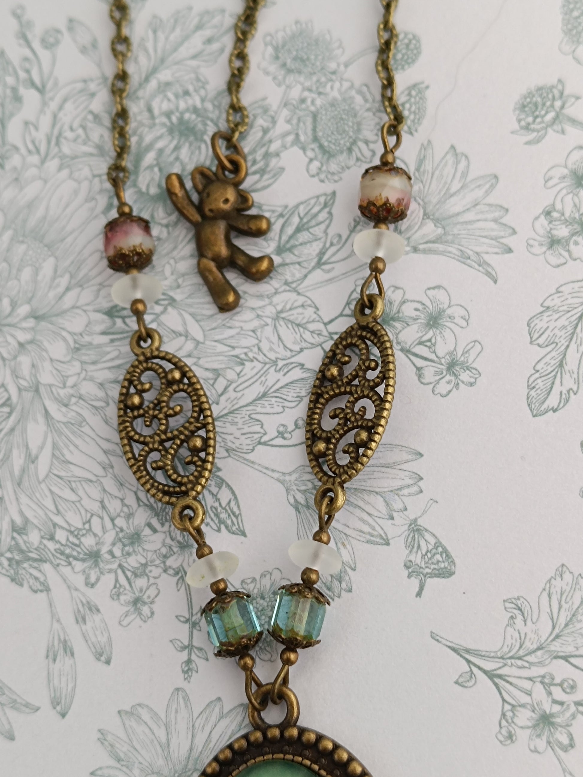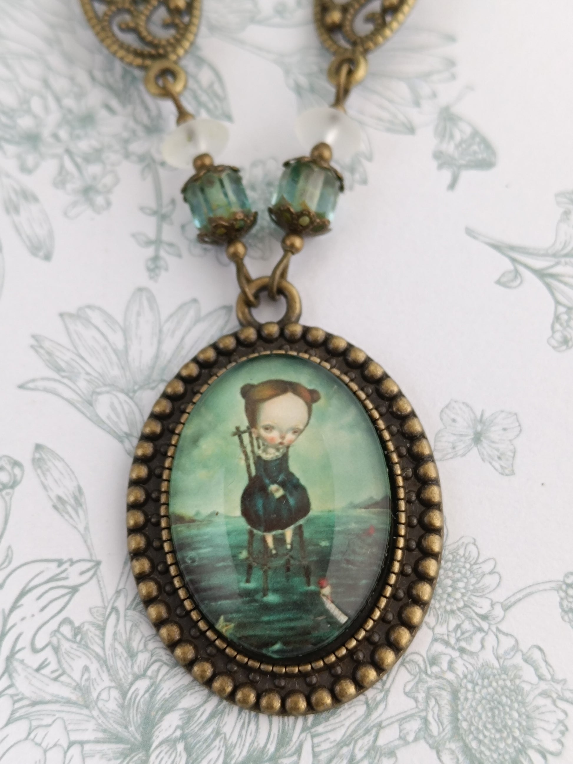 Ce magnifique collier cabochon en verre est orné d’une illustration délicate représentant une jeune femme assise au-dessus de la mer. Le collier, en partie composé d’un chapelet de perles de verre tchèque et de breloques filigranes, ajoute une touche de sophistication et de charme vintage à votre tenue.