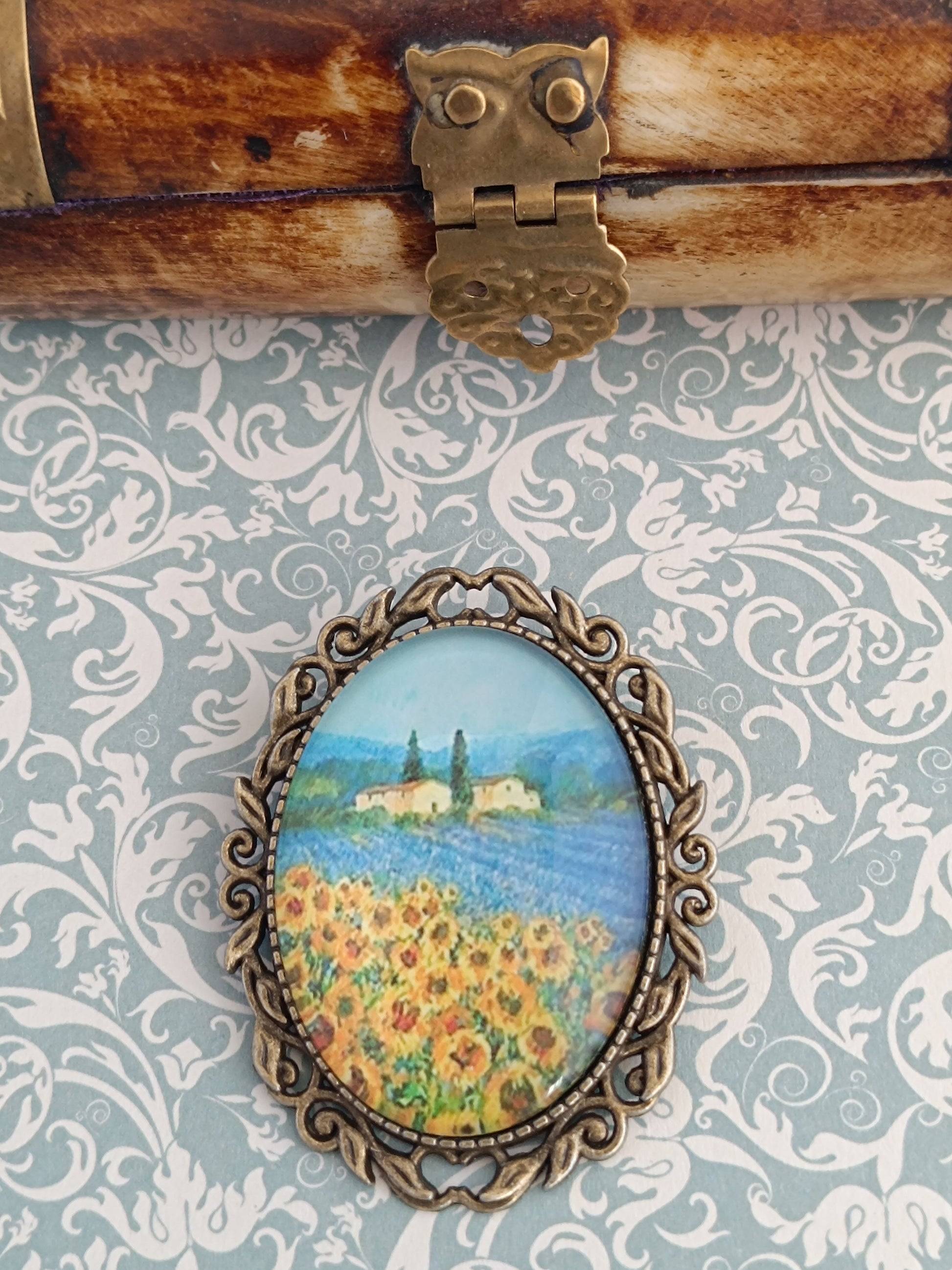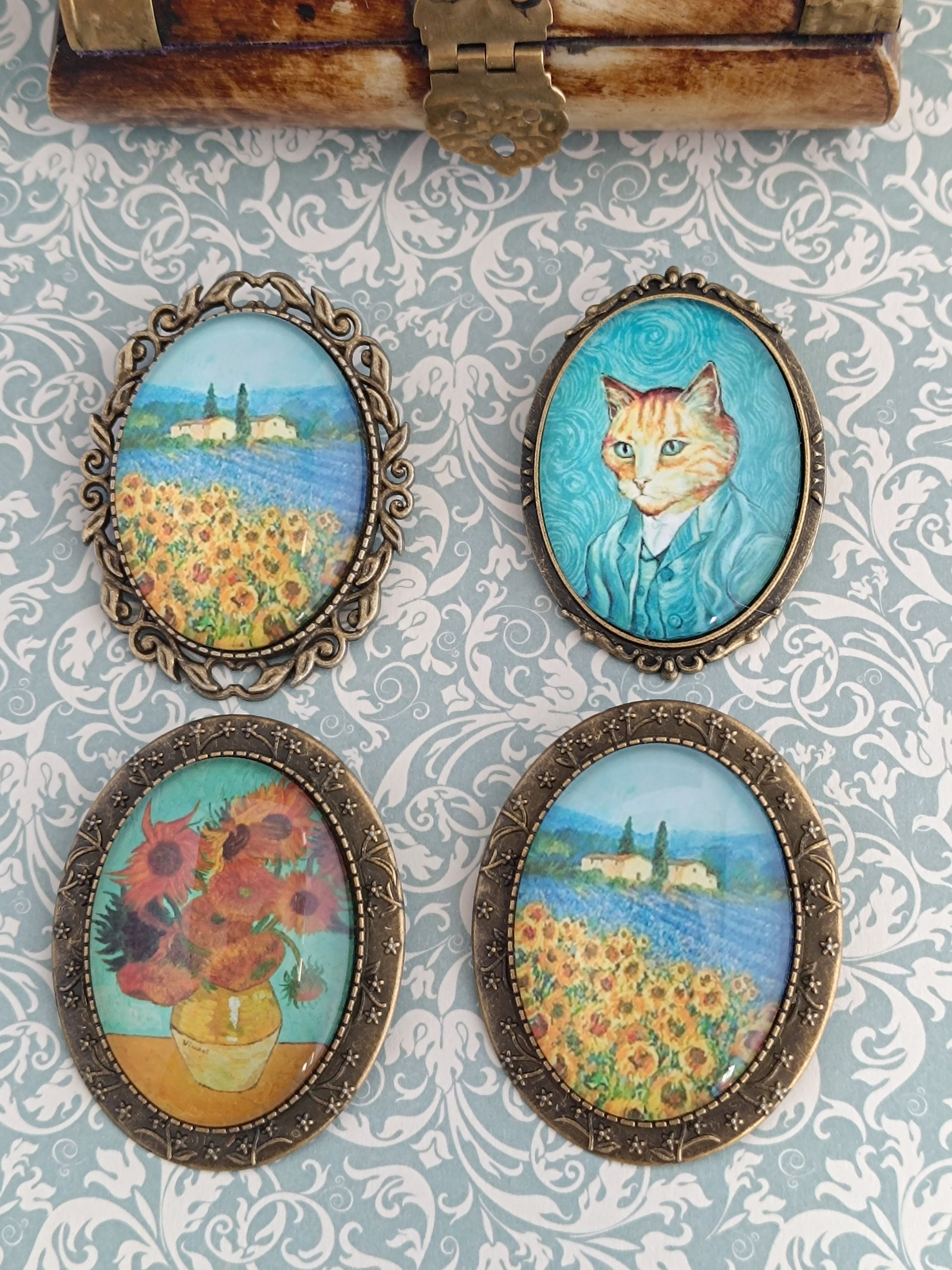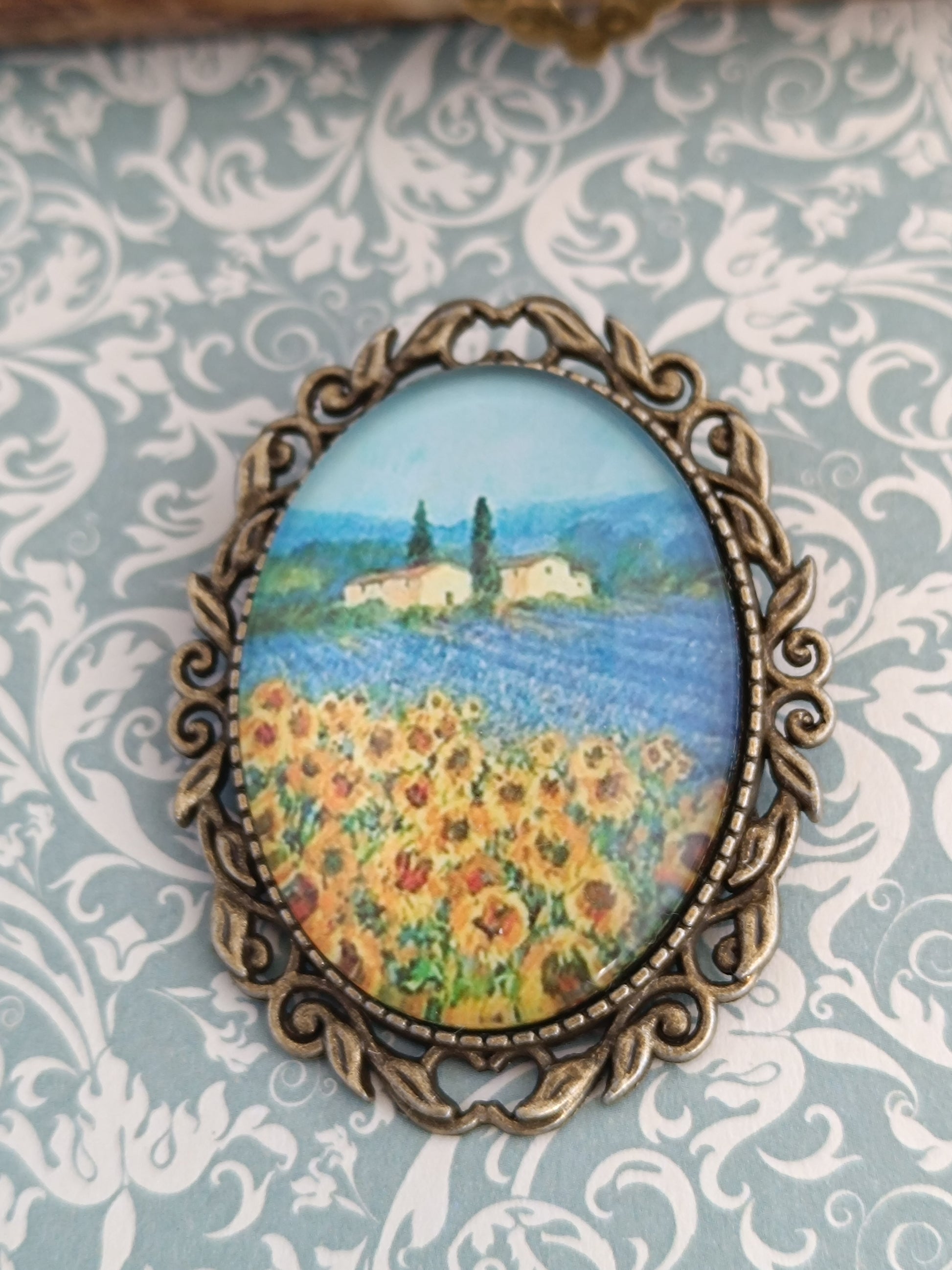 Broche cabochon verre hommage à Vincent Van Gogh les tournesols
