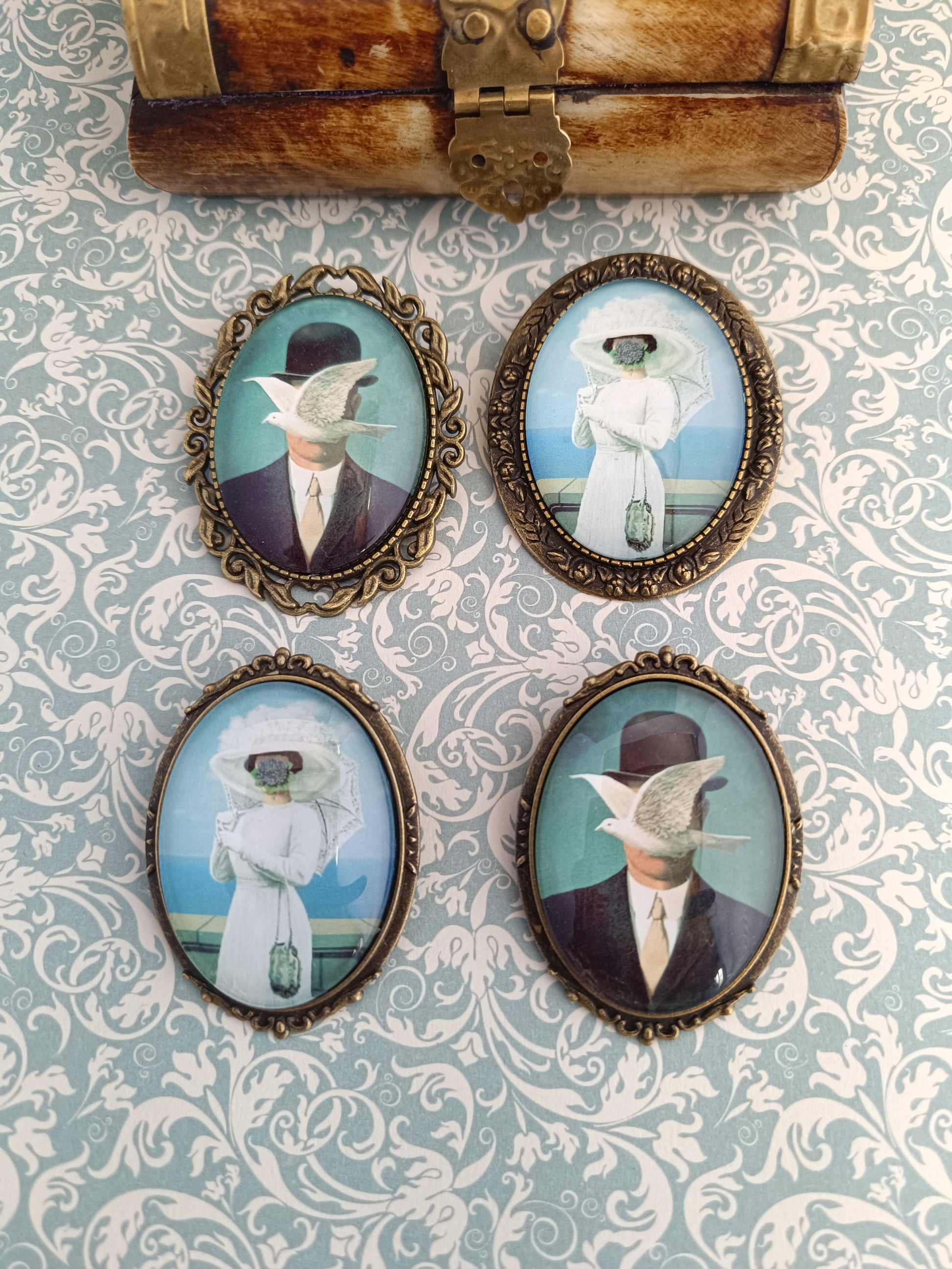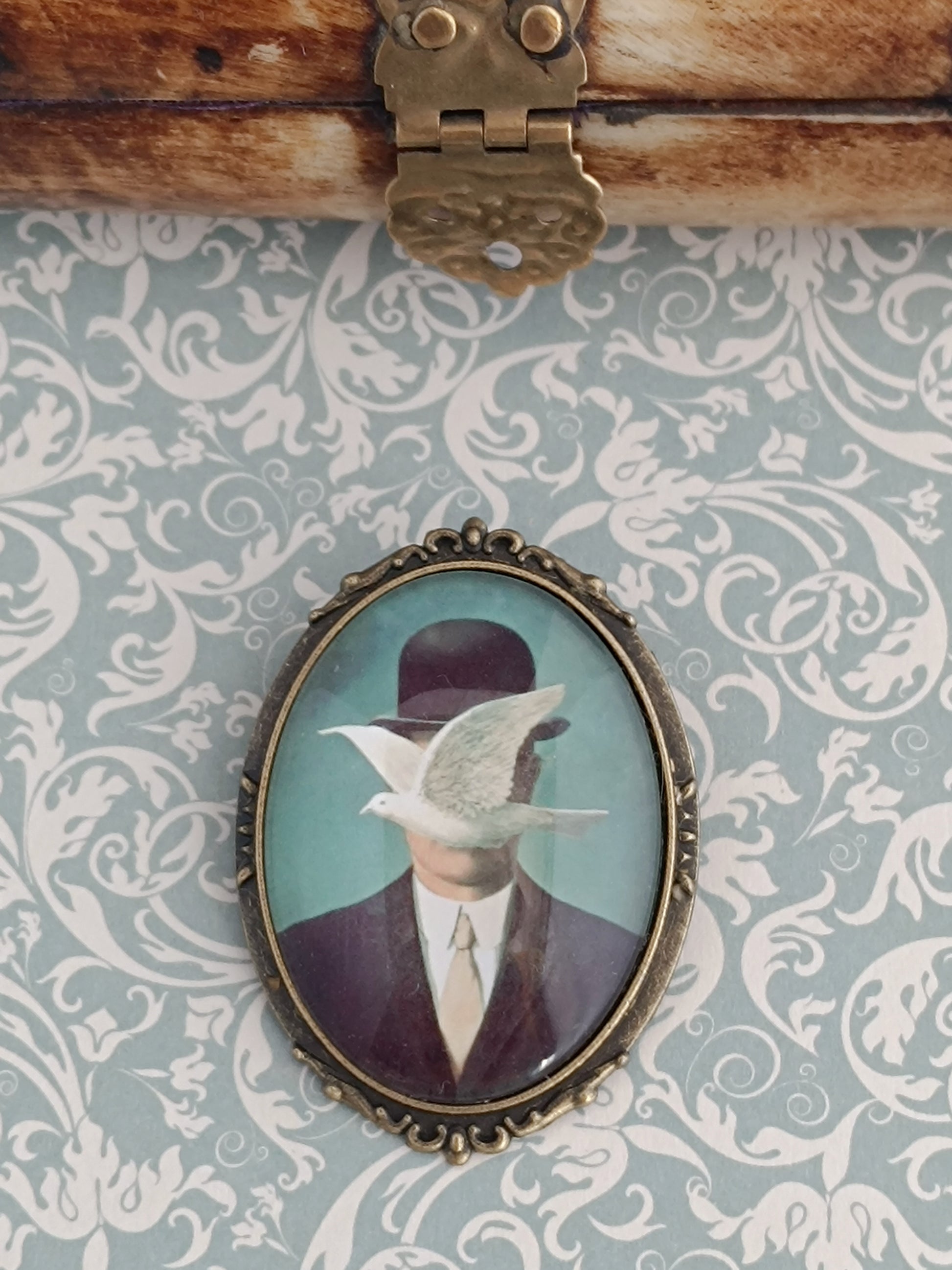 Ajoutez une touche de mystère et de poésie à votre style avec cette broche unique inspirée de l'univers surréaliste de René Magritte. Ce bijou vintage revisite l'iconique L'Homme au chapeau melon avec une élégance intemporelle.