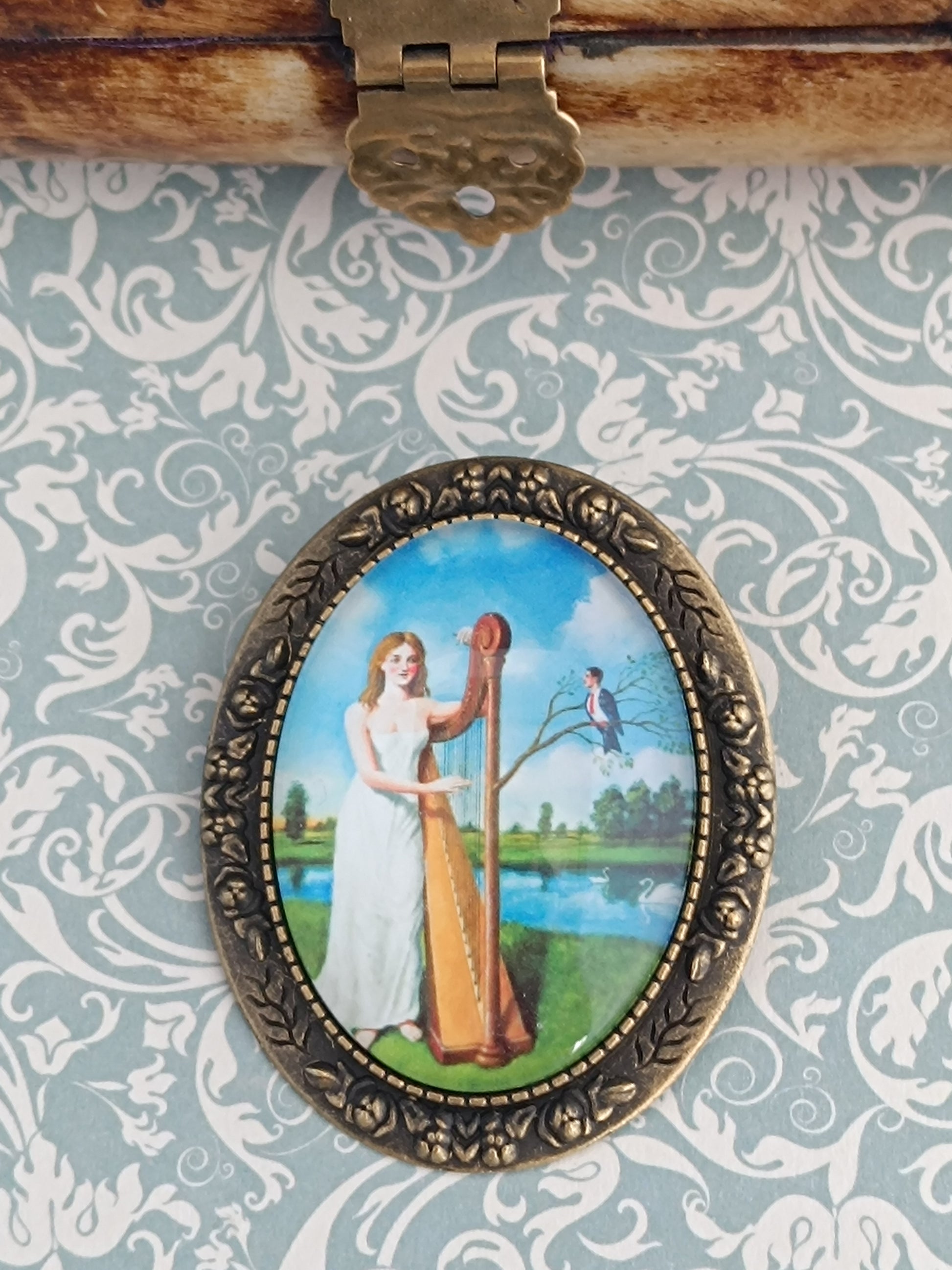 magnifique broche ornée d’un cabochon en verre illustrant une scène surréaliste captivante. Une femme joue de la harpe, enveloppée dans une atmosphère onirique, tandis qu’un homme moineau semble écouter cette mélodie intemporelle.