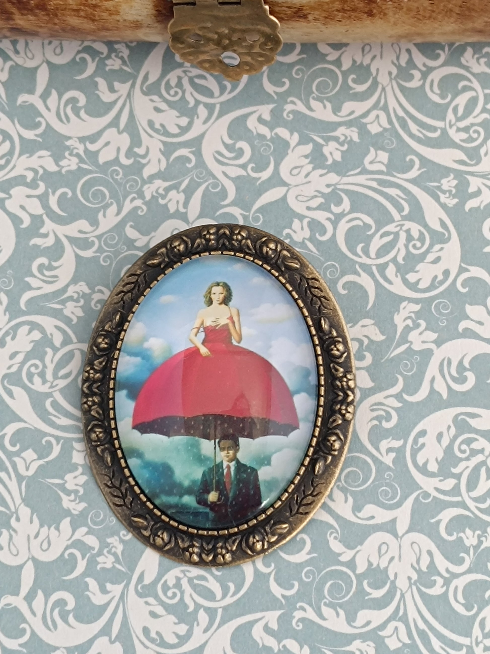 Ajoutez une touche de poésie et d’élégance surréaliste à votre tenue avec cette broche délicate inspirée de l’univers de René Magritte. Cette œuvre met en scène une femme en robe rose vive, perchée sur un grand parapluie noir tenu par un homme en costume, dans un ciel nuageux aux teintes douces et rêveuses.