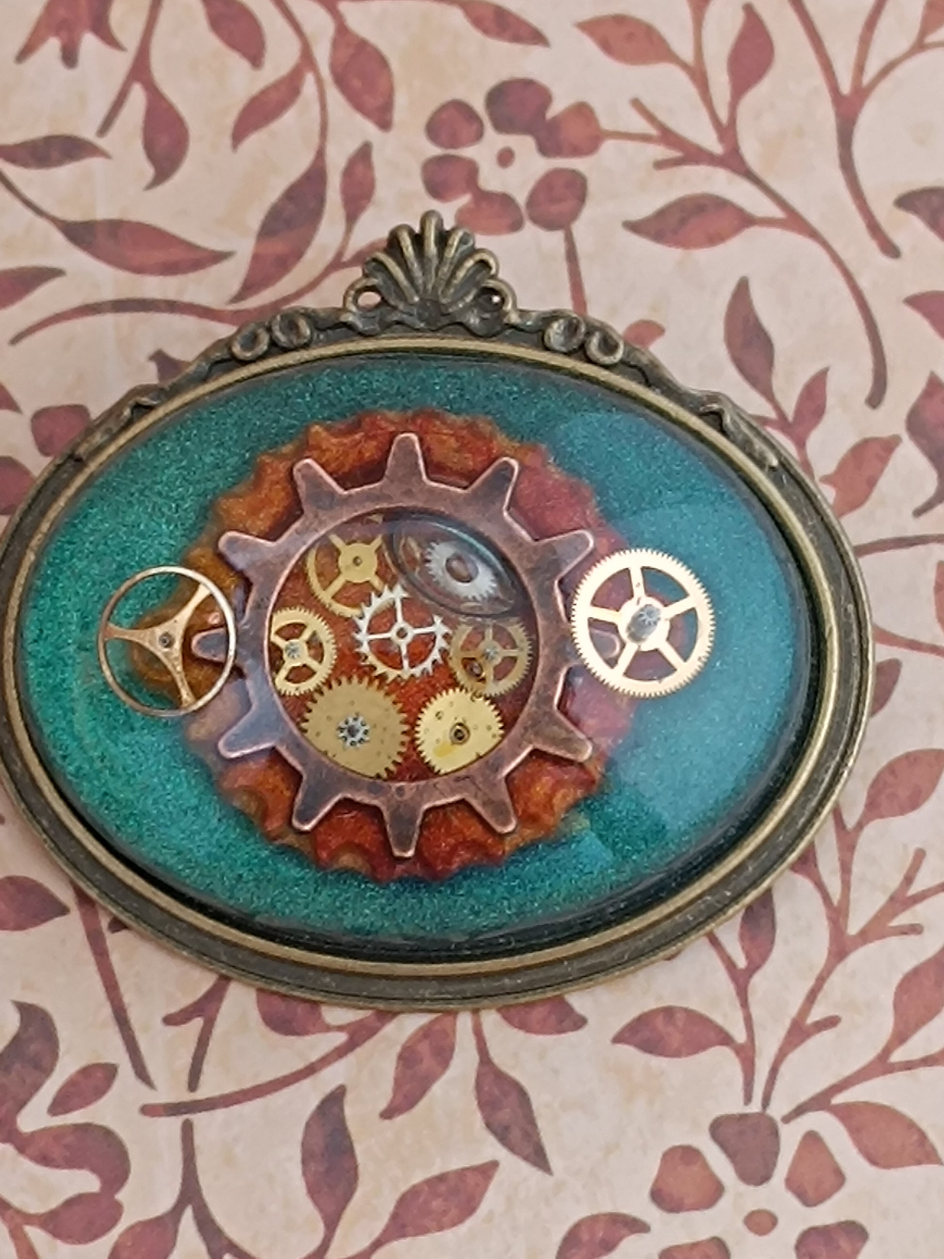 Découvrez notre broche steampunk unique, "Œil du Temps". Ce modèle original, de forme ovale et positionné horizontalement, rappelle presque la forme intrigante d'un œil. Confectionnée avec soin, cette broche est ornée de multiples engrenages de différentes tailles et couleurs, créant un motif complexe et captivant.