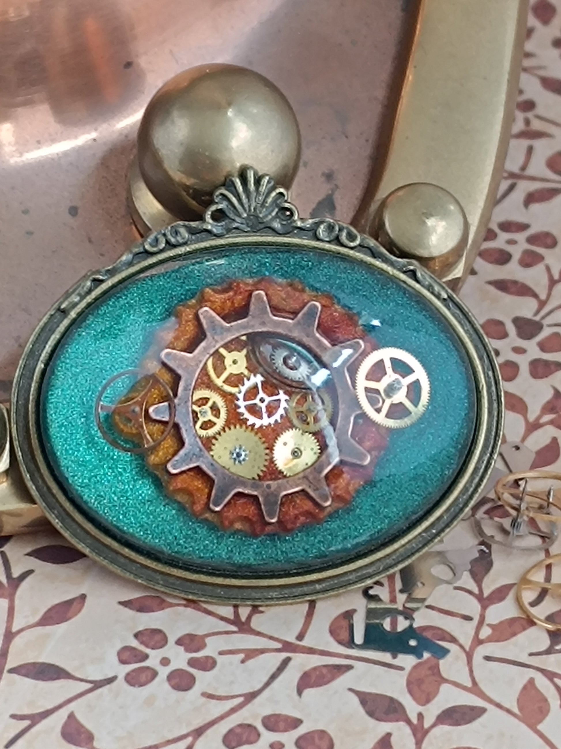 Broche Steampunk "Œil du Temps" cabochon horizontal résine époxy