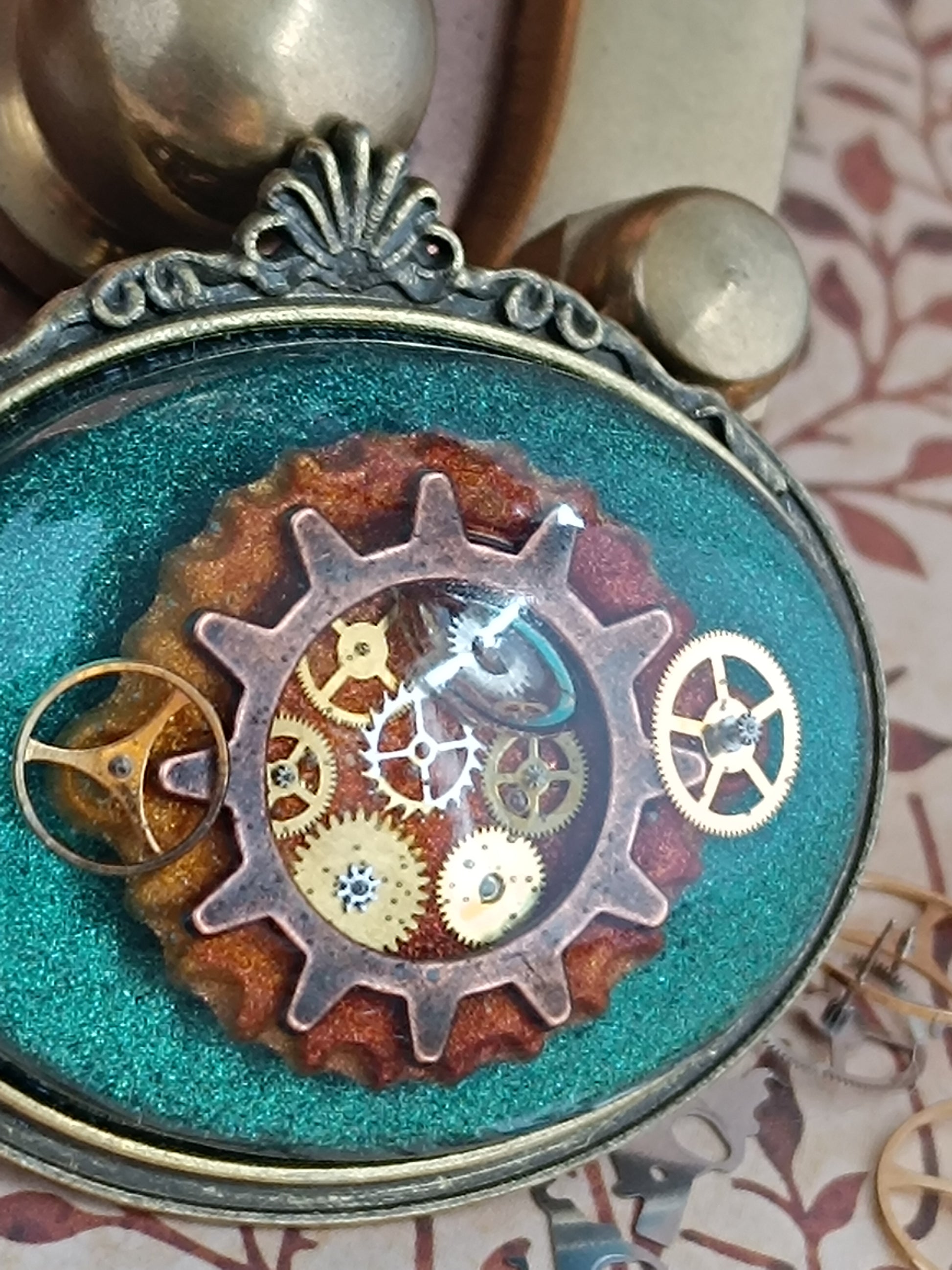 Les détails en métal doré et argenté se marient parfaitement avec le fond scintillant gris anthracite, ajoutant une touche de brillance et d'élégance à l'ensemble. Cette broche n'est pas seulement un accessoire, mais une véritable œuvre d'art qui incarne l'essence du steampunk et du vintage.
