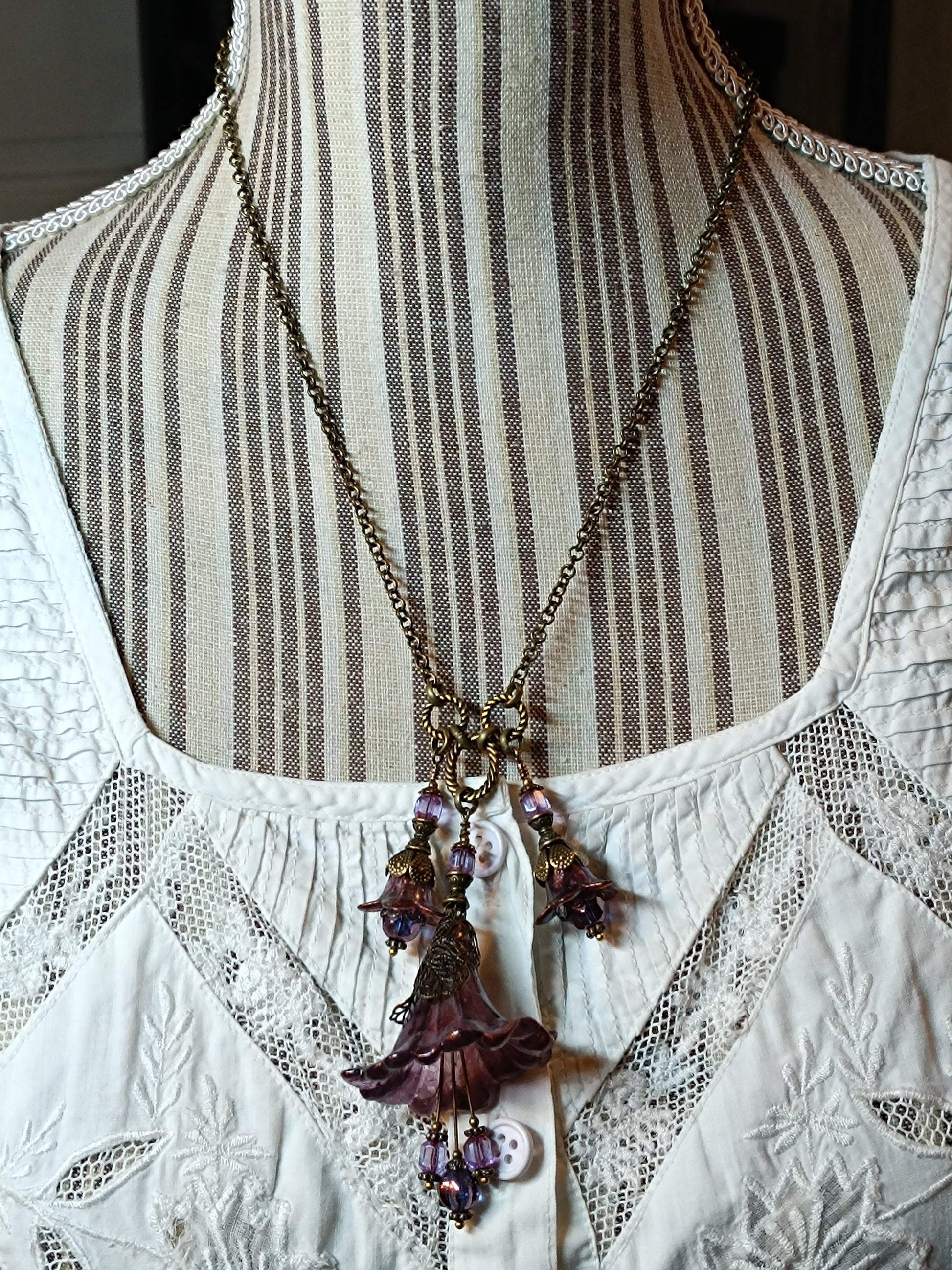 Collier Sautoir Fleurs Féeriques Améthystes - Lucite Peinte Main Bronze Antique