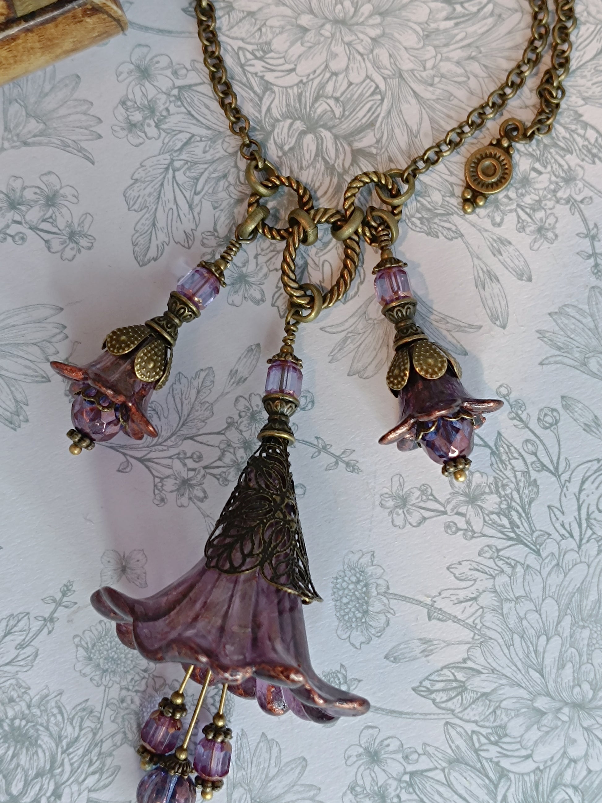 Collier sautoir fleurs féeriques améthystes – trio de clochettes peintes à la main aux reflets irisés