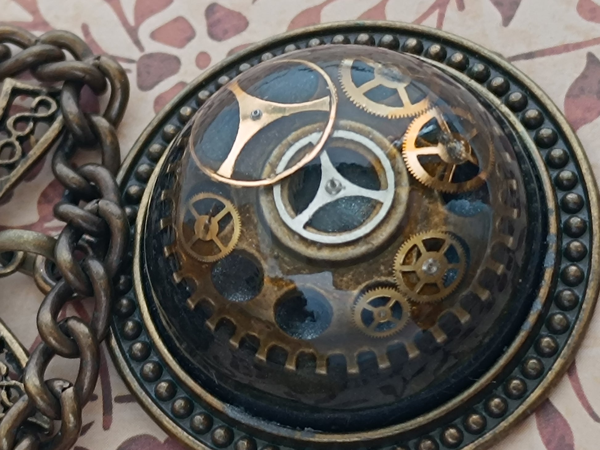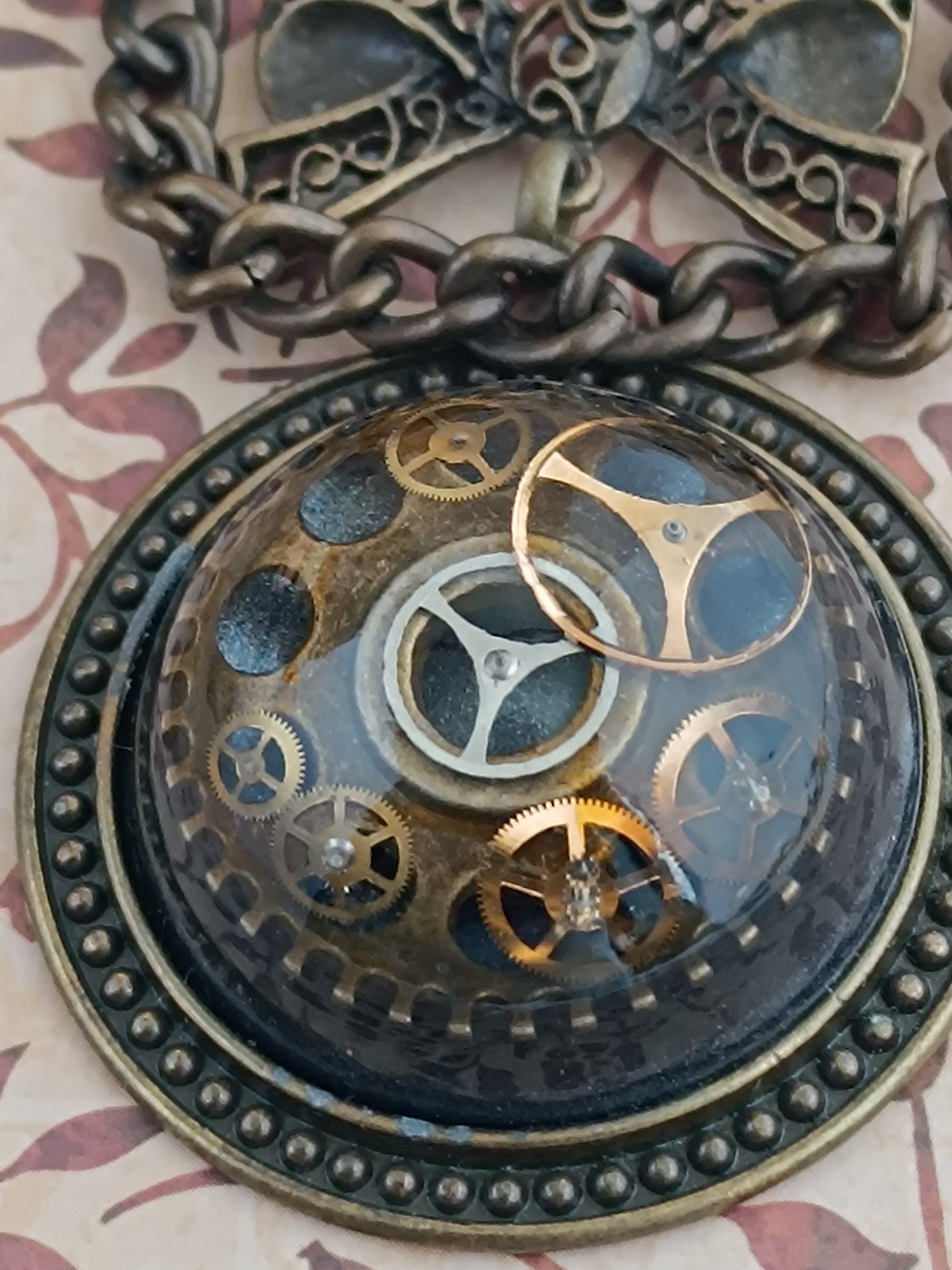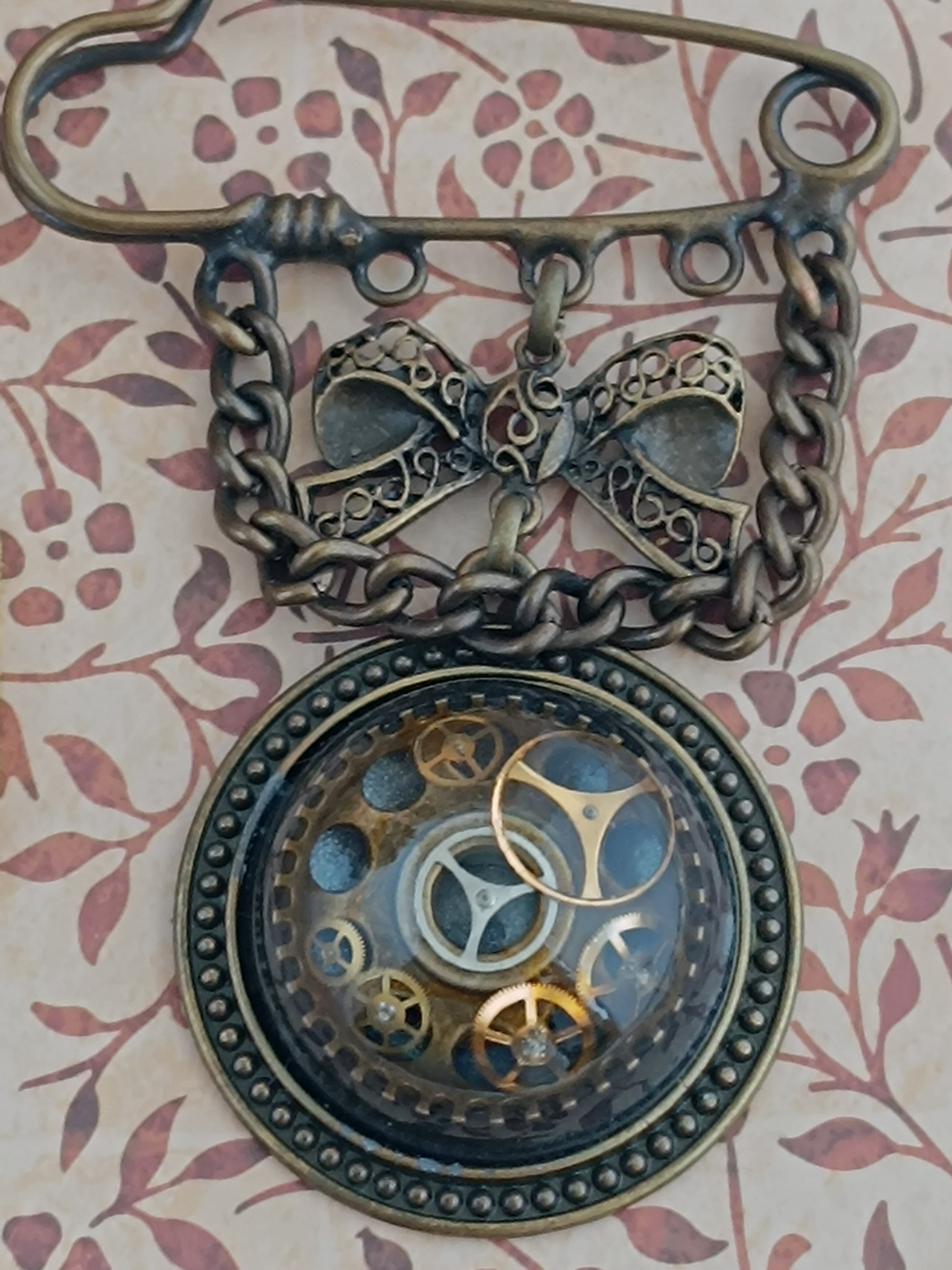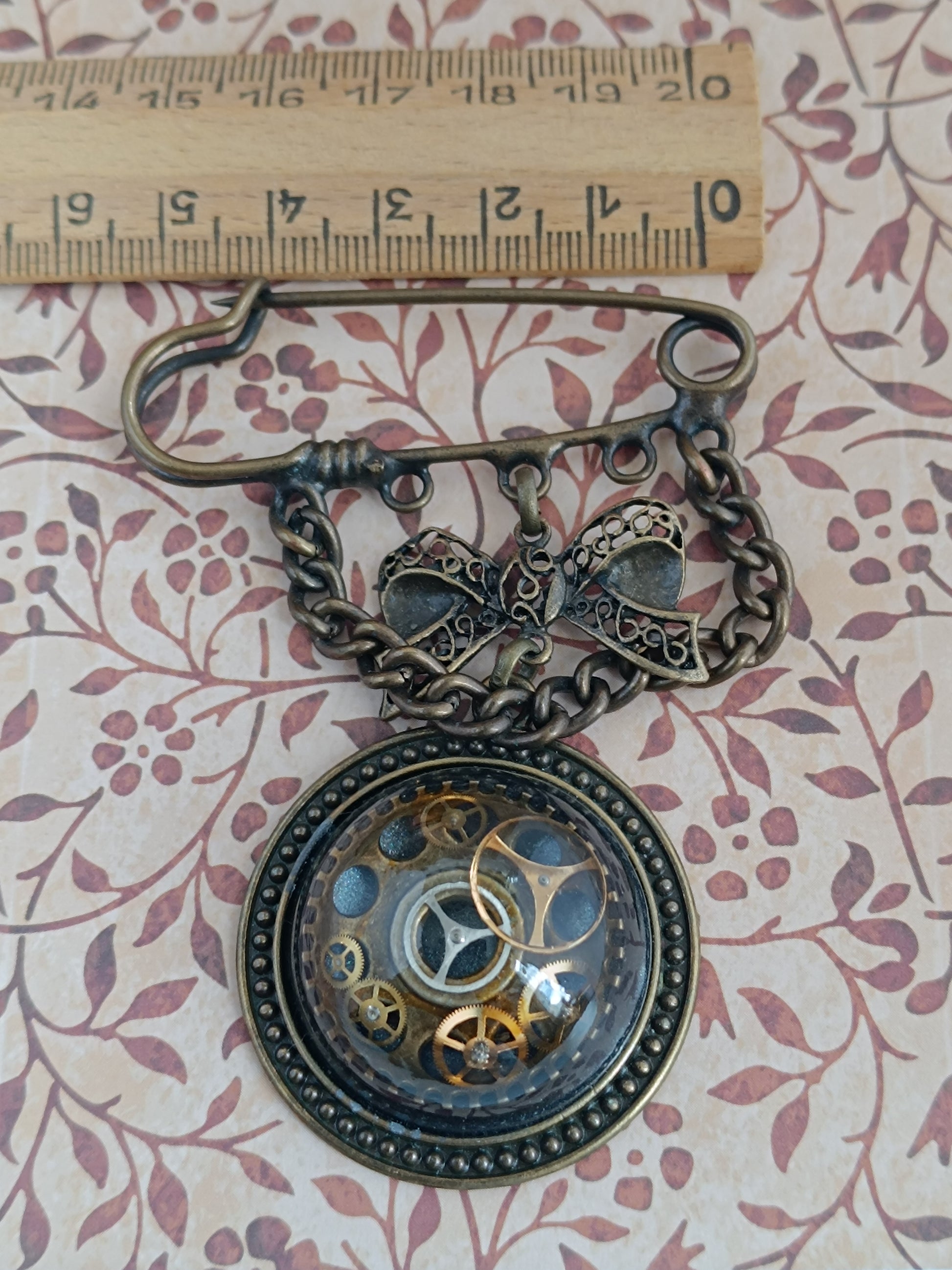 Cette pièce unique se compose d'une grande épingle de sûreté d'où pend une chaîne ornée d'un nœud décoratif. En dessous du nœud se trouve un pendentif circulaire sous un dôme de résine époxy, renfermant divers petits engrenages et pièces mécaniques, lui donnant un charme rétro et mécanique.