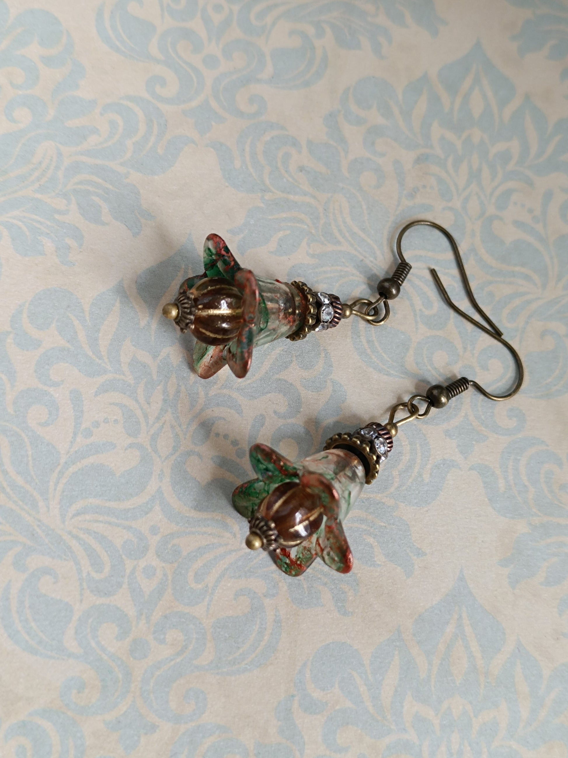 Ces petites boucles d’oreilles pendantes sont une variation plus délicate de la série “Fleurs Féeriques” : pensées pour celles qui aiment les bijoux floraux tout en finesse. Chaque fleur, en lucite vintage peinte et vernie à la main, dévoile des nuances de vert mousse, cuivre rosé et touches de rose ancien, comme un bouton prêt à éclore.