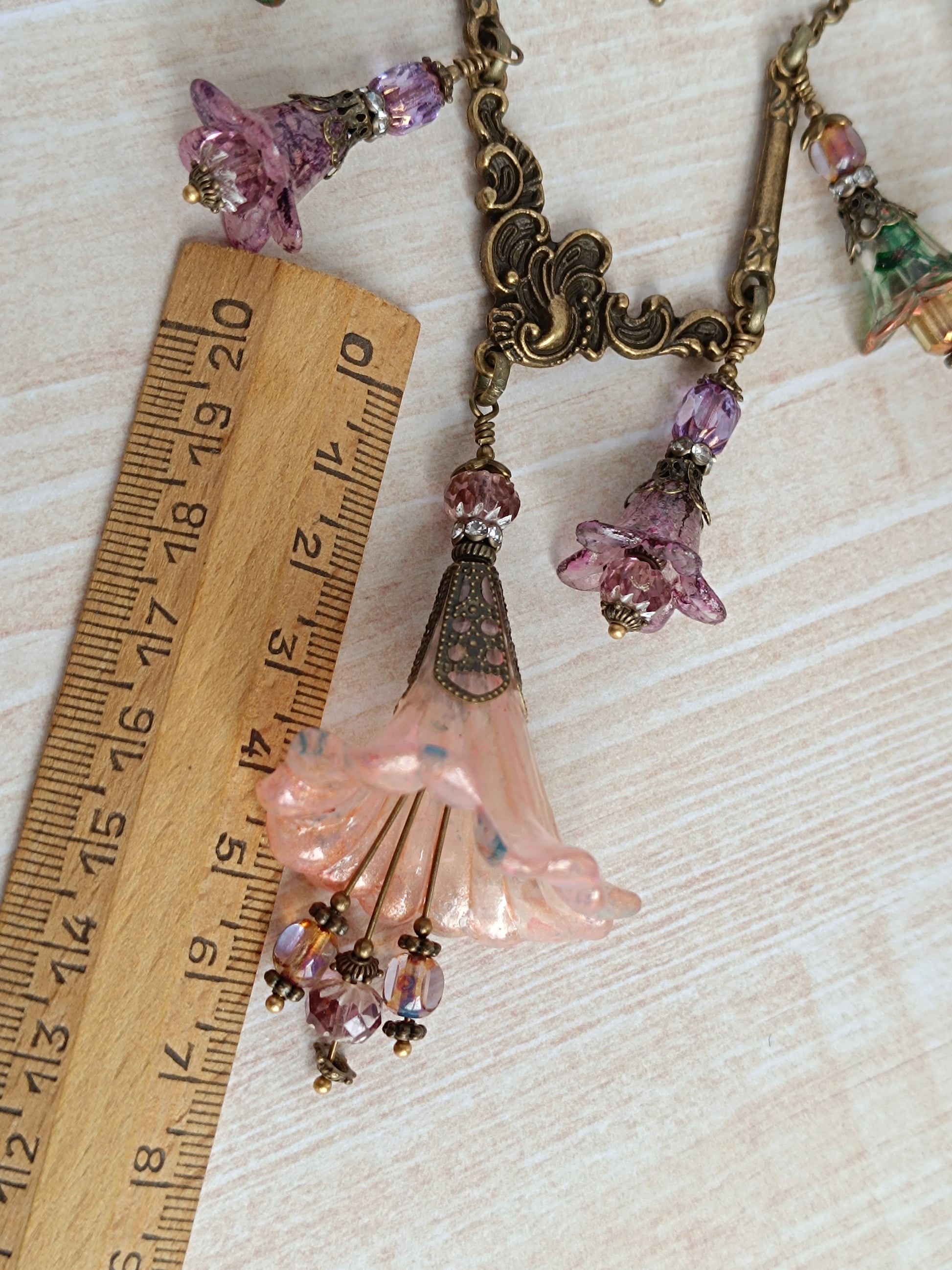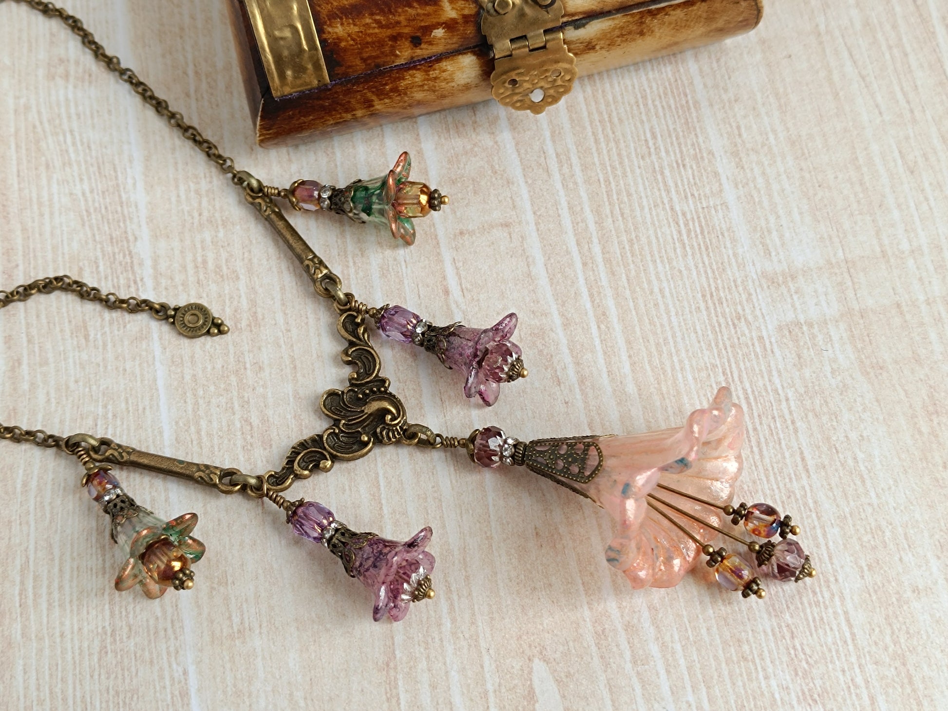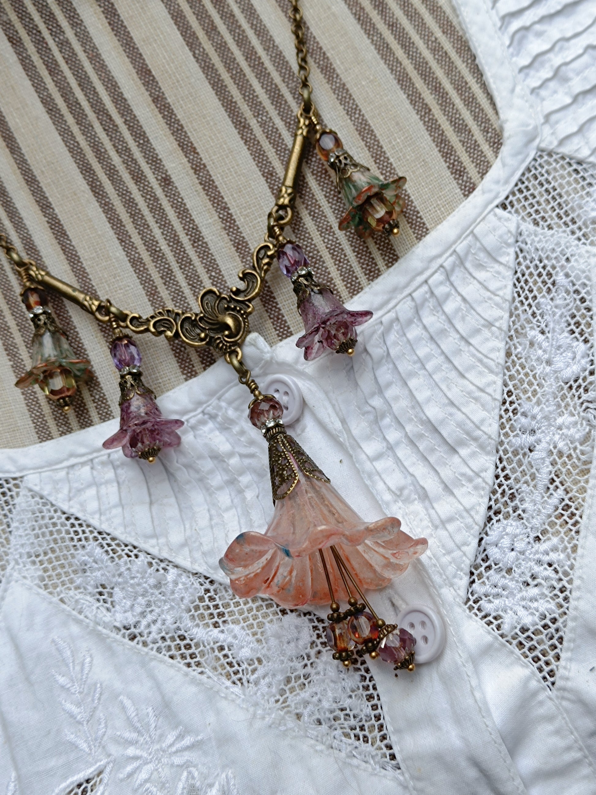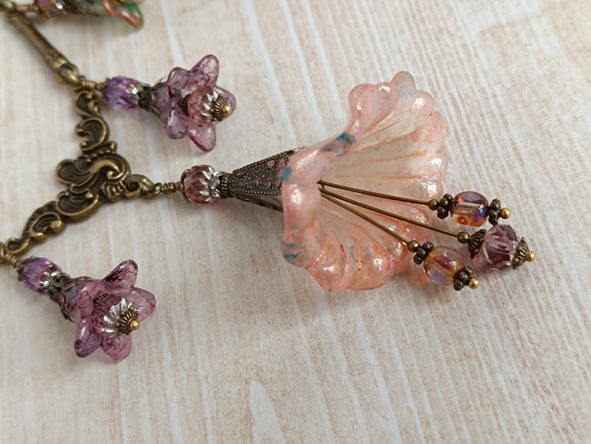 Rêveries Florales Collier fairycore romantique en bronze antique, fleurs lucite peintes main, perles lanternes verre tchèque