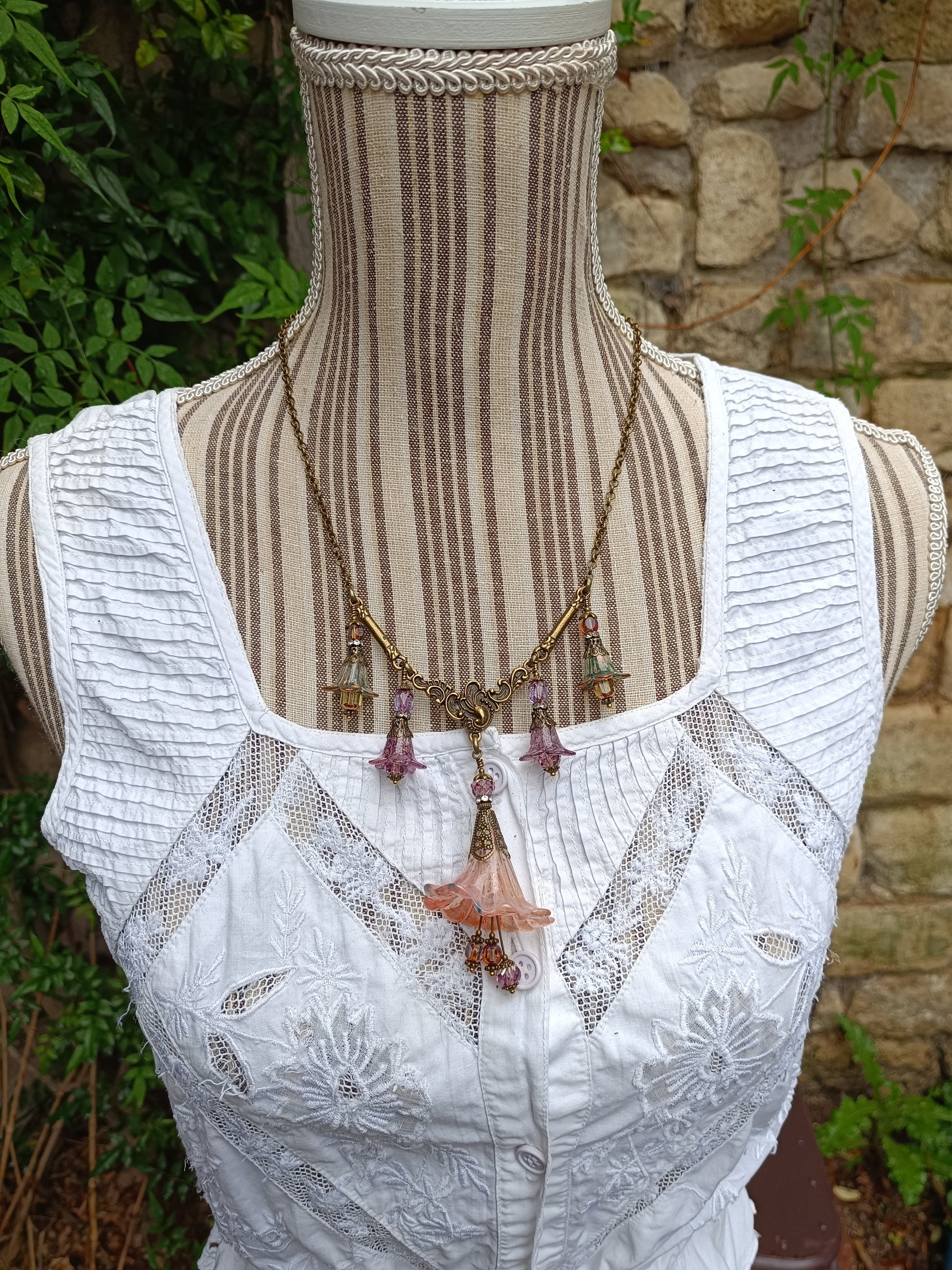 La fleur centrale, véritable pièce maîtresse du collier, mesure 4 cm de large sur 8 cm de long, attirant le regard avec grâce et raffinement. De sublimes perles lanternes en verre tchèque facetté apportent éclat et poésie à l'ensemble, captant la lumière à chaque mouvement.