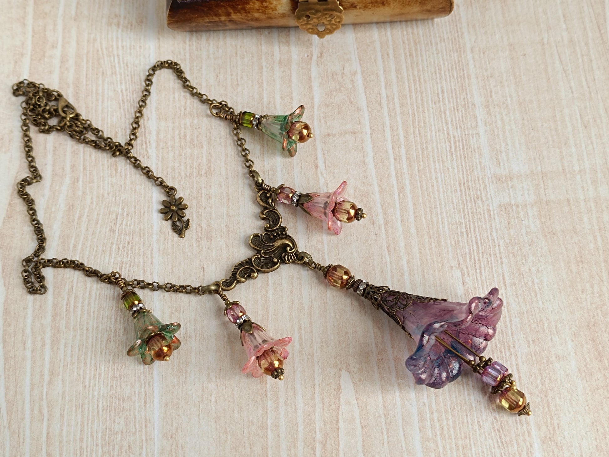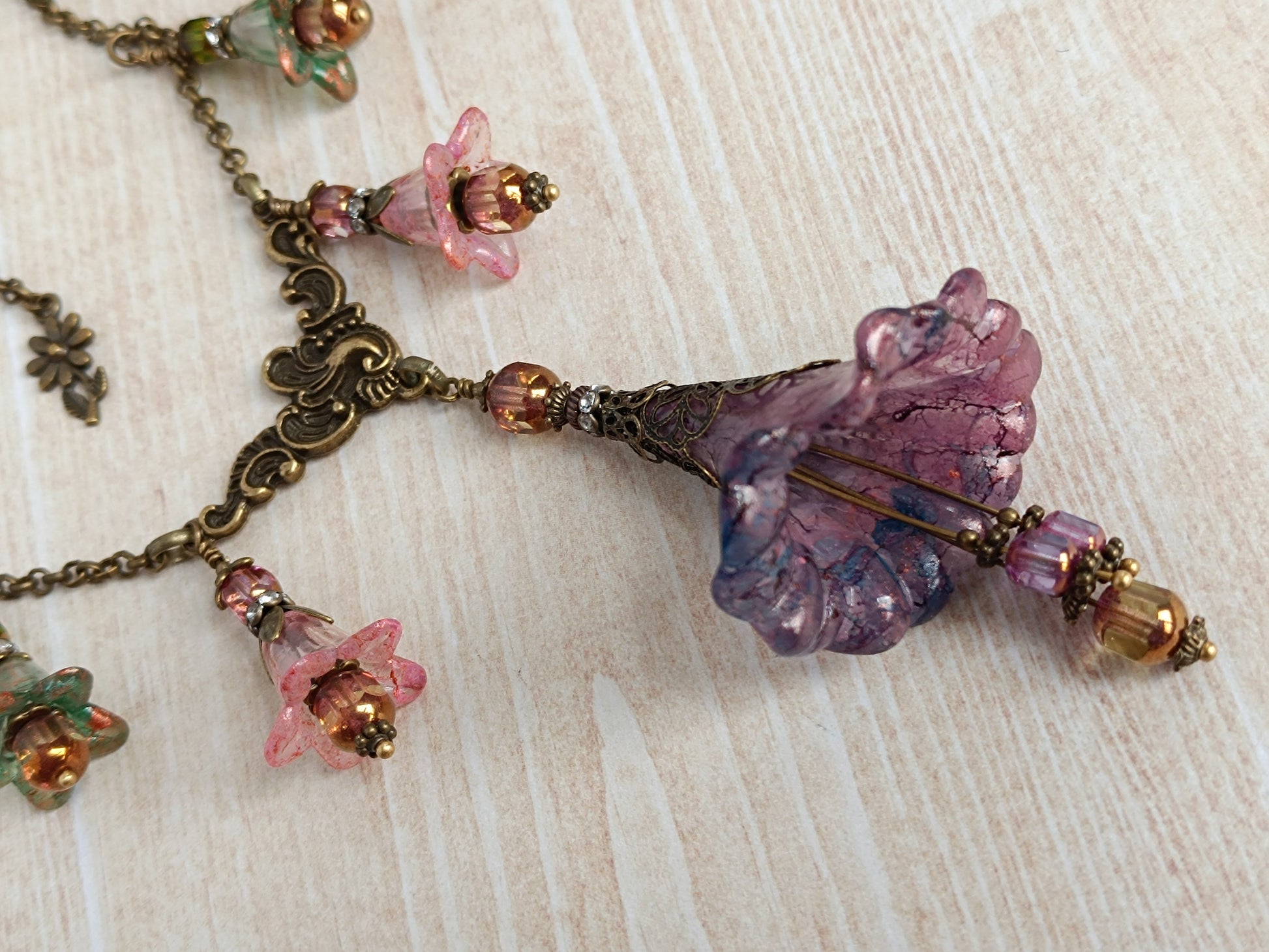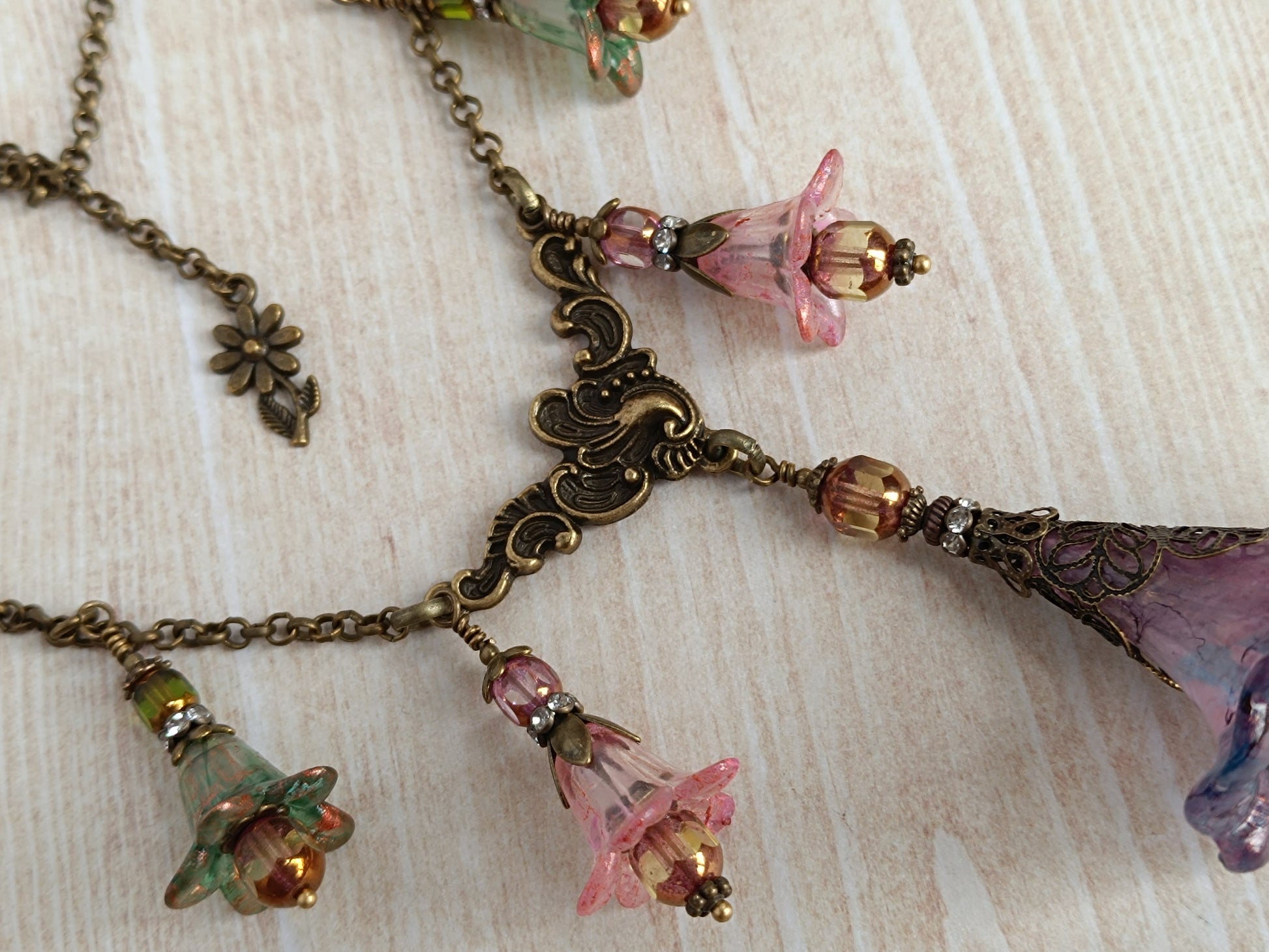 Rêveries Florales Collier fairycore romantique en bronze antique, fleurs lucite peintes main, perles lanternes verre tchèque