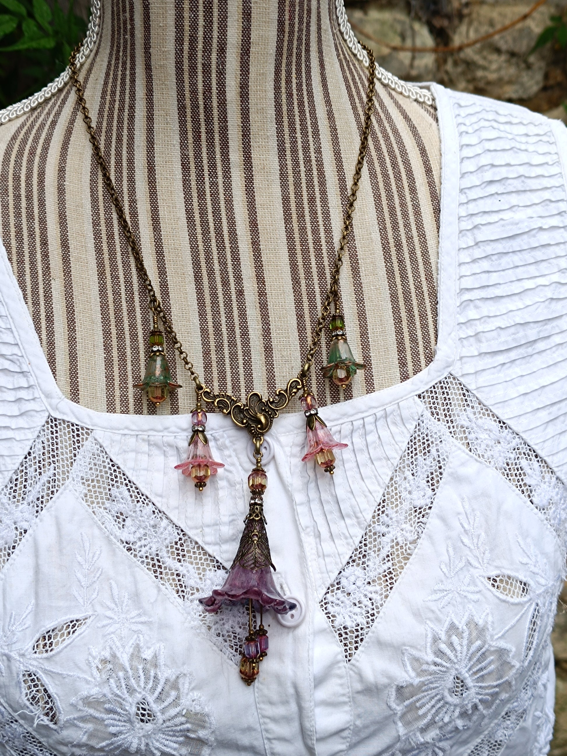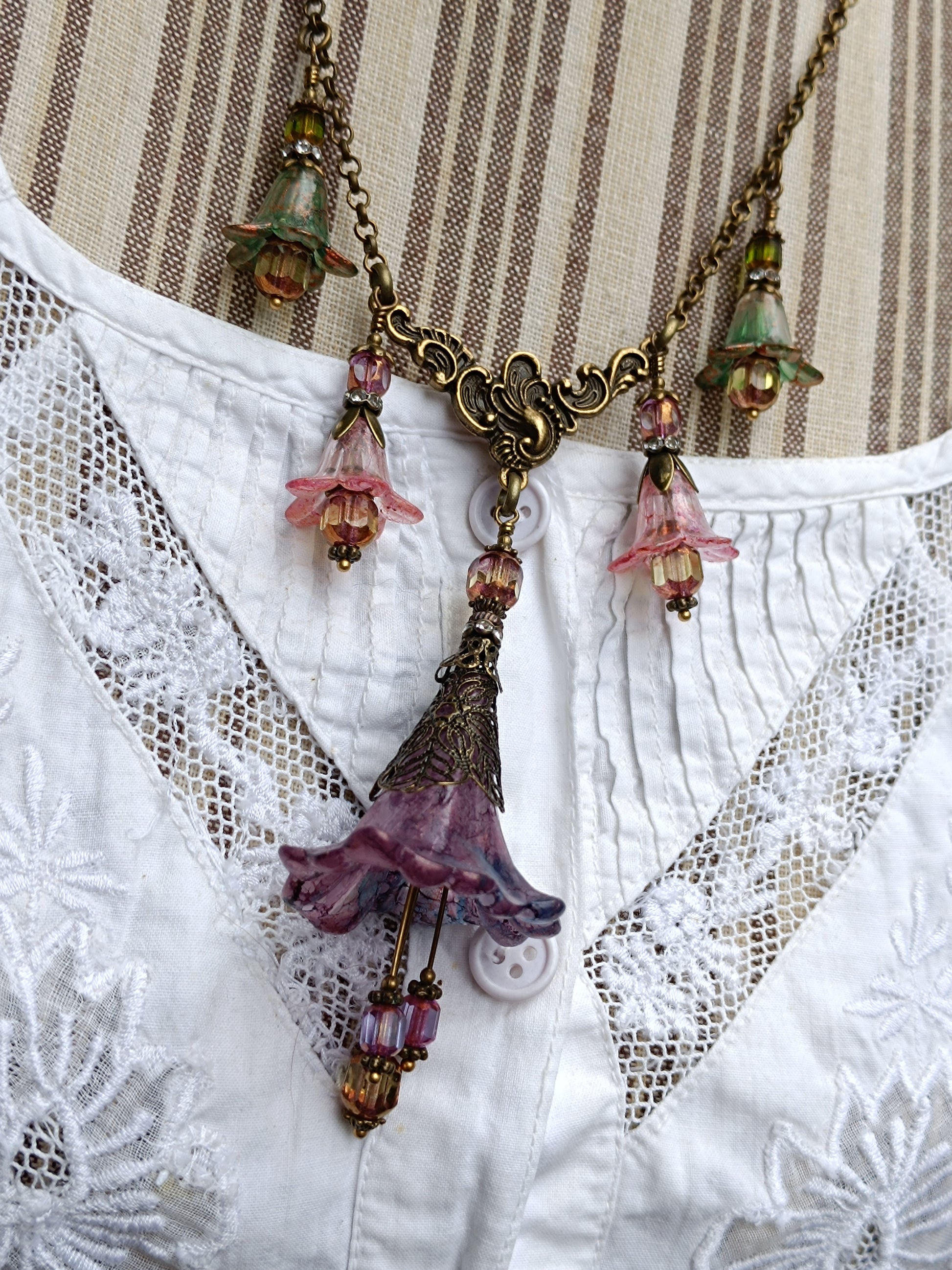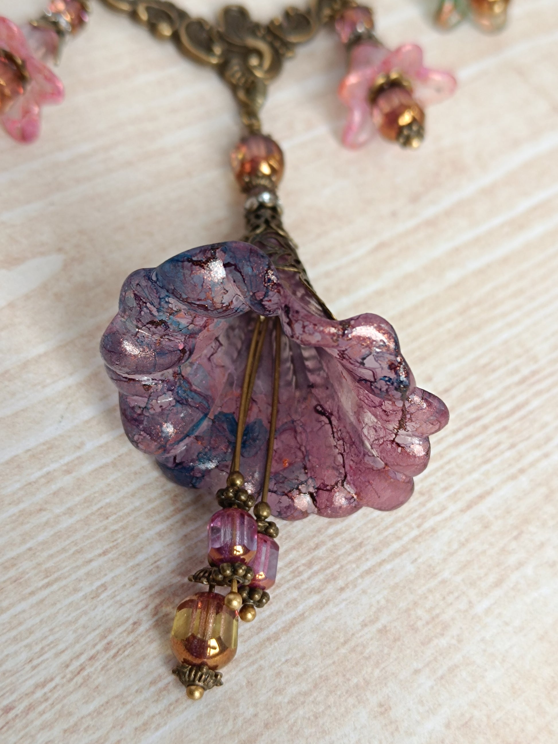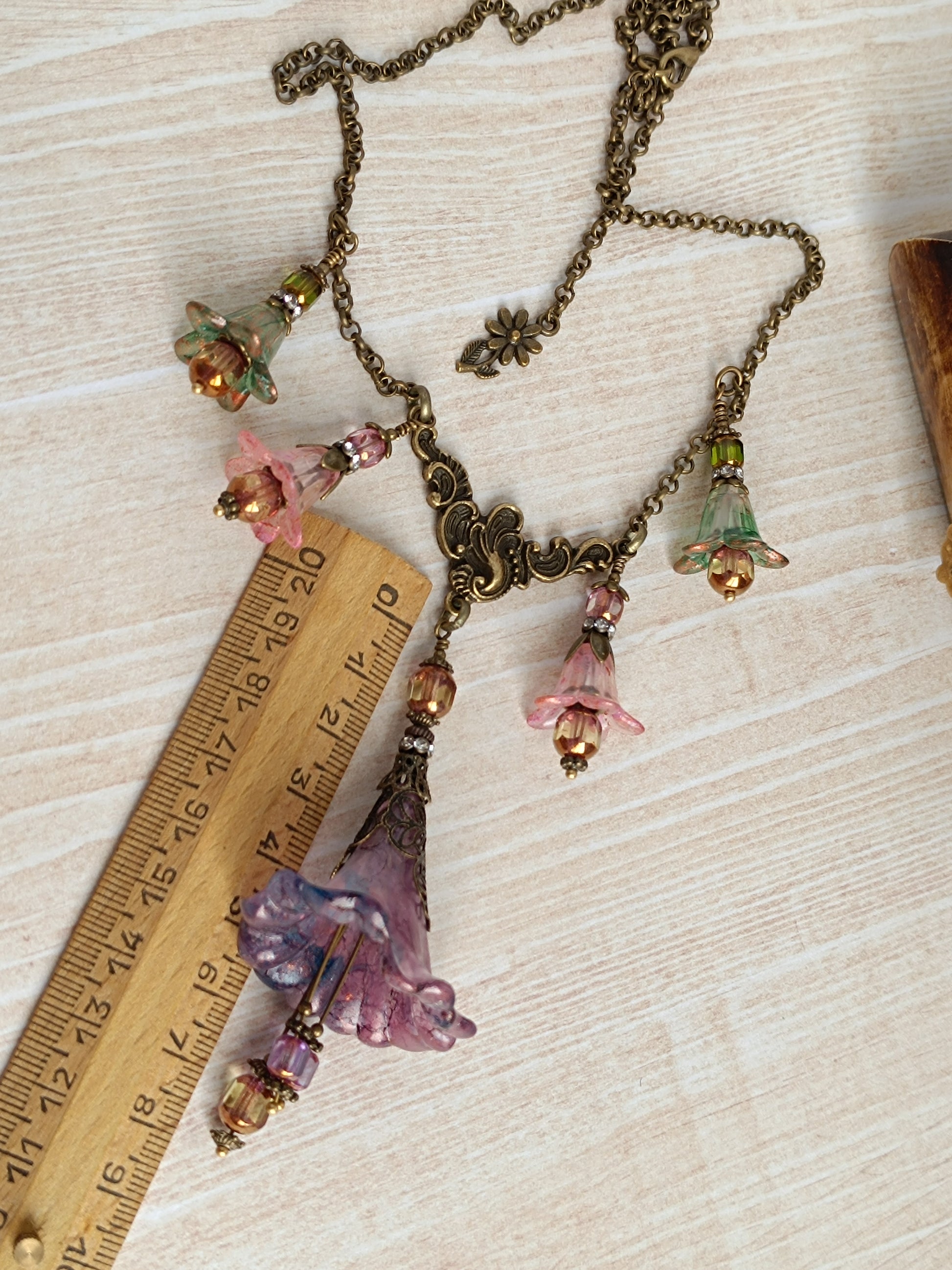 Rêveries Florales Collier fairycore romantique en bronze antique, fleurs lucite peintes main, perles lanternes verre tchèque