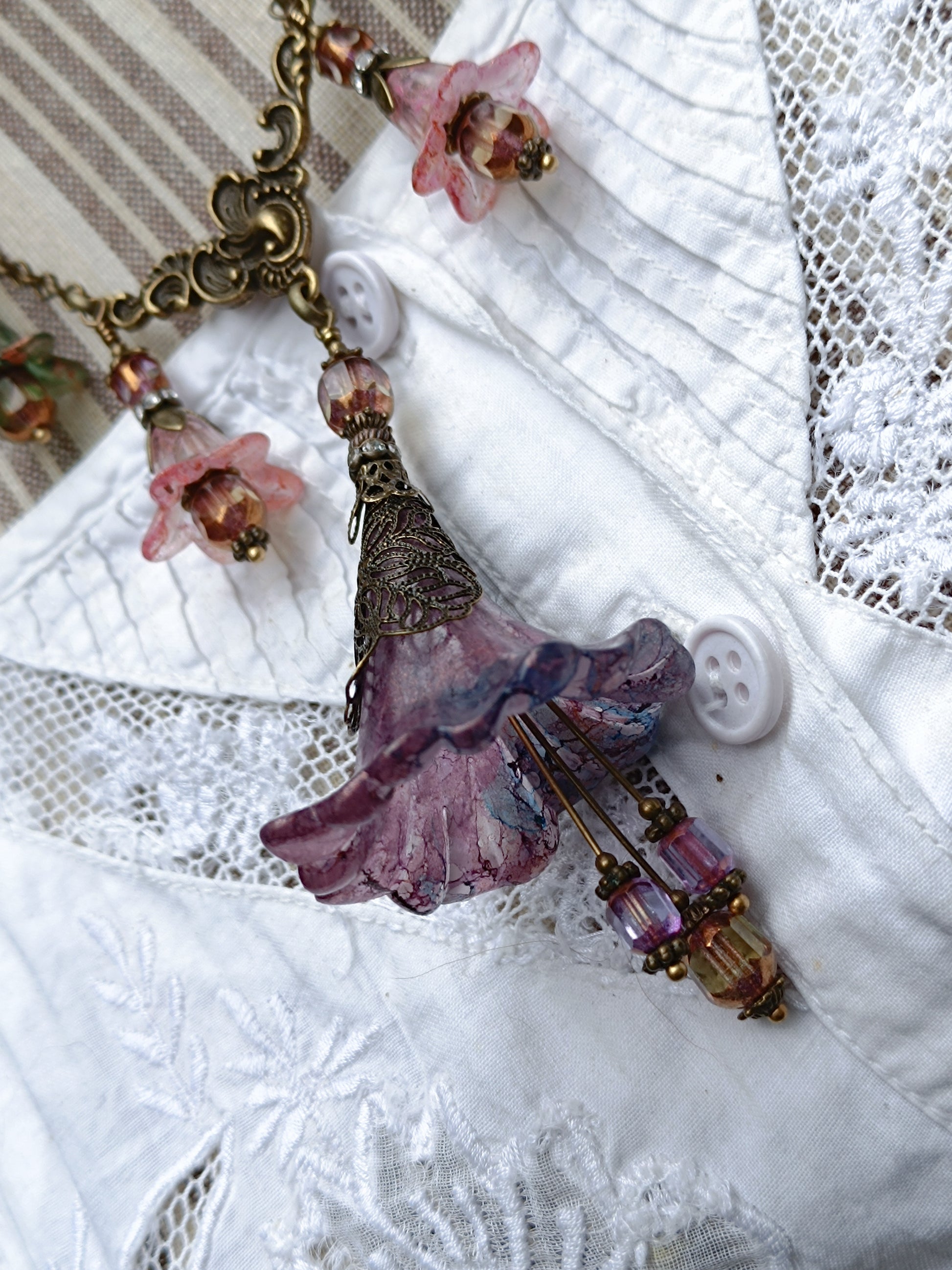 La fleur centrale, véritable pièce maîtresse du collier, mesure 4 cm de large sur 8 cm de long, attirant le regard avec grâce et raffinement. De sublimes perles lanternes en verre tchèque facetté apportent éclat et poésie à l'ensemble, captant la lumière à chaque mouvement.