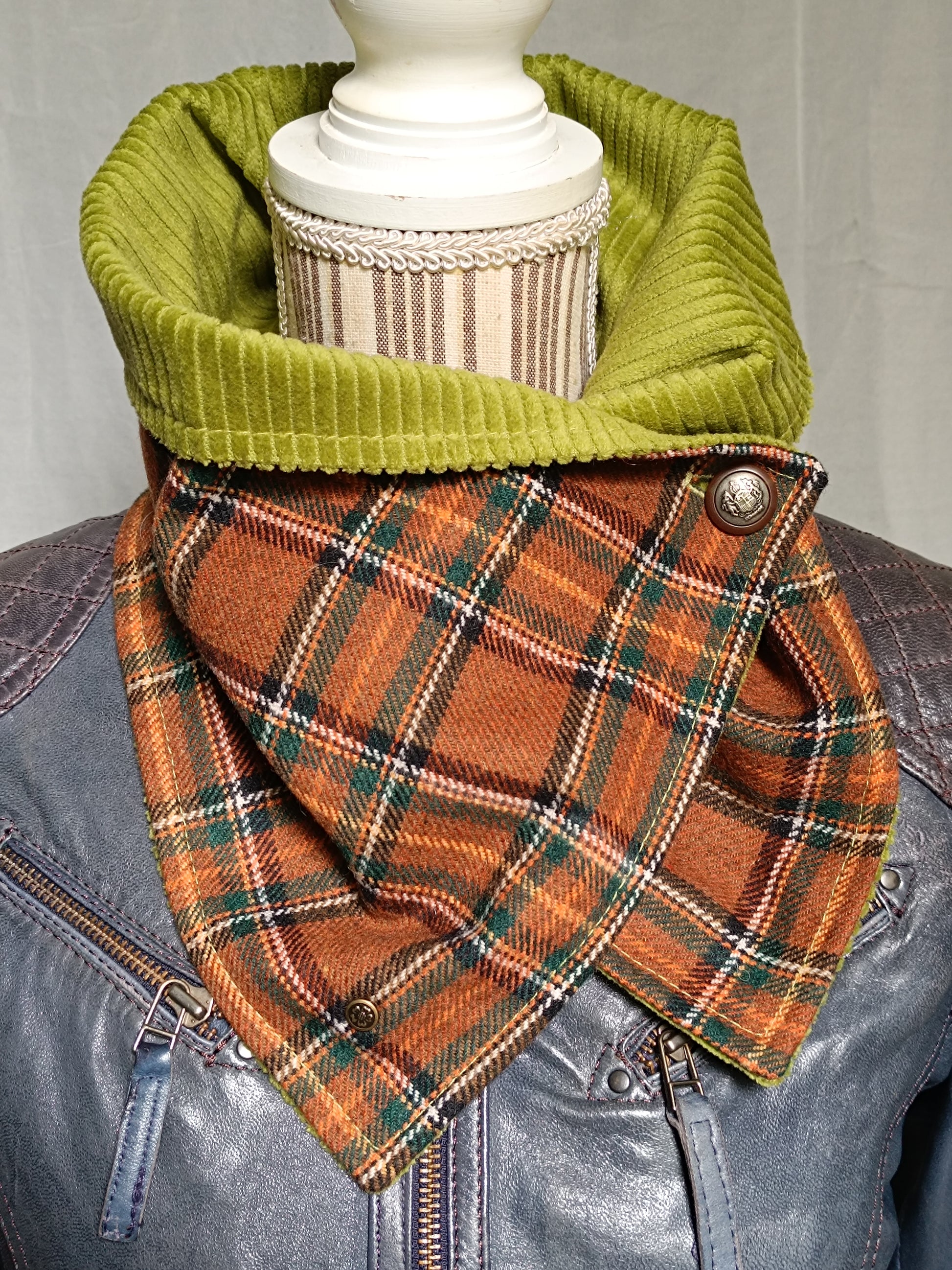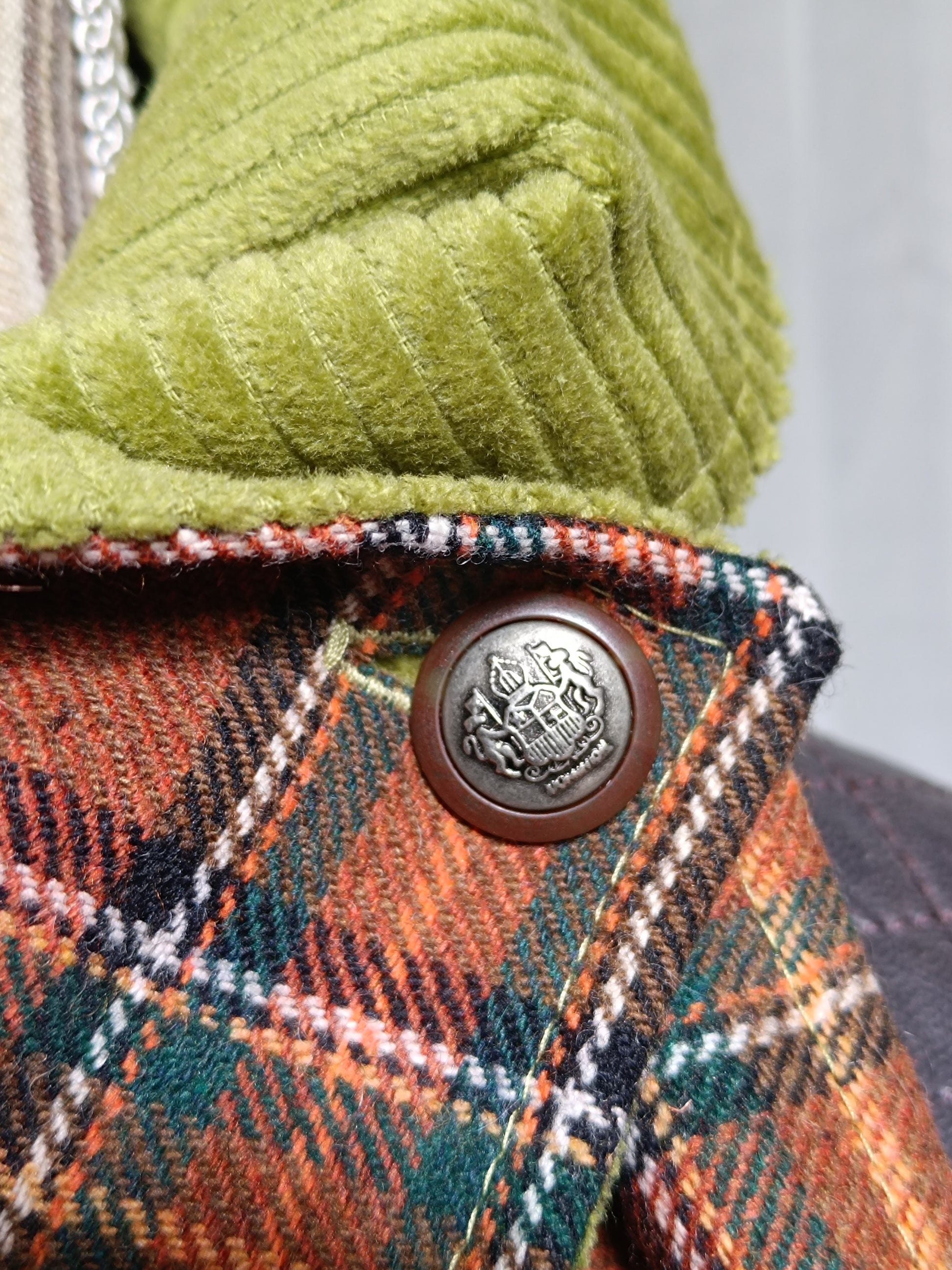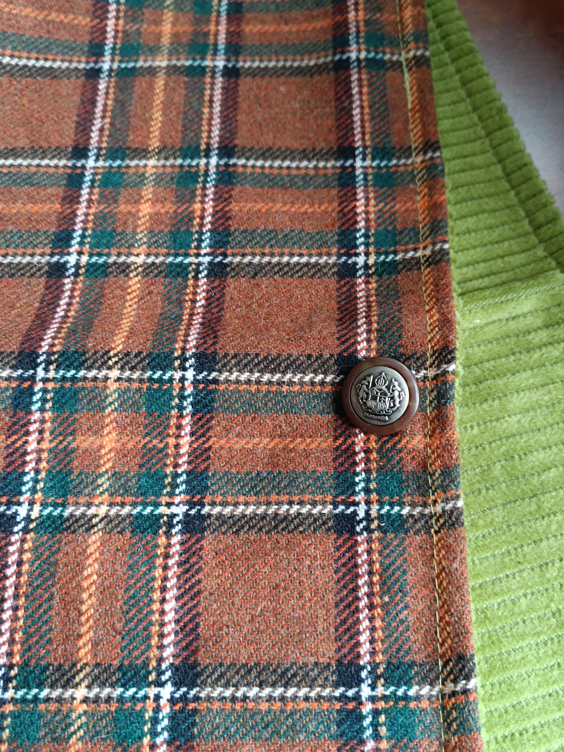 Tour tartan écossais lainage marron doublé velours vert et bouton ancien