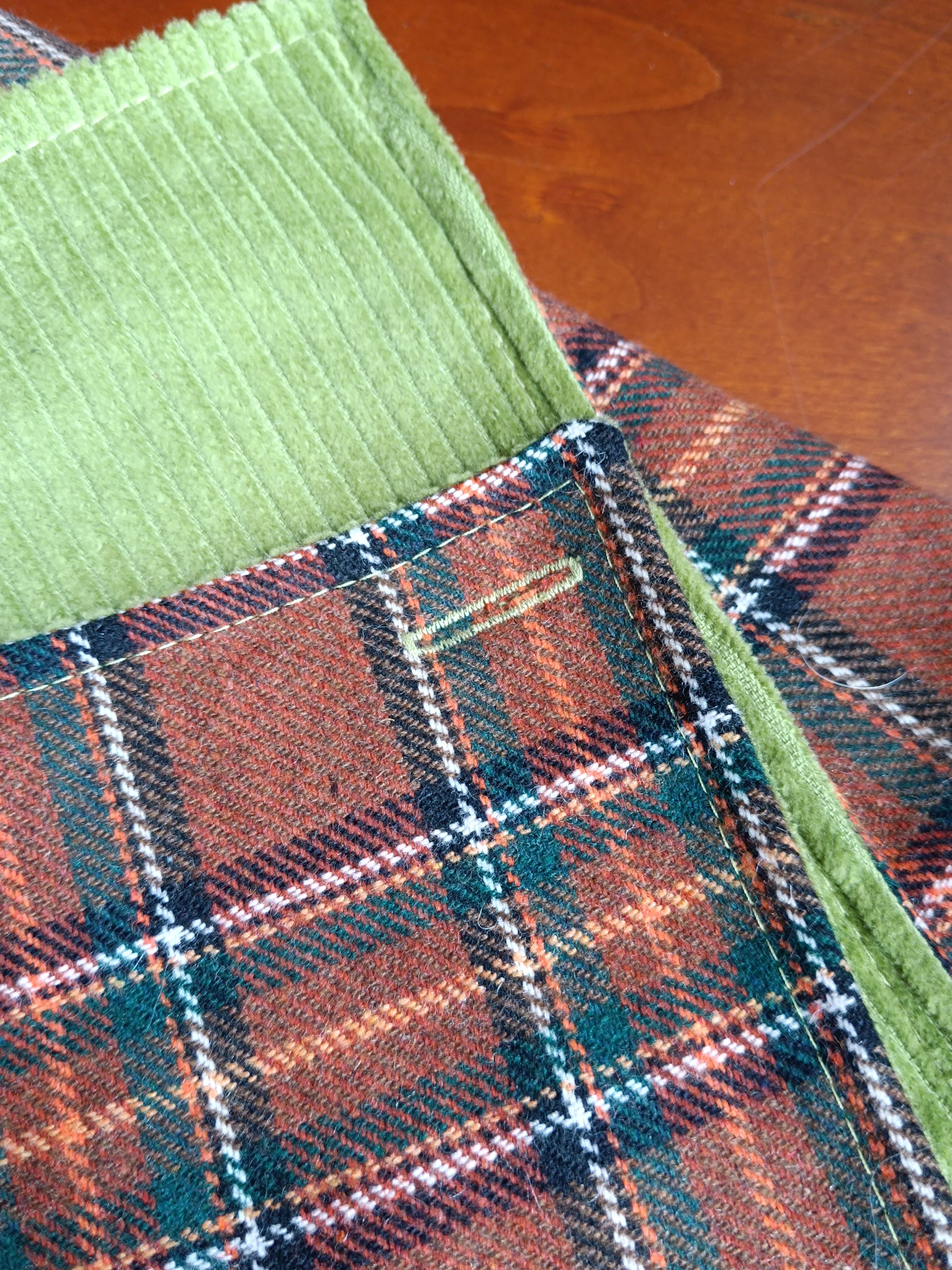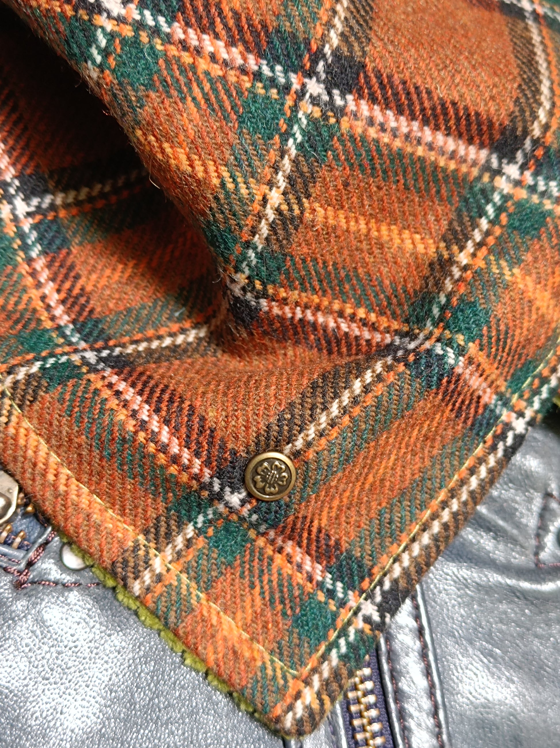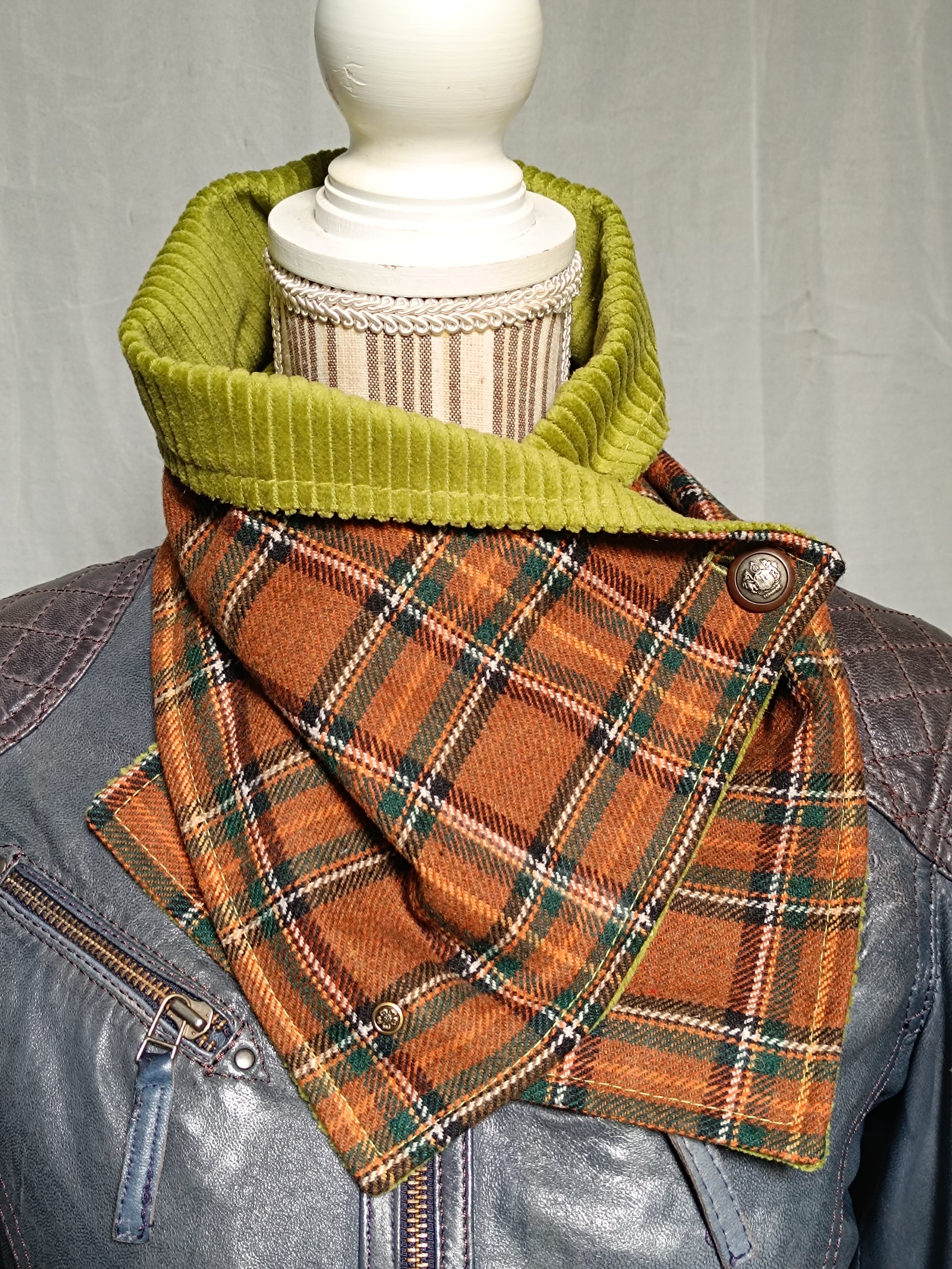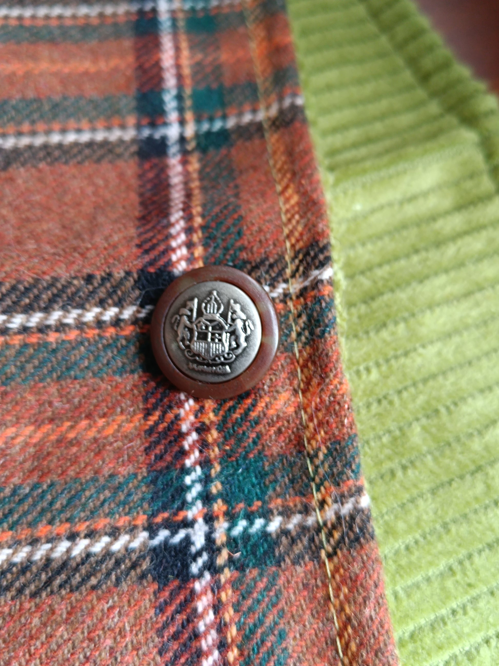 Tour tartan écossais lainage marron doublé velours vert et bouton ancien