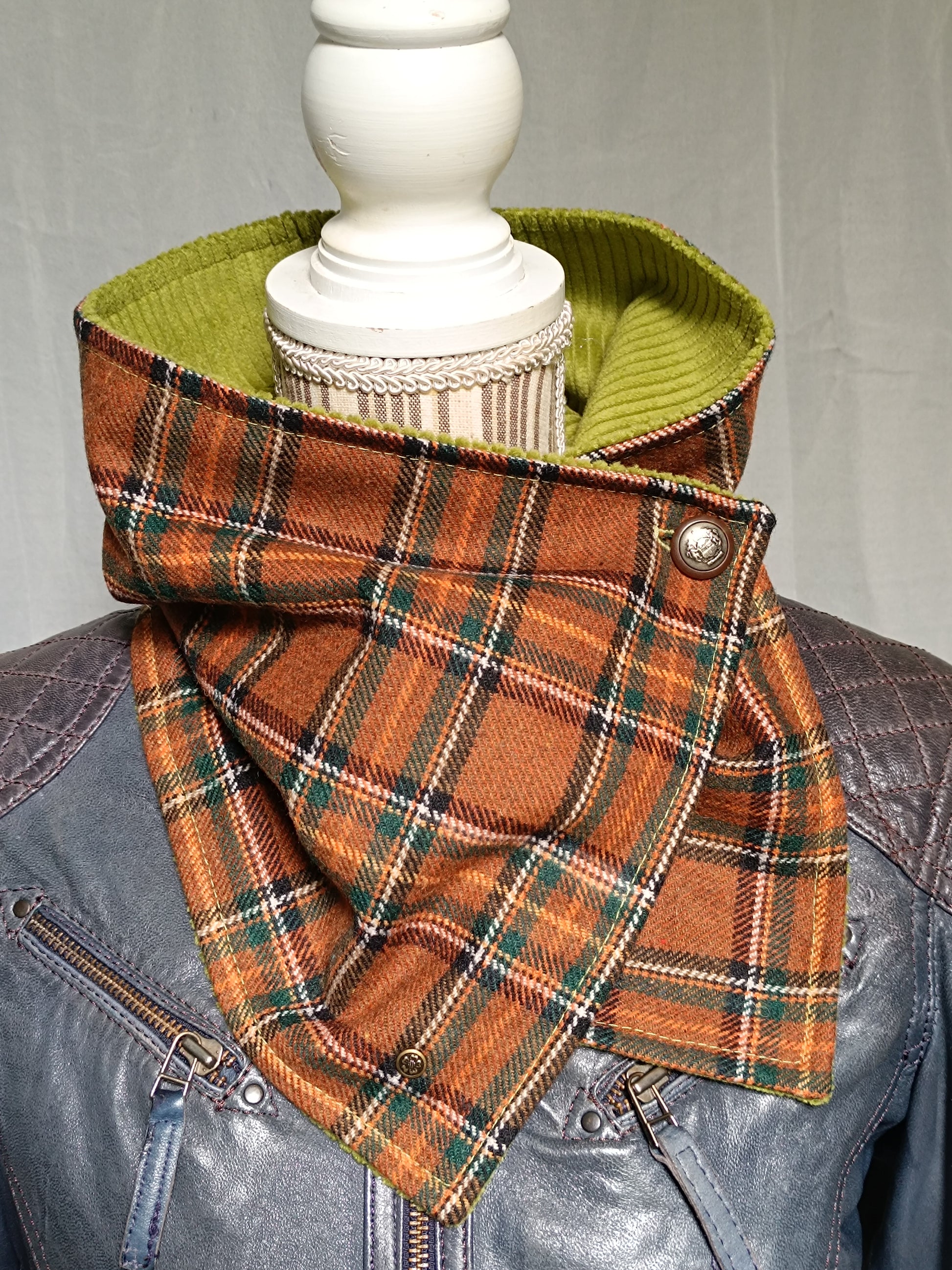 Découvrez ce magnifique tour de cou en lainage marron aux motifs tartan écossais traditionnels, sublimé par une doublure en velours vert pour un confort optimal.