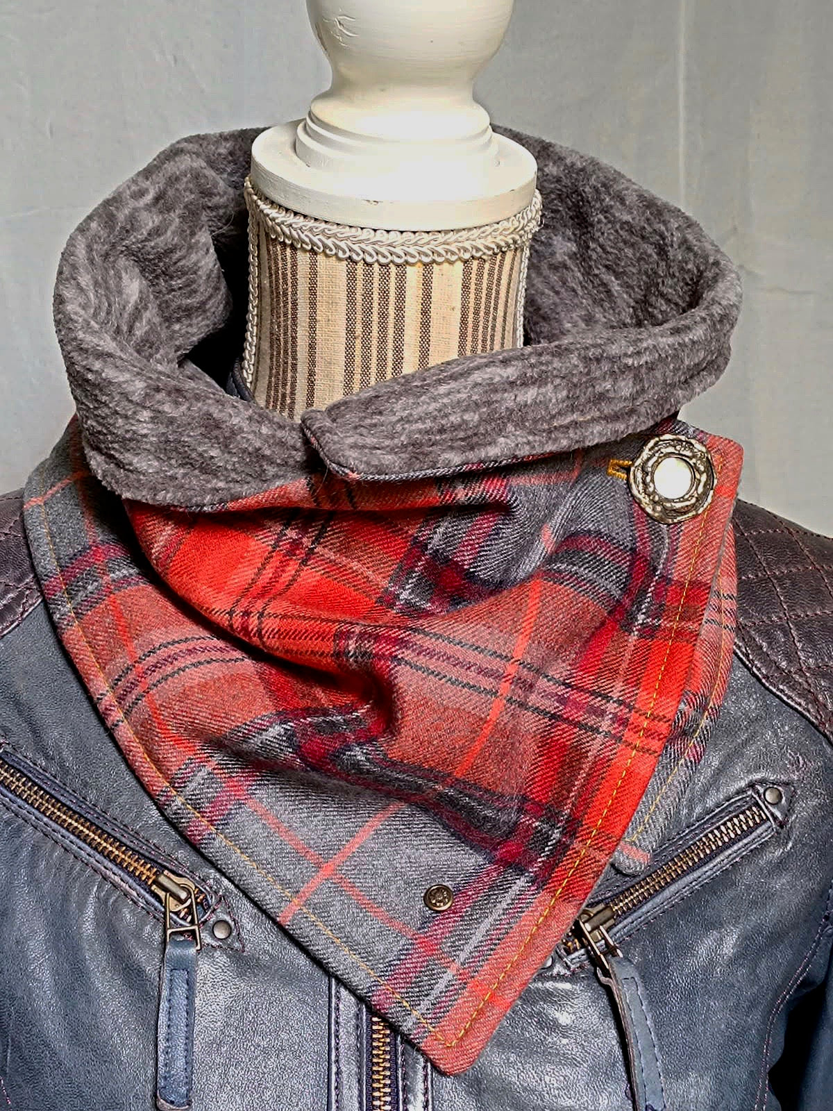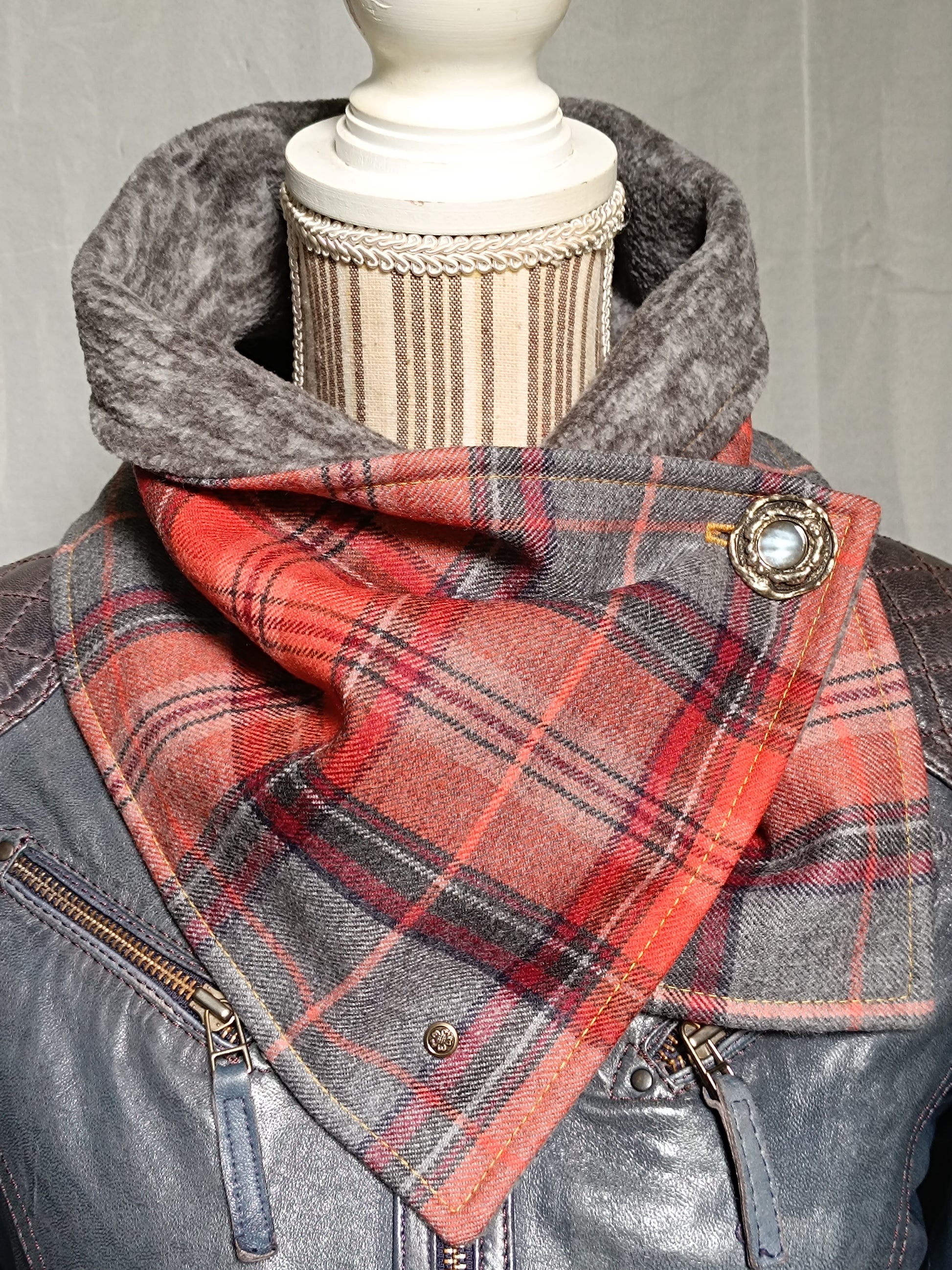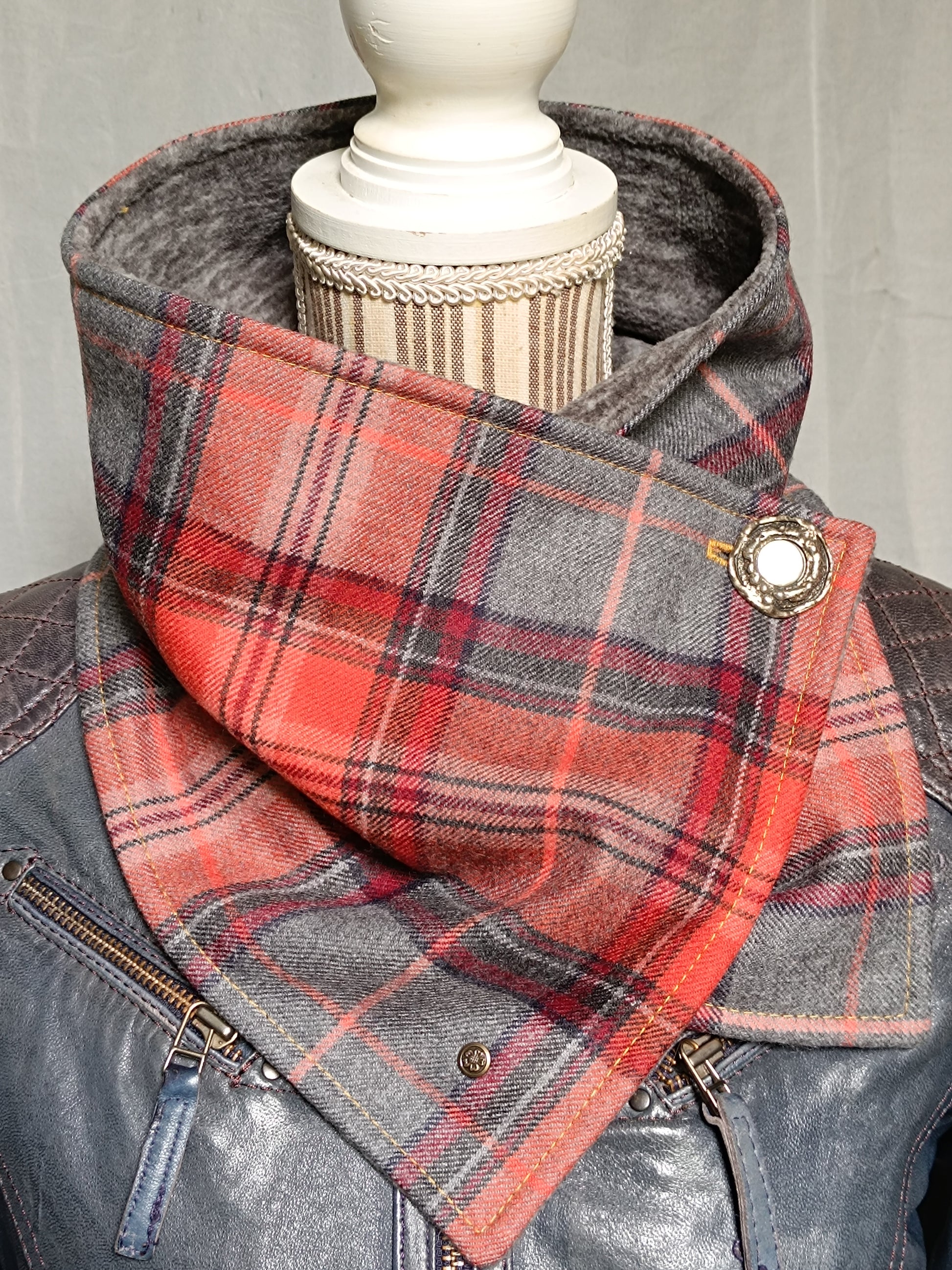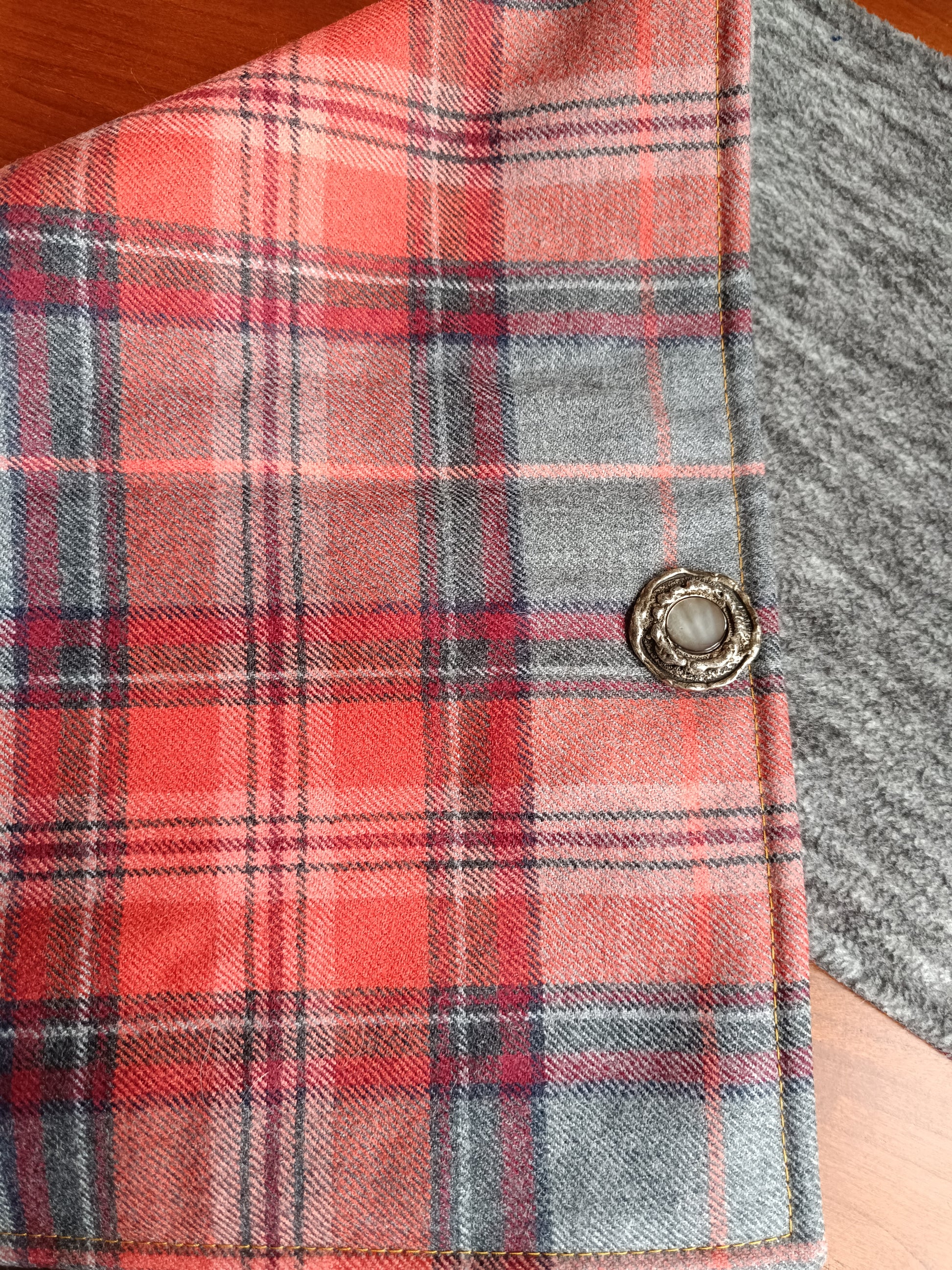 Tour de cou tartan laine doublé polaire - Bouton métal nacre et détail bronze