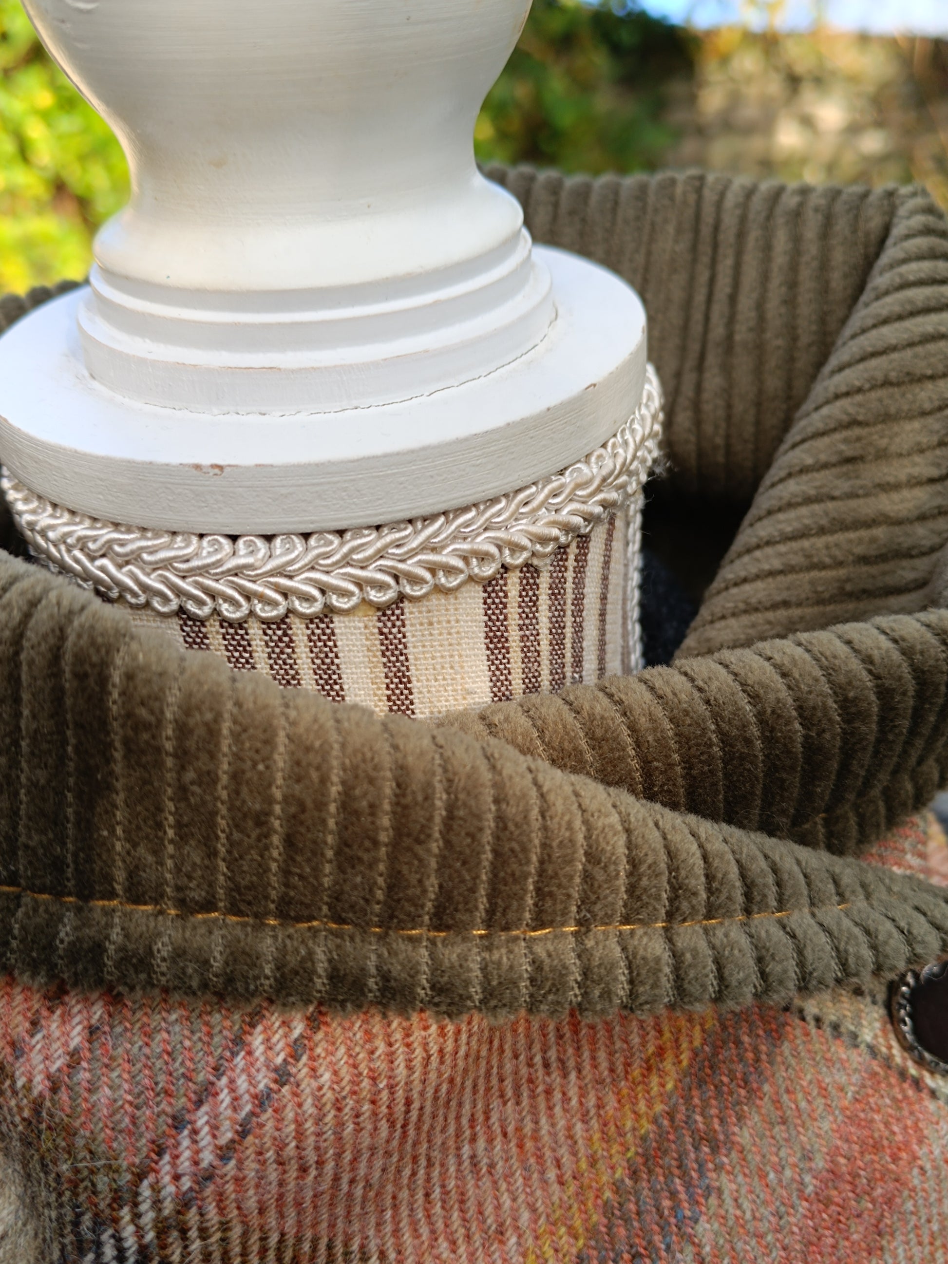 Tour de cou tartan lainage vintage doublé velours kaki artisanal français fait main - Accessoire textile style affirmé et caractère. Surpiqûres jaunes, bouton nacre irisée et rivet signature bronze fleurs de cerisier.