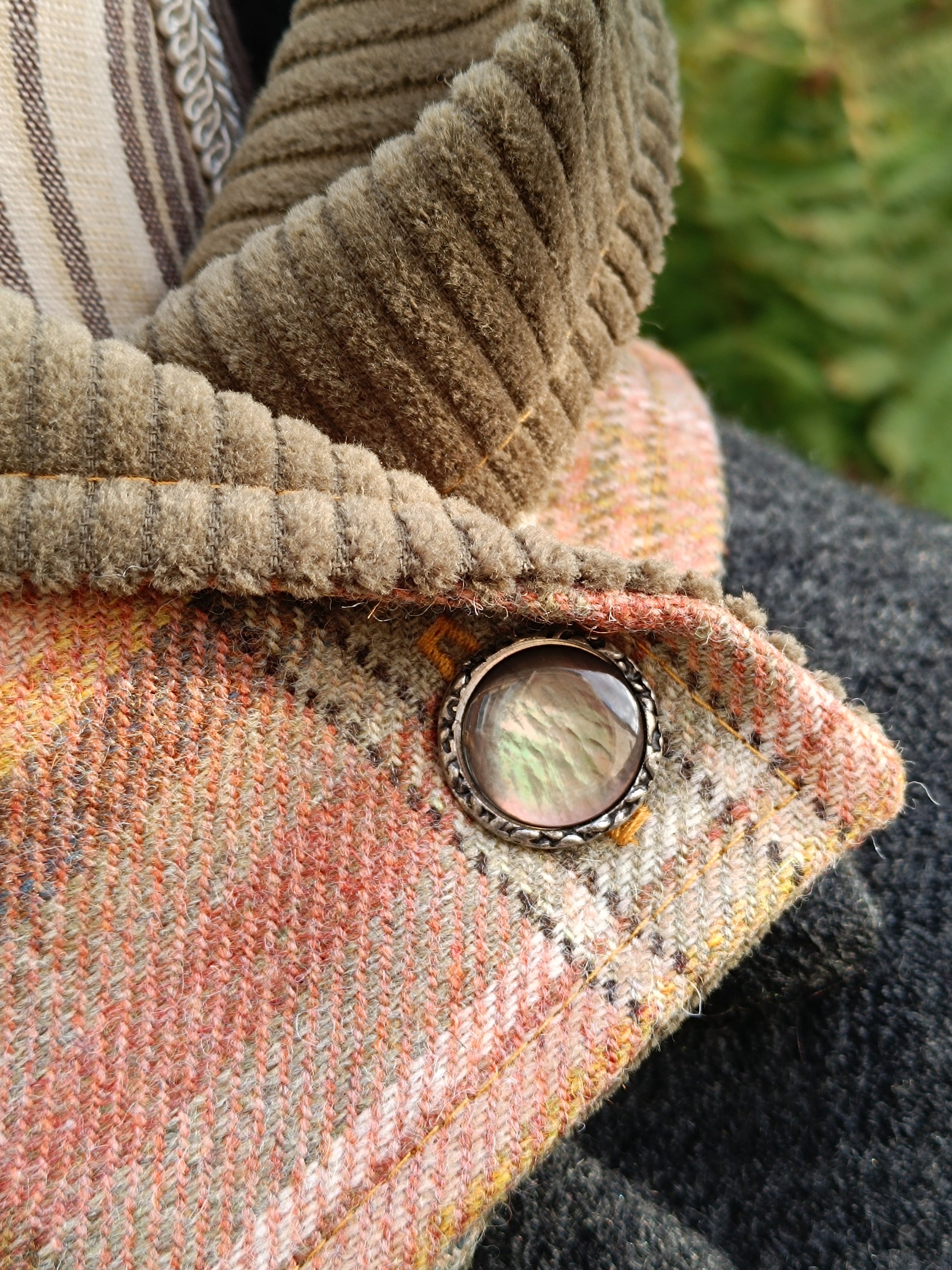 Ce tour de cou est réalisé à la main dans un lainage tartan vintage aux tons chaleureux et intemporels, doublé velours kaki pour un confort exceptionnel. La doublure douce et délicate est parfaite pour le cou. Le bouton de collection en nacre irisée, façon broche, permet plusieurs styles de port et peut également être porté comme bijou, ajoutant une touche unique à votre tenue. Les surpiqûres jaunes évoquent l'esprit libre et audacieux des Doc Martens et de la mode alternative. Chaque création textile est signée par mon petit rivet en métal bronze antique orné d'un dessin de fleurs de cerisier, ma signature distinctive. Cet accessoire allie style vintage et classique qui s'harmonise parfaitement avec des tenues plus modernes.